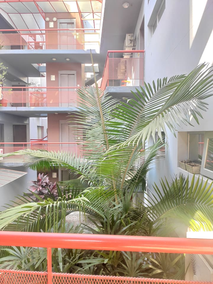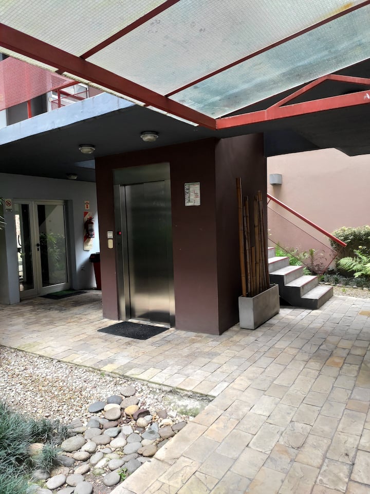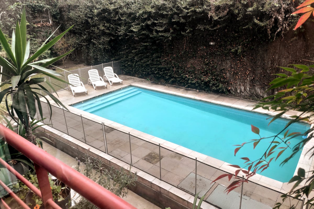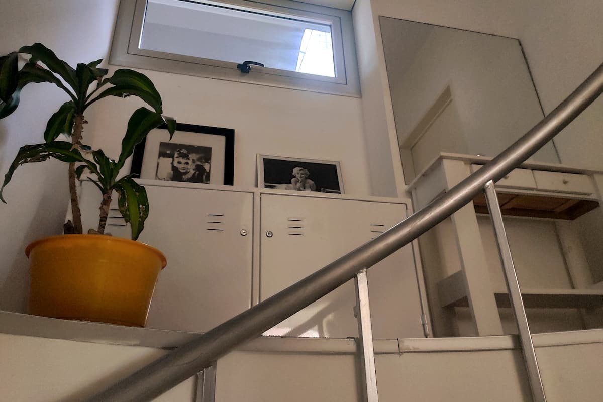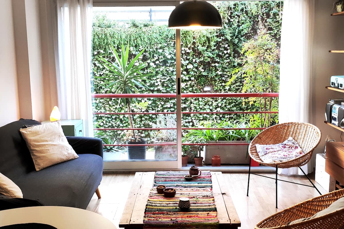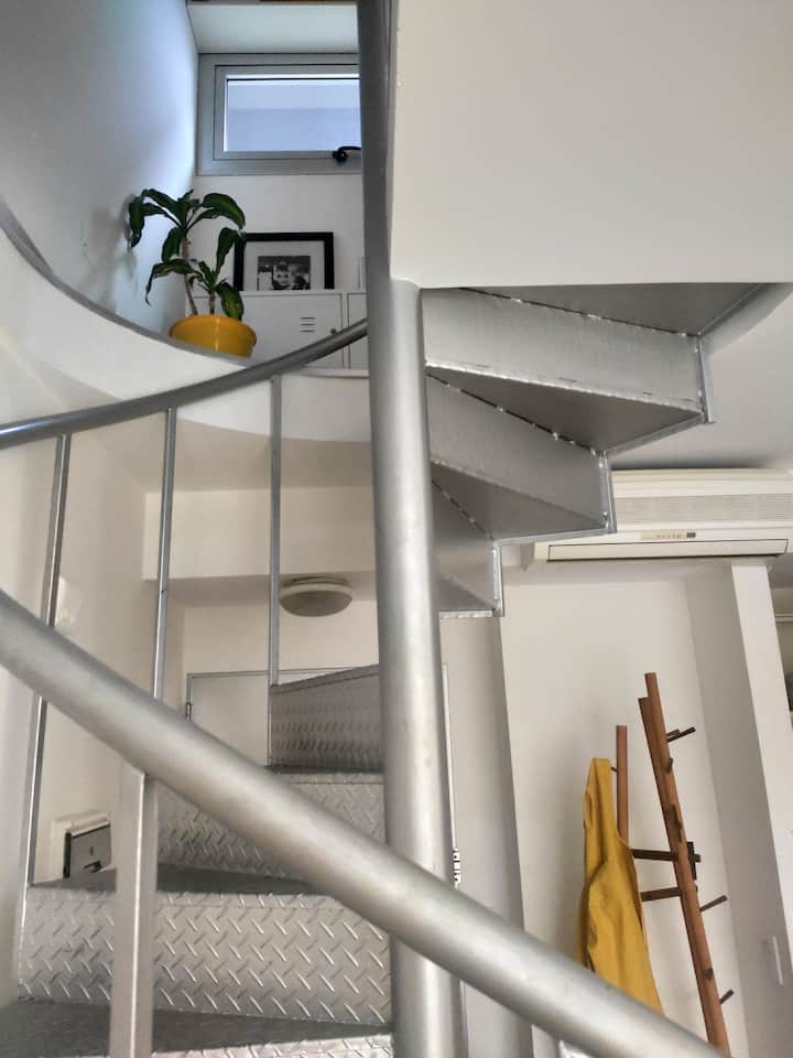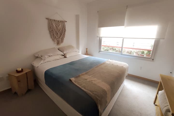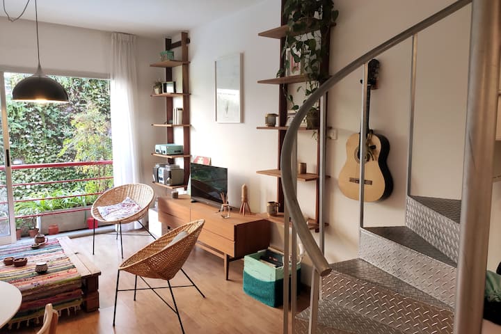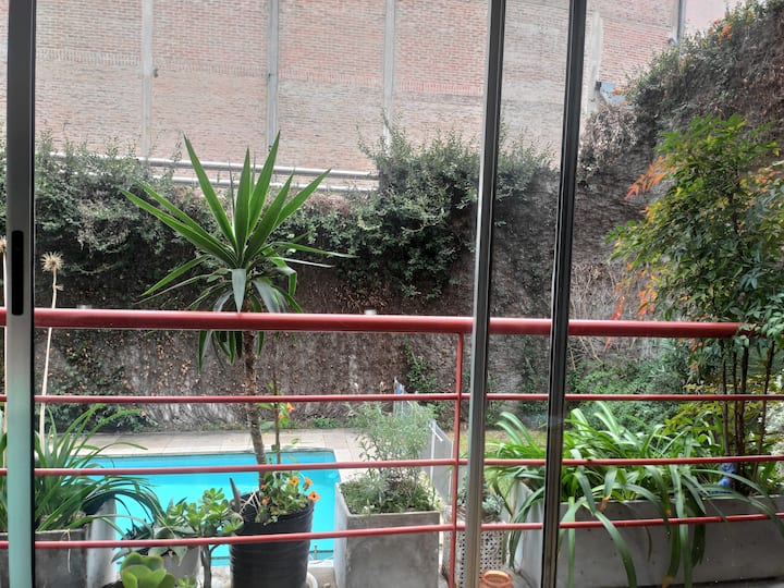 Duplex de 2 niveles de 43 m² en Colegiales. Se encuentra en el 1er piso y da al jardín del complejo, con buena iluminación y ambiente tranquilo. En la planta baja hay cocina integrada y living-comedor con ventana al jardín; una escalera interna lleva al dormitorio principal con vista al jardín, un área de descanso y baño. Incluye conexión a internet de 300 Mbps por WiFi o cable UTP, con sistemas de respaldo, y el edificio cuenta con jardín grande, lavandería, pileta y parrilla.
