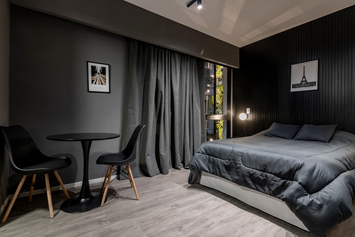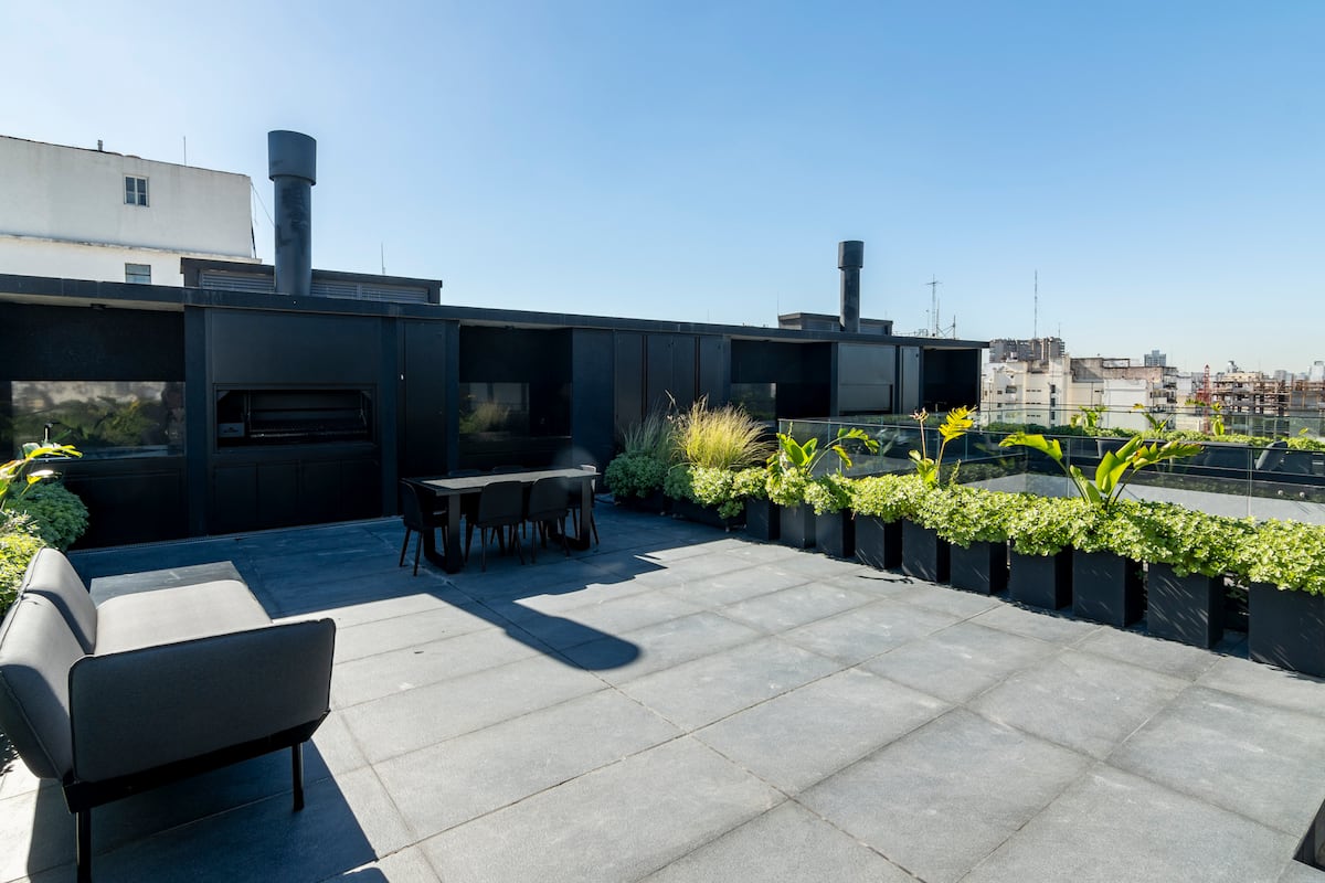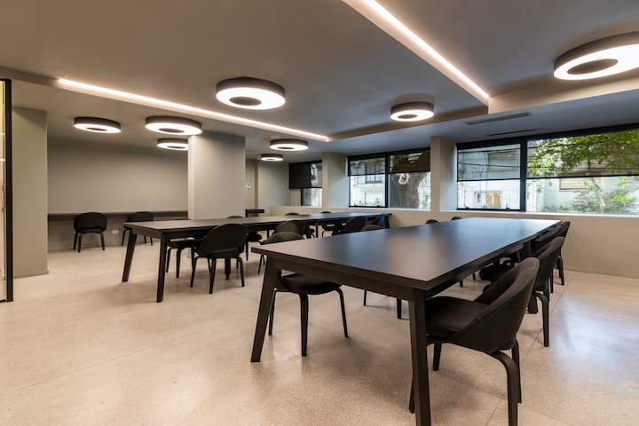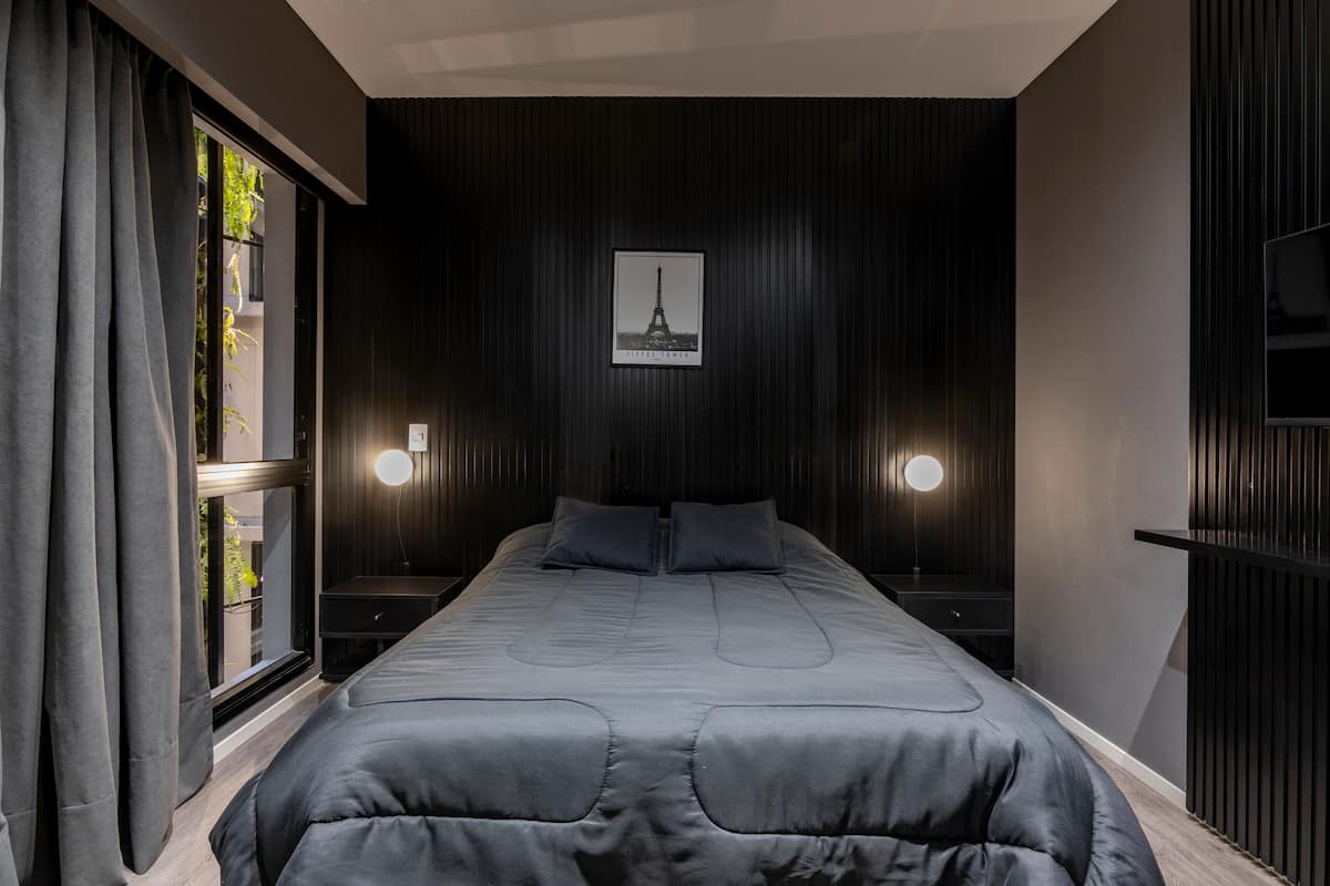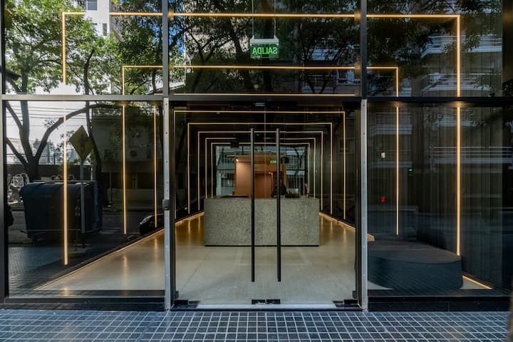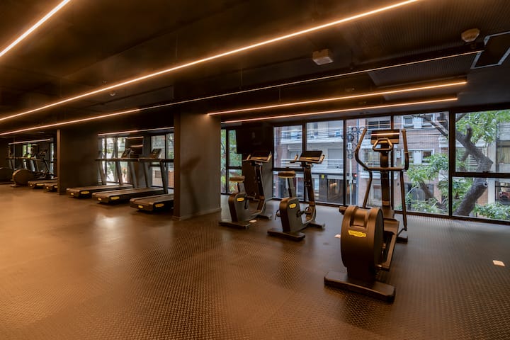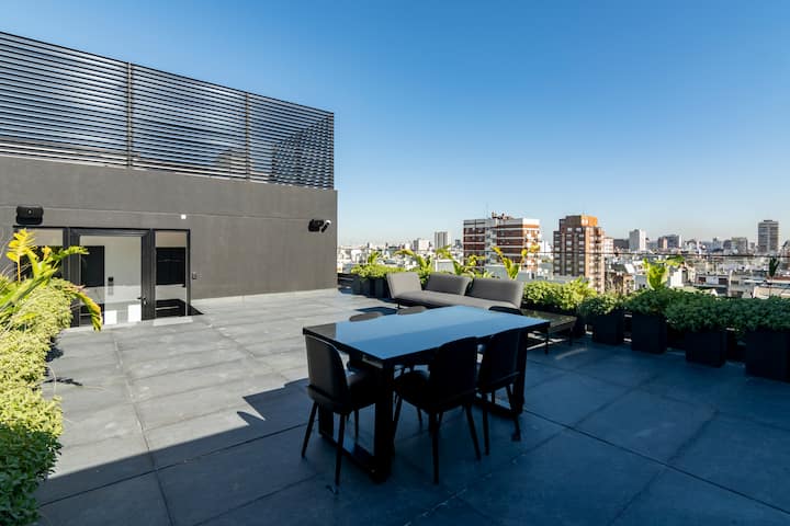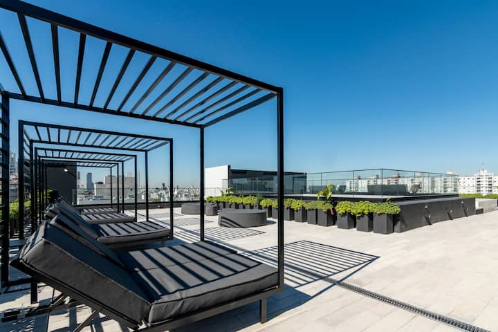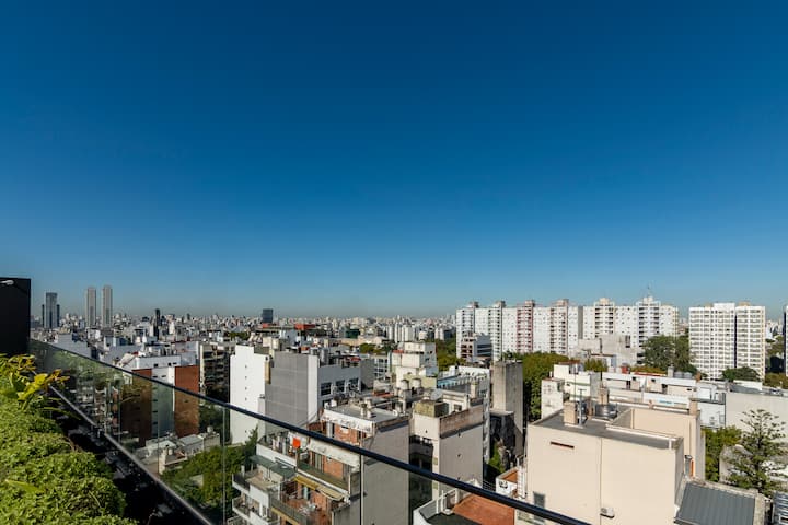 Departamento tipo monoambiente en Colegiales. Incluye TV, Wi‑Fi, cerradura digital, toallas y ropa de cama, además de cafetera, tostadora, pava eléctrica y minibar. Cuenta con horno eléctrico. El edificio dispone de seguridad 24 horas, gimnasio (500 m²), pileta climatizada y pileta al aire libre, solárium, parrillas, SUM, espacio de masajes y espacio de yoga.
