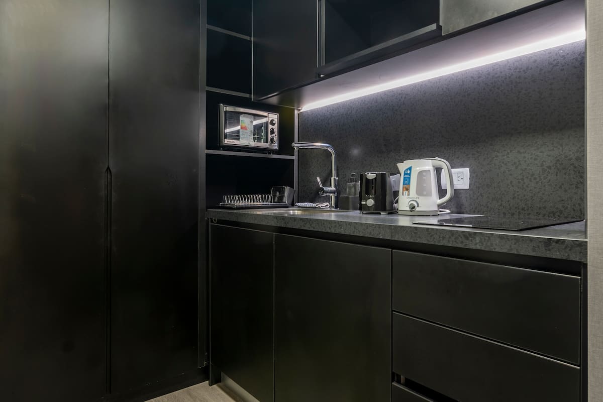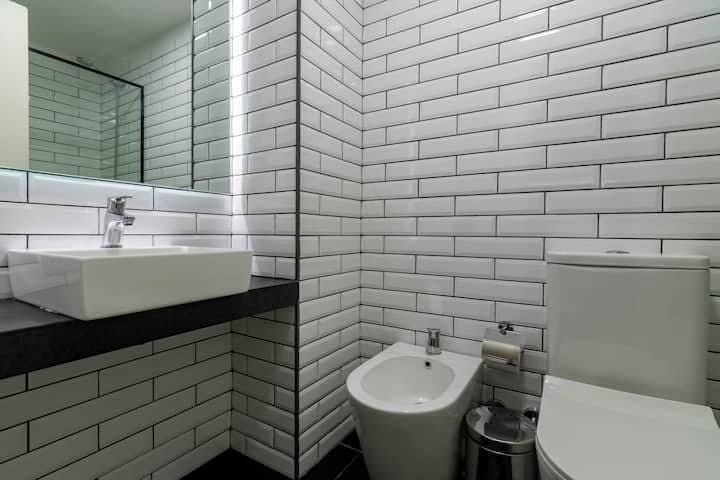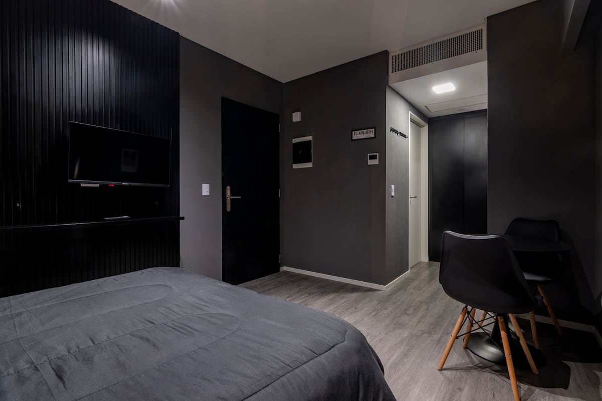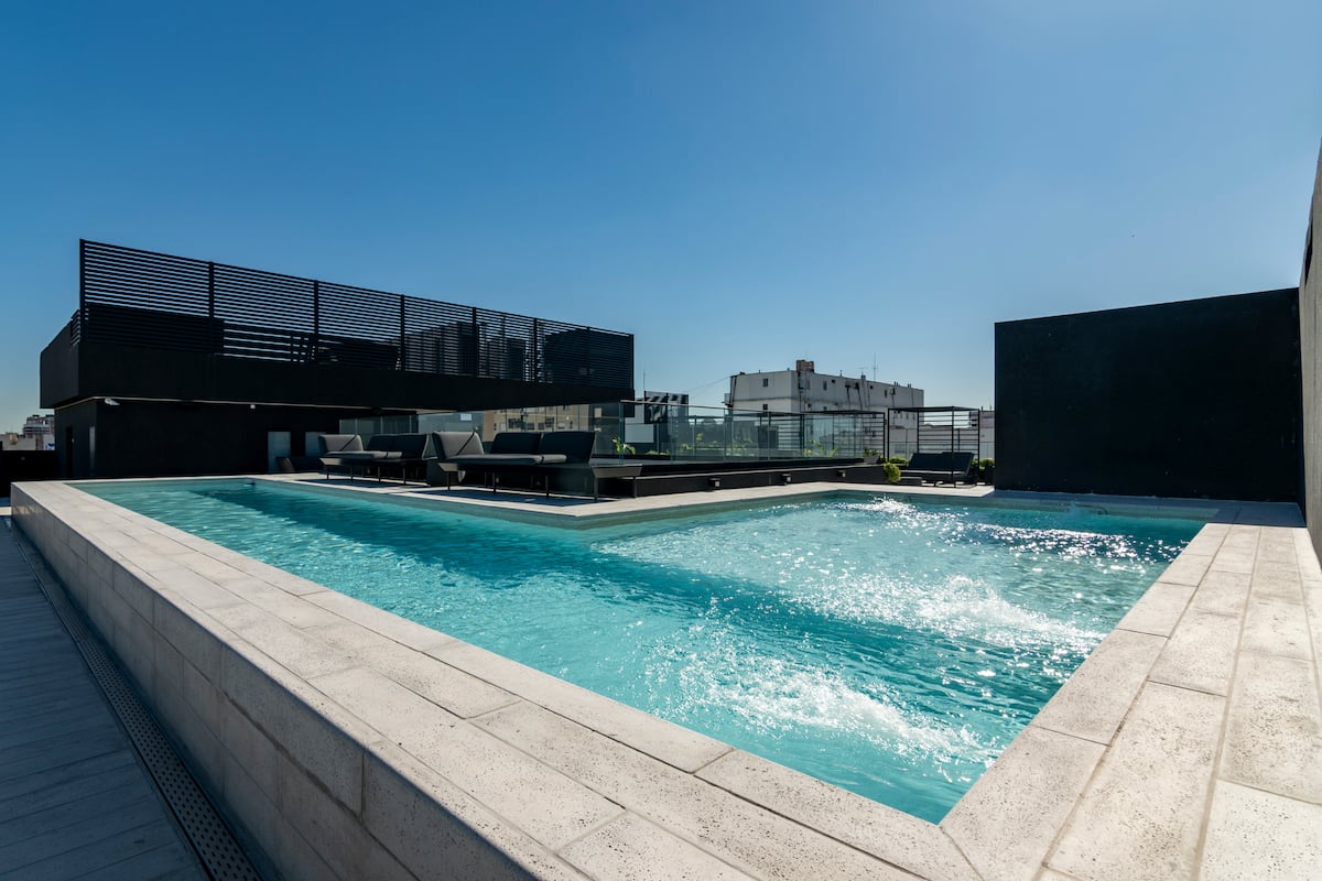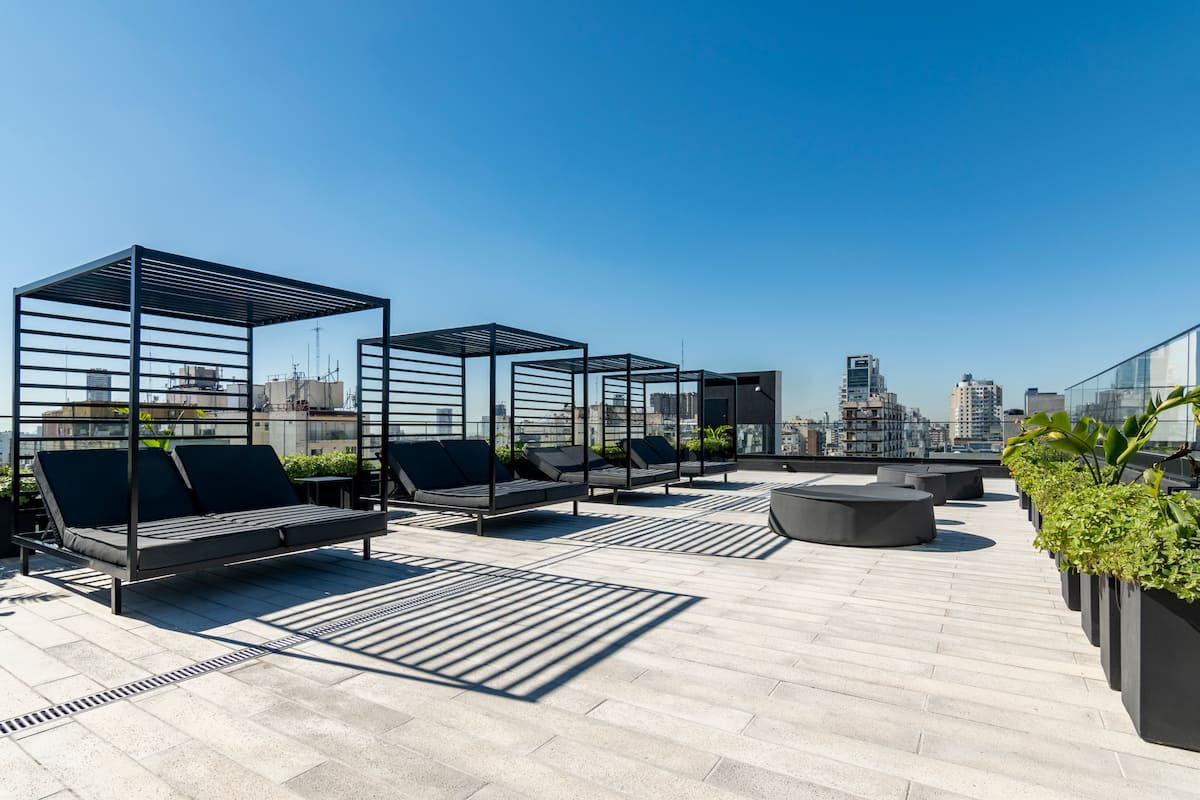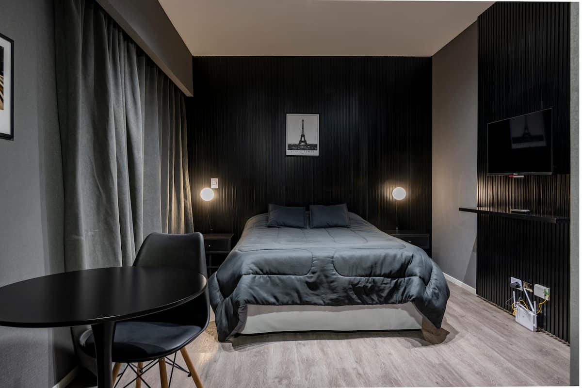 Departamento tipo monoambiente en Colegiales. Incluye TV, Wi‑Fi, cerradura digital, toallas y ropa de cama, además de cafetera, tostadora, pava eléctrica y minibar. Cuenta con horno eléctrico. El edificio dispone de seguridad 24 horas, gimnasio (500 m²), pileta climatizada y pileta al aire libre, solárium, parrillas, SUM, espacio de masajes y espacio de yoga.