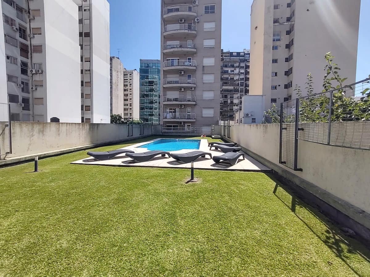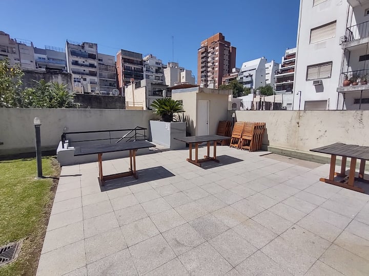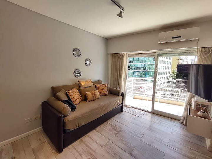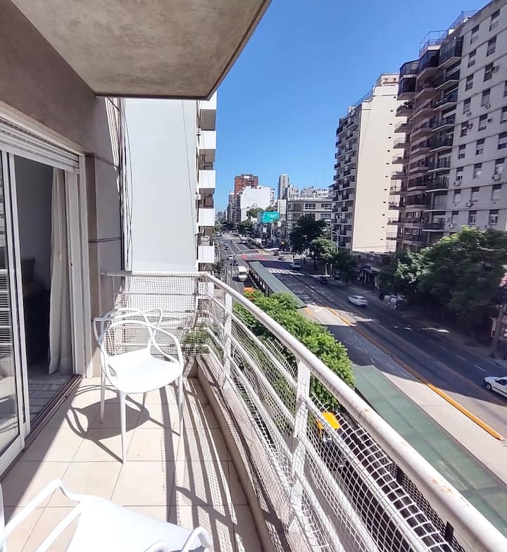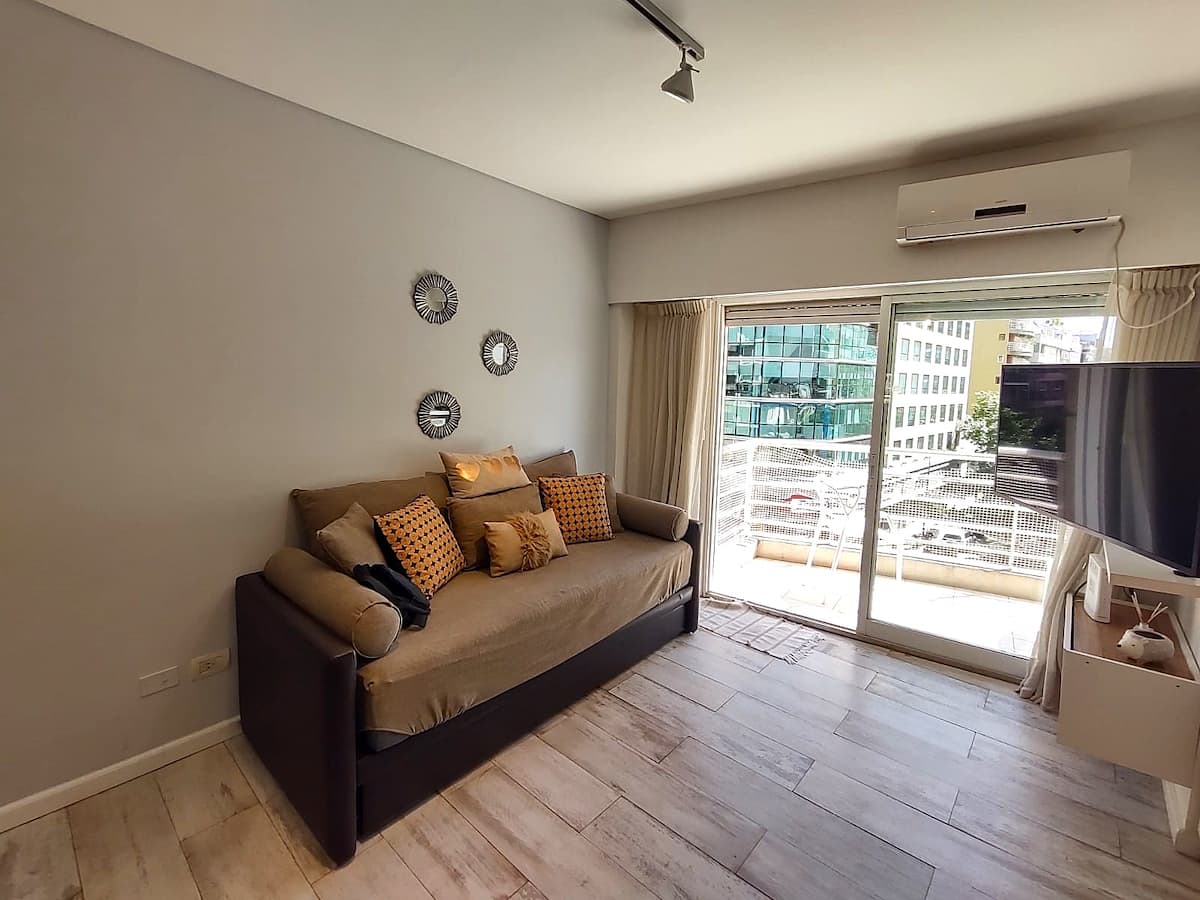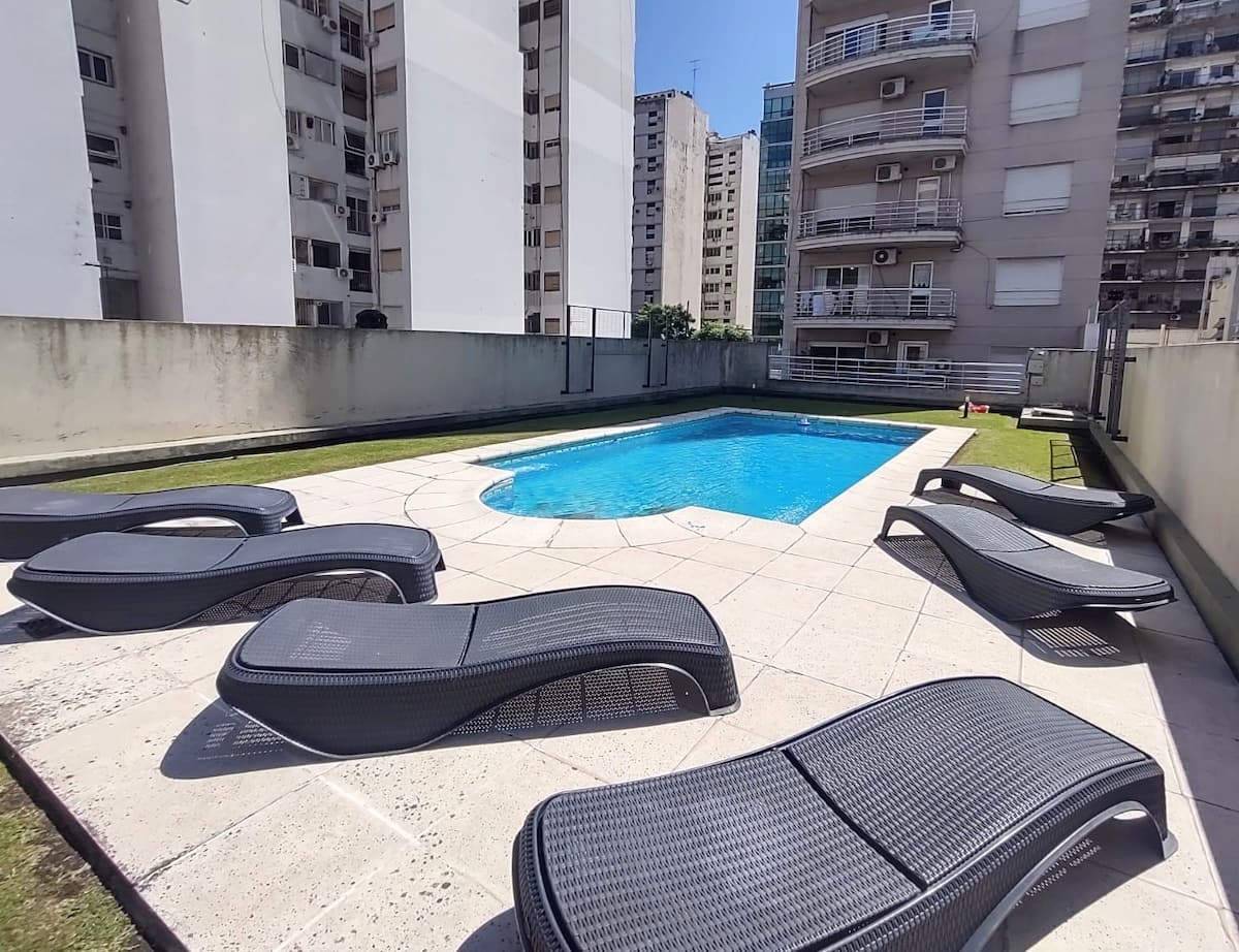 Monoambiente con balcón y vista abierta en Colegiales. Incluye cocina con horno, microondas, pava eléctrica, heladera y smart TV. Cuenta con calefacción central y WiFi de alta velocidad. El edificio dispone de pileta, parrilla, solárium y sector de laundry, además de servicio de limpieza durante la estadía.