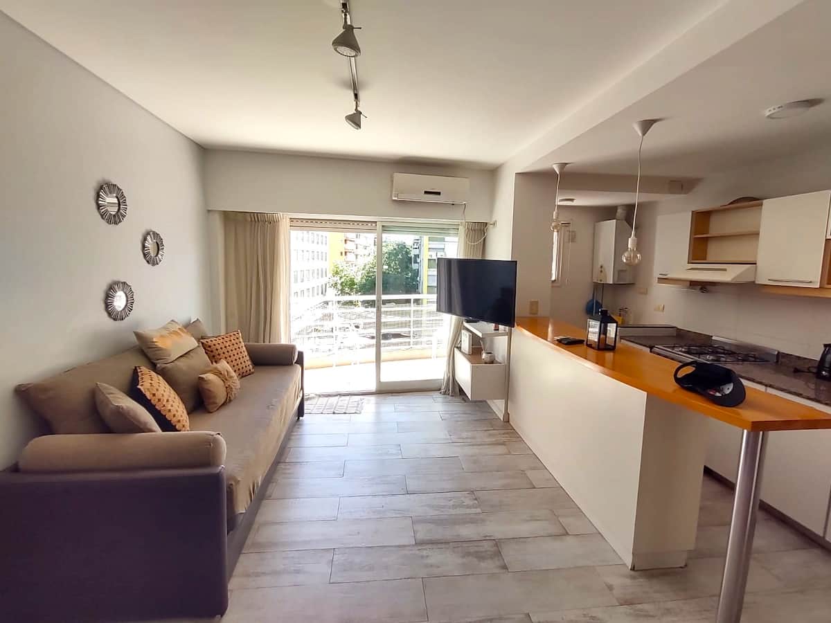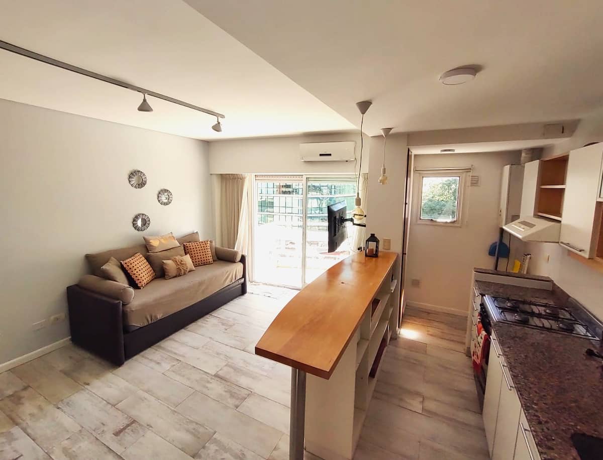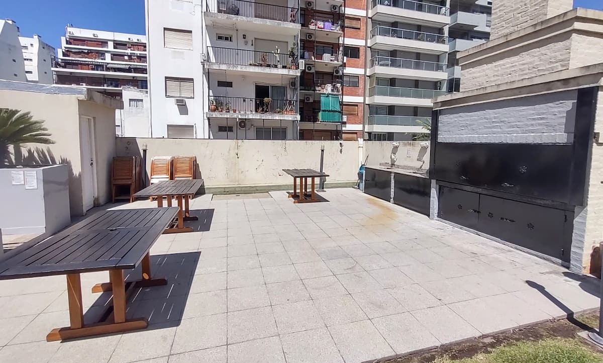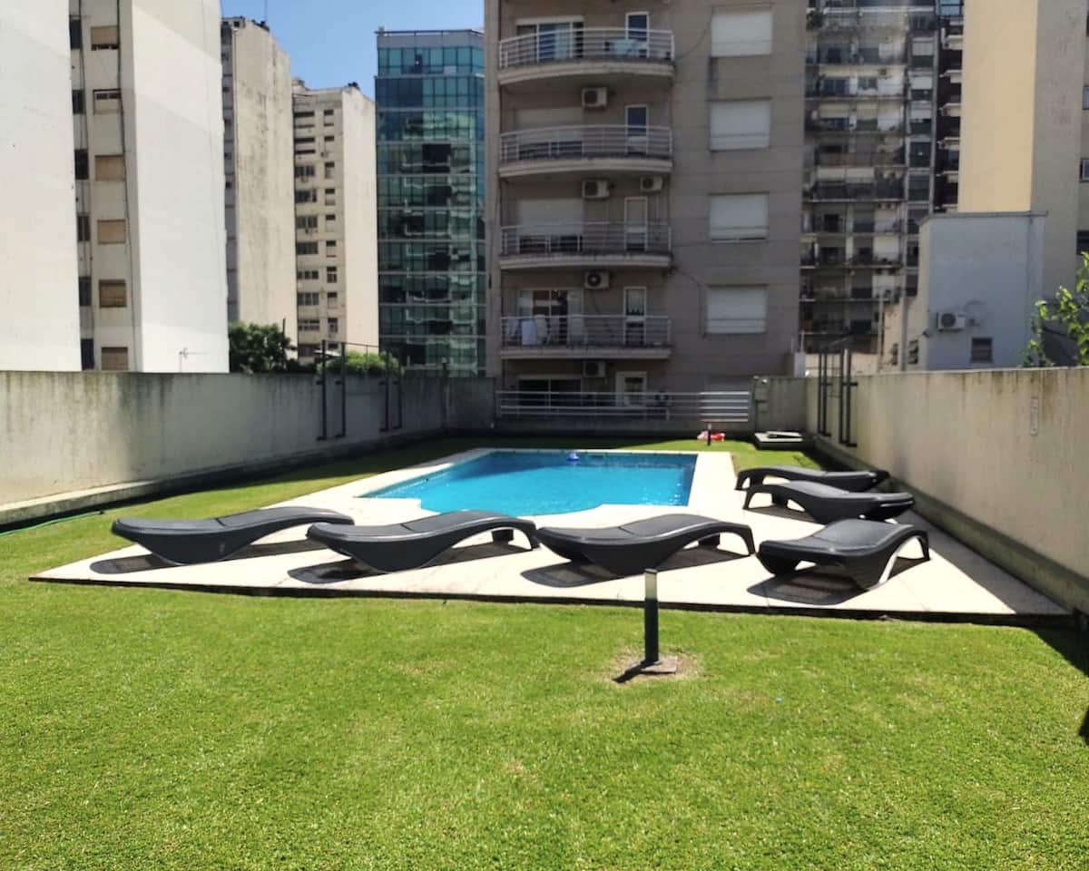 Monoambiente con balcón y vista abierta en Colegiales. Incluye cocina con horno, microondas, pava eléctrica, heladera y smart TV. Cuenta con calefacción central y WiFi de alta velocidad. El edificio dispone de pileta, parrilla, solárium y sector de laundry, además de servicio de limpieza durante la estadía.