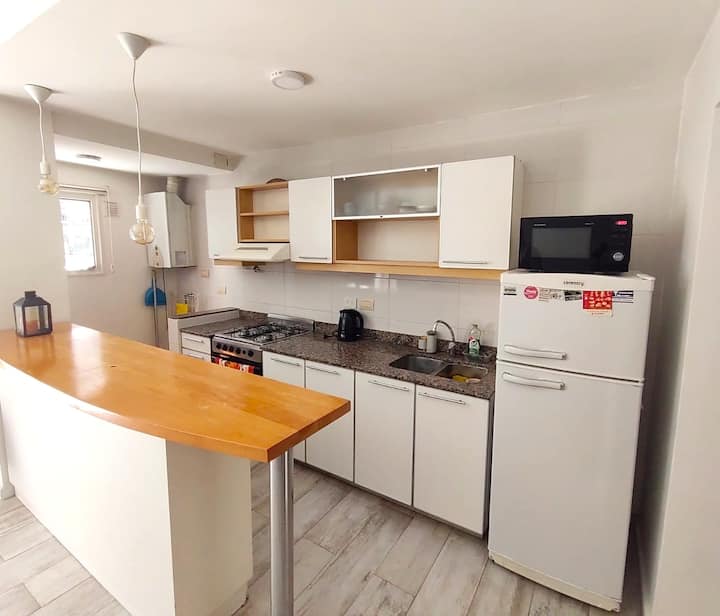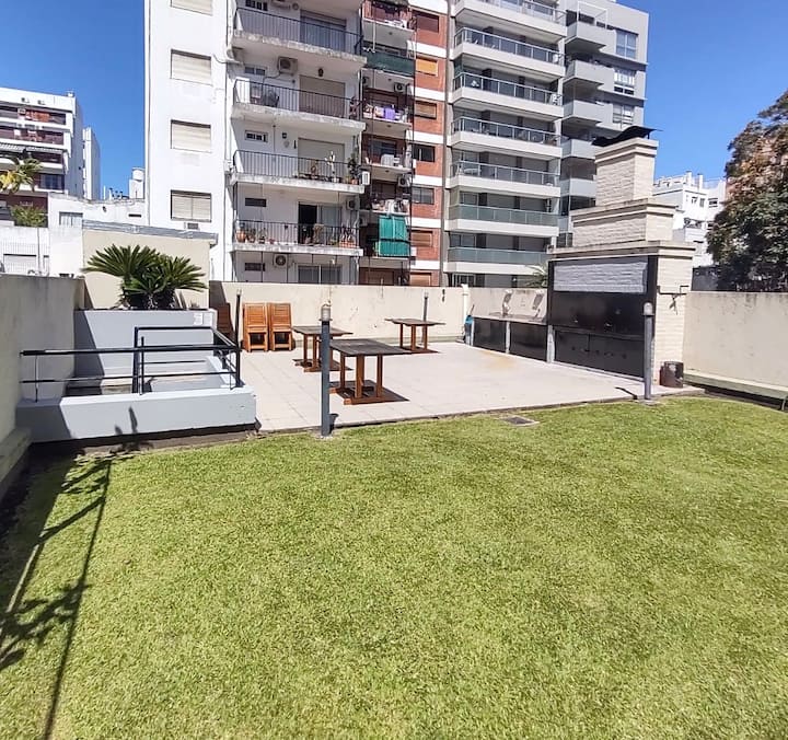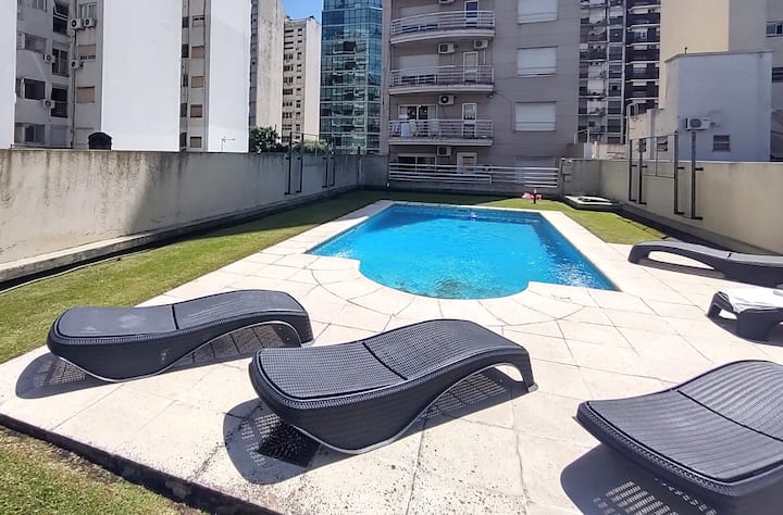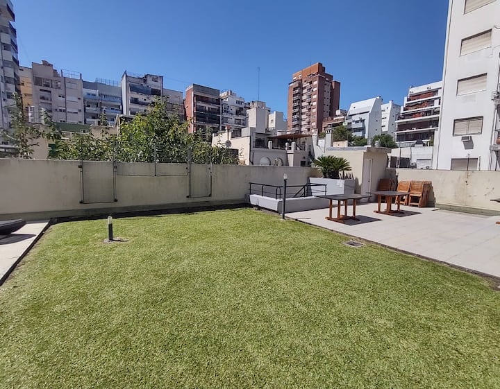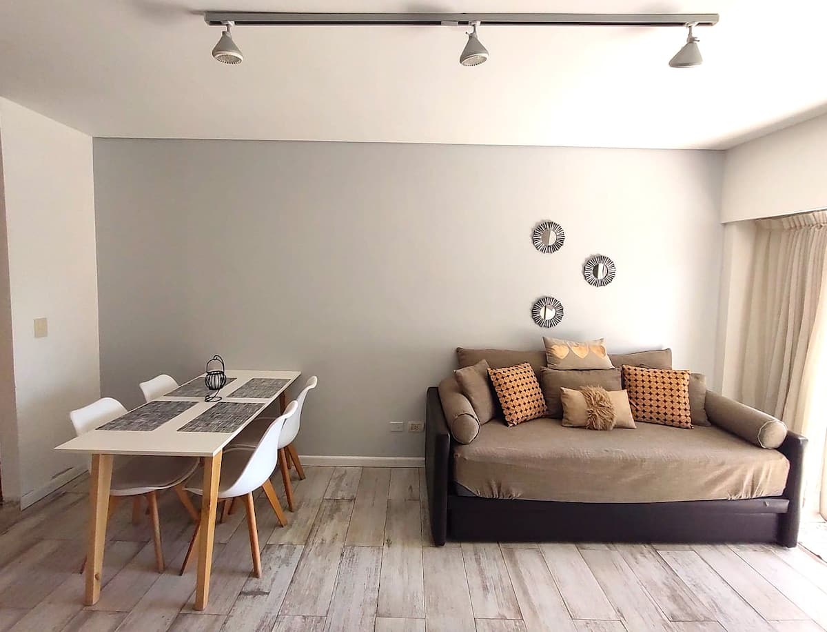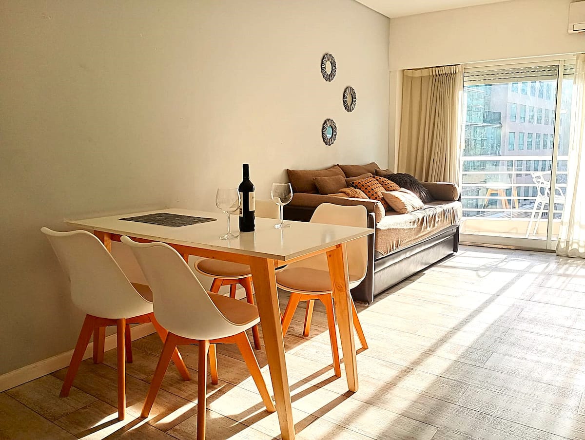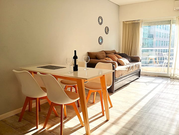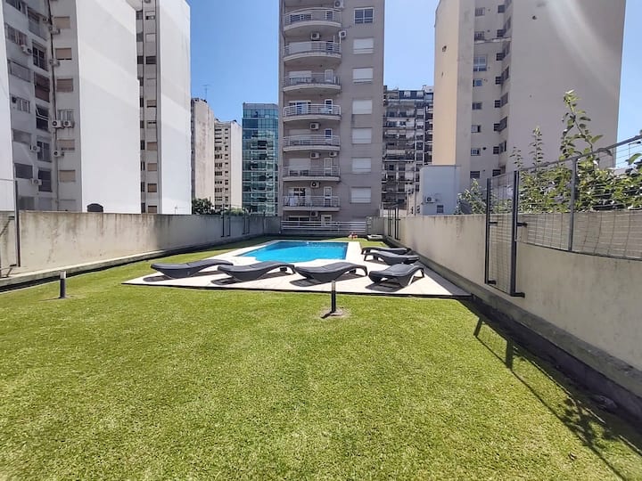 Monoambiente con balcón y vista abierta en Colegiales. Incluye cocina con horno, microondas, pava eléctrica, heladera y smart TV. Cuenta con calefacción central y WiFi de alta velocidad. El edificio dispone de pileta, parrilla, solárium y sector de laundry, además de servicio de limpieza durante la estadía.