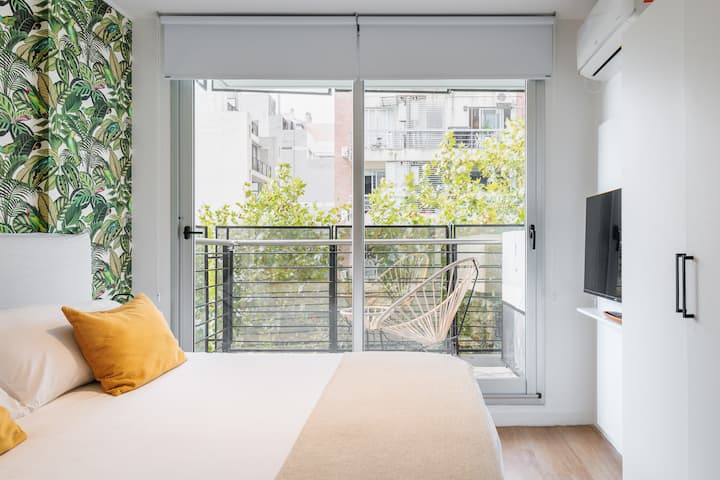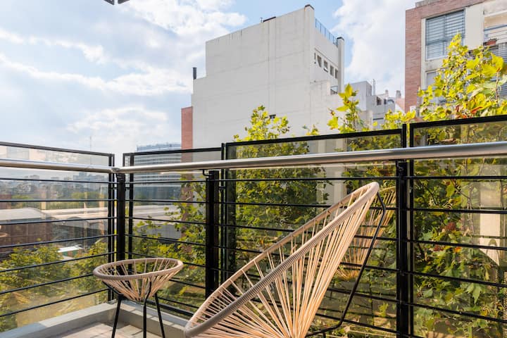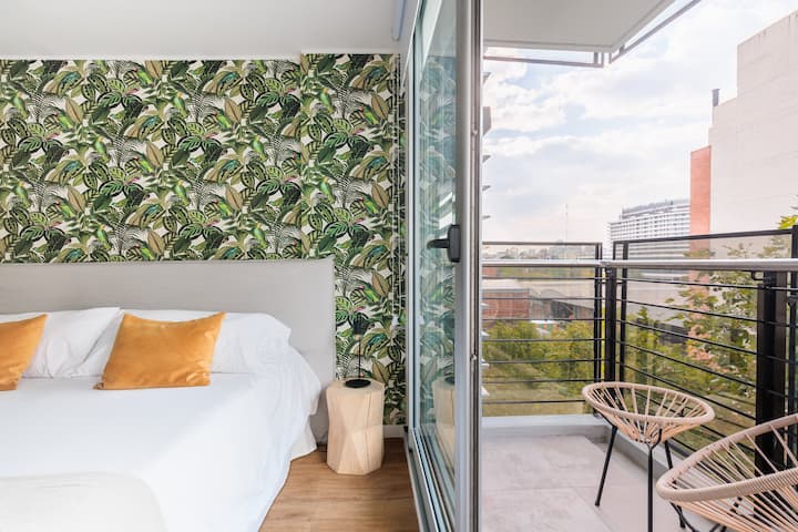 Квартира в Colegiales, с 1 спальней. В описании указаны двуспальная кровать размера King и частный балкон. Сообщается о зоне с бассейном и грилем (BBQ), а также о тренажёрном зале. Упоминаются коворкинг и панорамный вид.