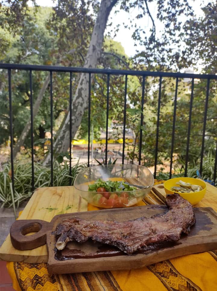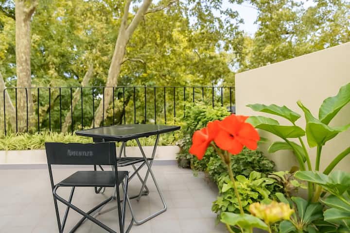 One-bedroom apartment in Colegiales. The layout includes a double bedroom with a large closet, plus a living room with a three-seat armchair. The kitchen and bathroom were recently renovated. A large terrace offers a view of the square and includes a BBQ, and there is also a balcony overlooking trees.