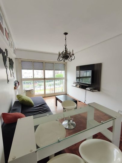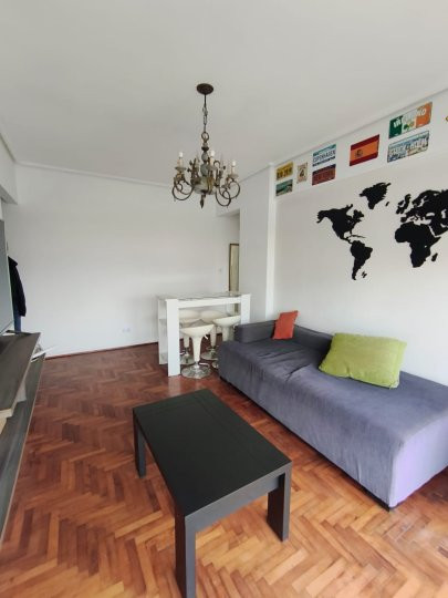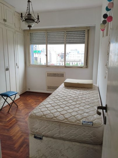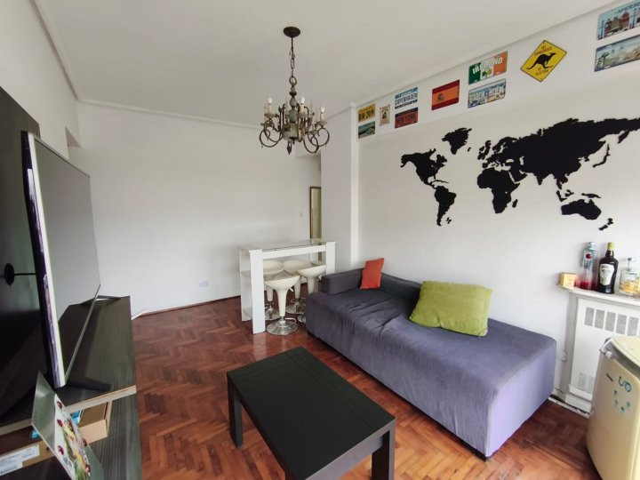 Departamento de 2 ambientes de 44 m², al frente, en 6º piso, con vistas a la Av. 9 de Julio. Cocina y baño con pisos de mosaico; dormitorio y living-comedor con parquet de roble. Dormitorio con placares amplios y living-comedor con aire acondicionado portátil. Todos los ambientes dan al frente y cuentan con muebles bajo y sobre mesada en la cocina. Monto de ingreso: 1 mes de depósito, con garante propietario o seguro de alquiler, demostración de ingresos y gastos de certificados en caso de garan