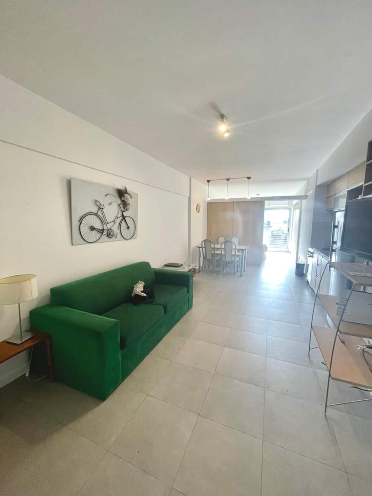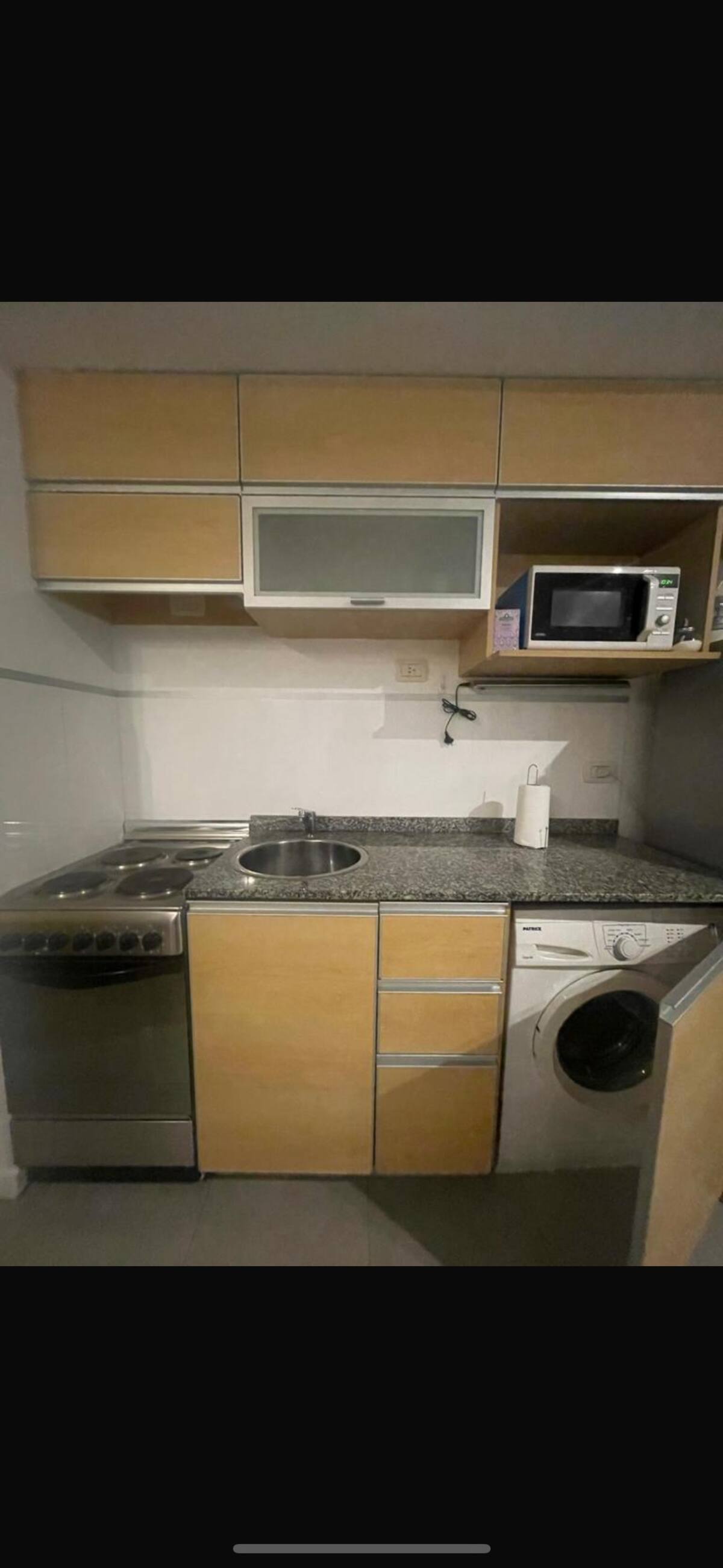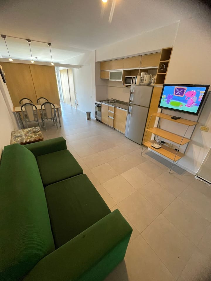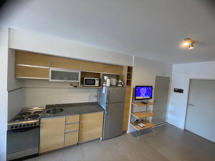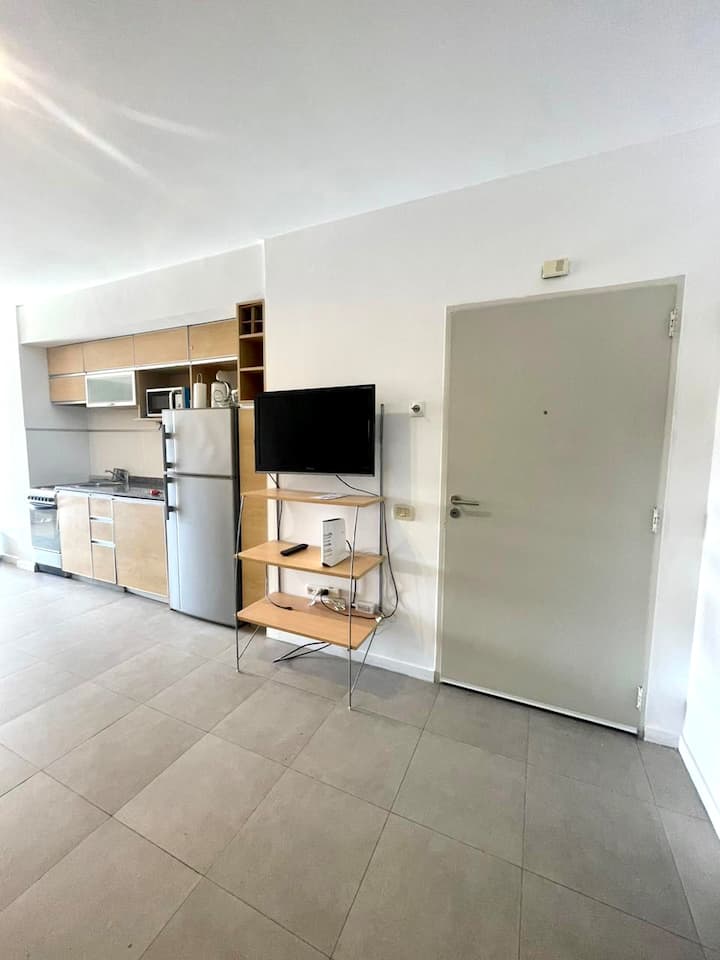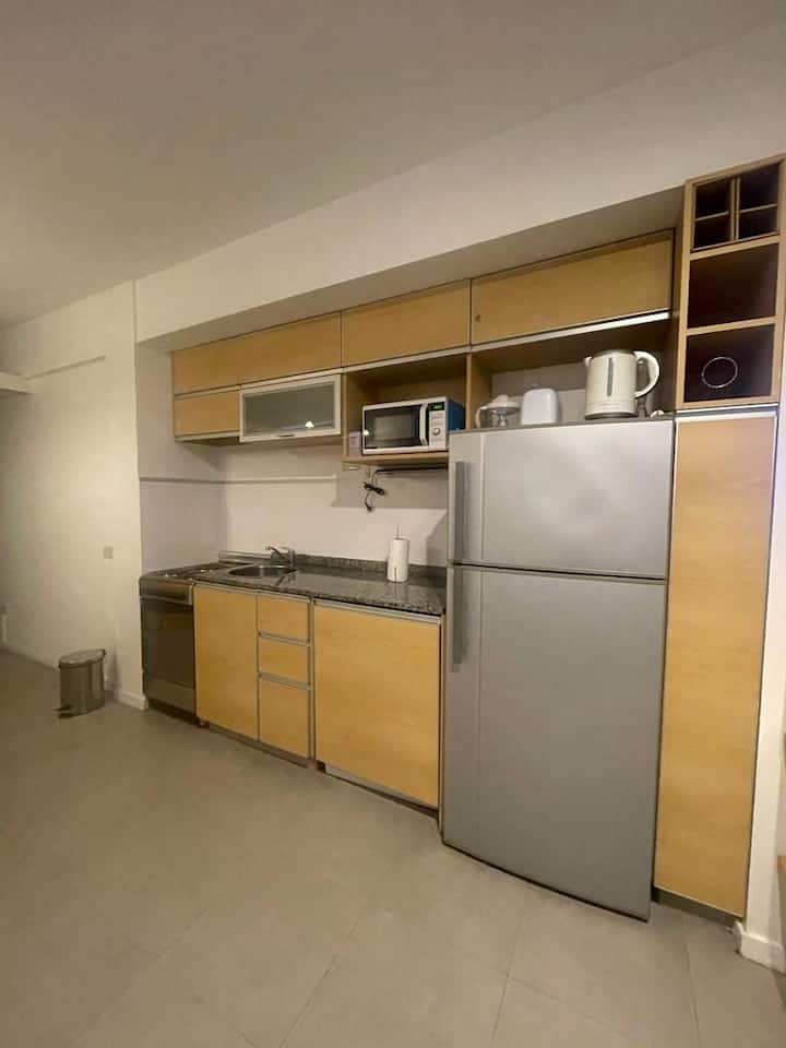 Monoambiente de estilo moderno en Av. San Juan, en Constitución, con balcón. Cuenta con un living con sofá cama, cocina completa con horno y utensilios. El baño tiene espejo grande; el dormitorio con cama de 1 plaza tipo queen está separado por una puerta corrediza.