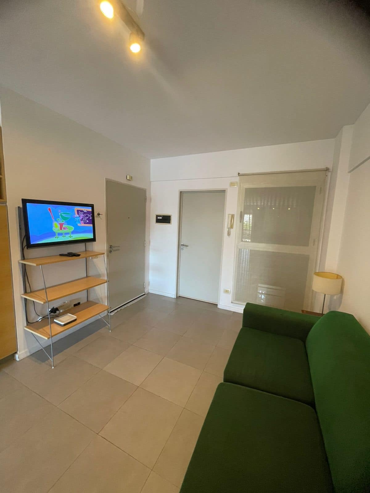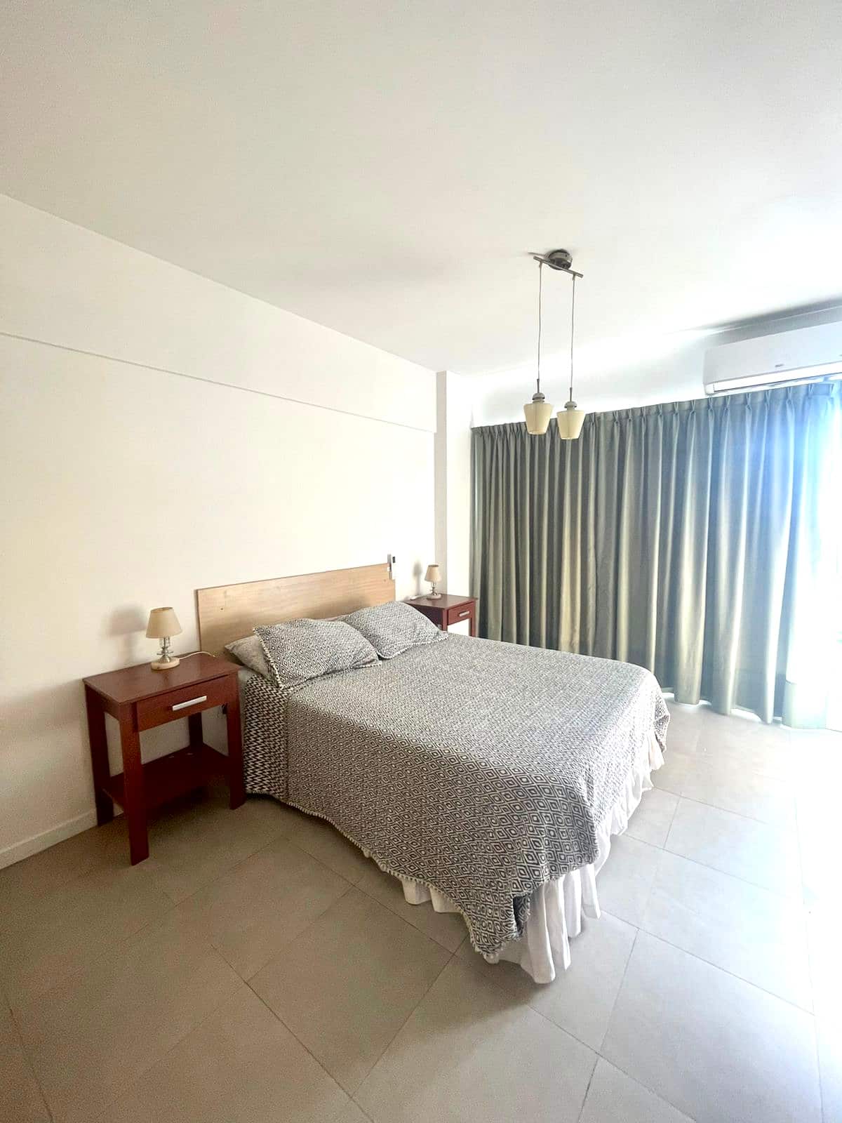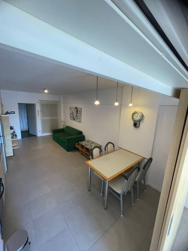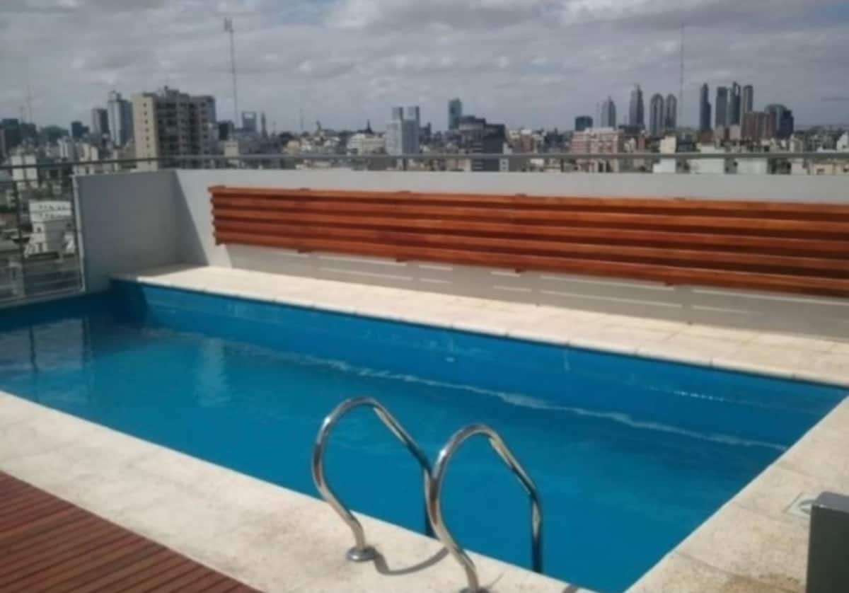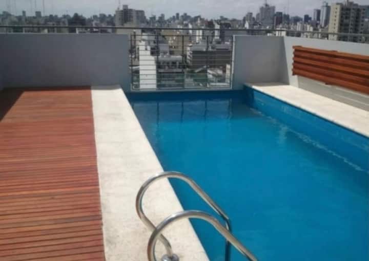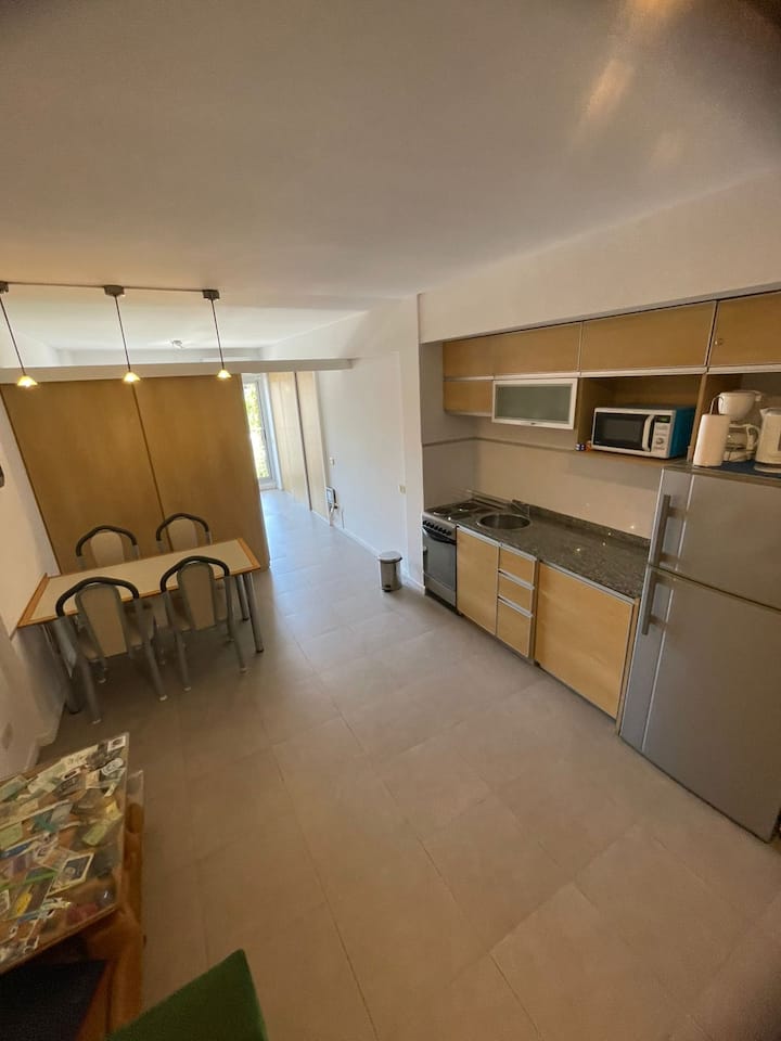 Monoambiente de estilo moderno en Av. San Juan, en Constitución, con balcón. Cuenta con un living con sofá cama, cocina completa con horno y utensilios. El baño tiene espejo grande; el dormitorio con cama de 1 plaza tipo queen está separado por una puerta corrediza.