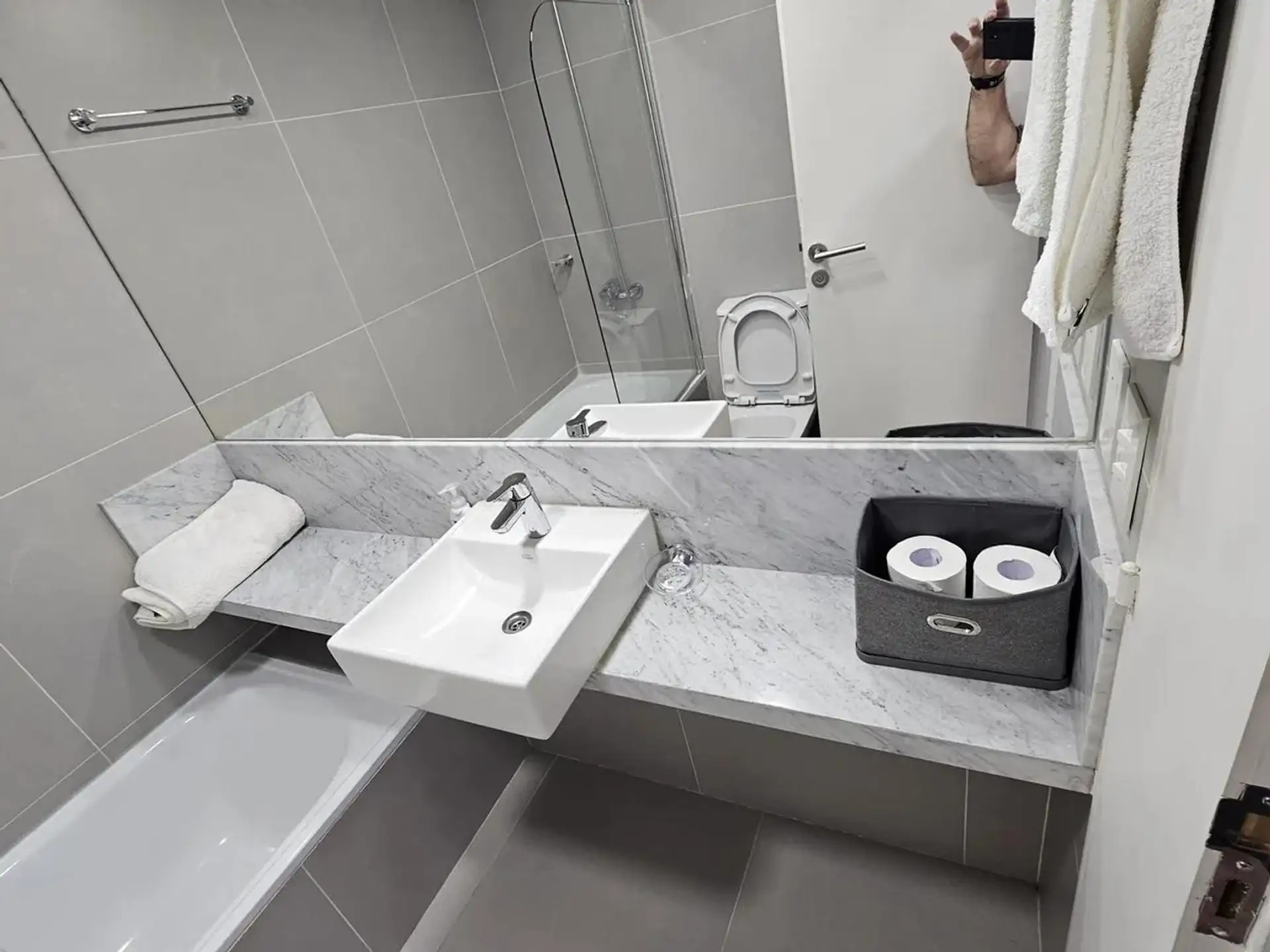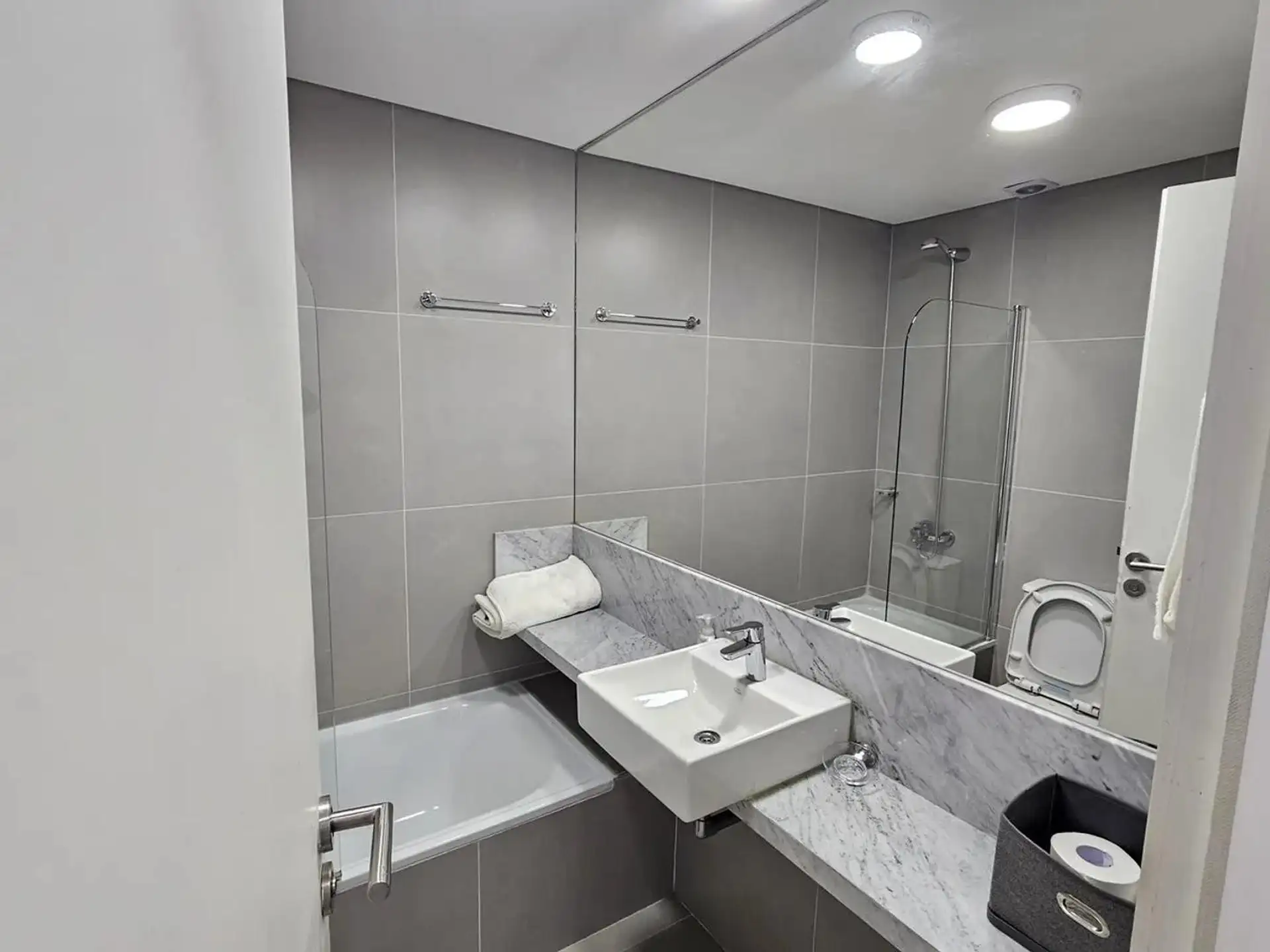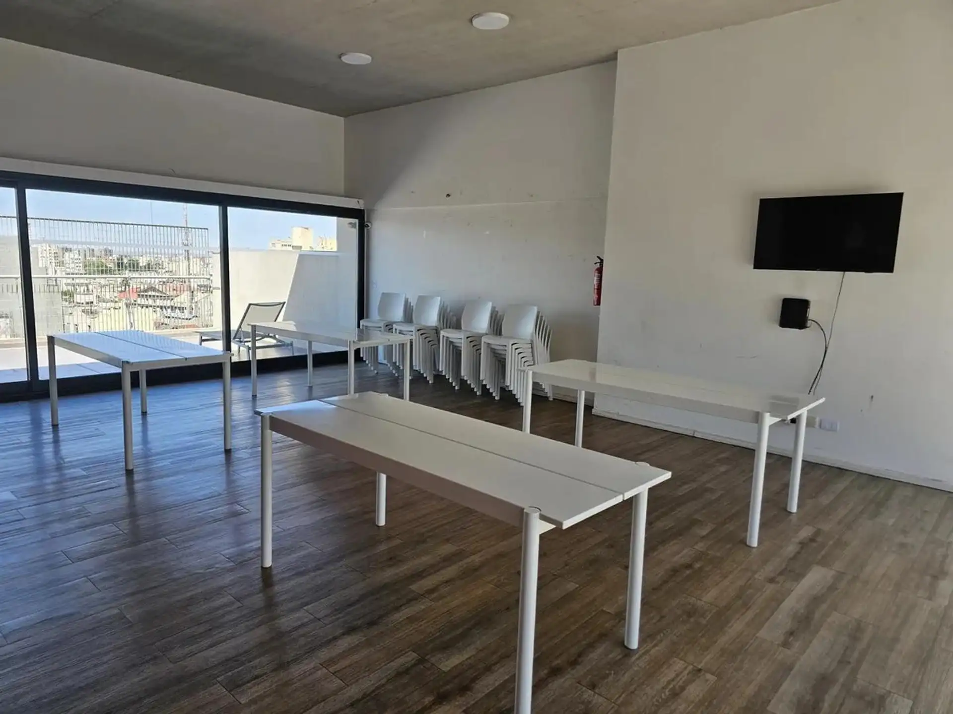 Departamento de 2 ambientes de 55 m² en San Telmo, con balcón al frente. Se ingresa con cerradura digital y el living-comedor tiene salida al balcón. Cuenta con aire acondicionado frío/calor en todos los ambientes, cocina integrada con horno eléctrico y electrodomésticos Whirlpool (heladera y microondas), dormitorio con 2 camas individuales unibles y placard empotrado, y baño completo. El edificio ofrece seguridad monitoreada 24 hs, solarium, SUM, parrilla y laundry; la cochera cubierta es opcio