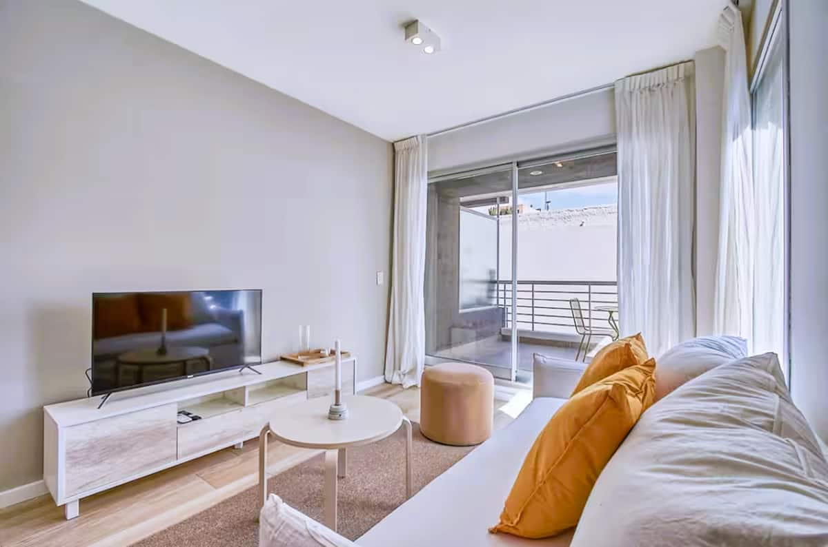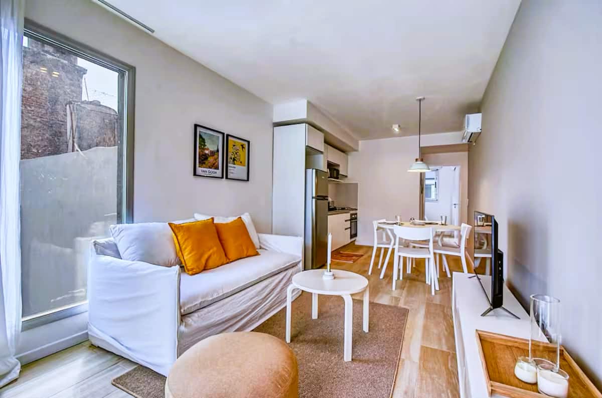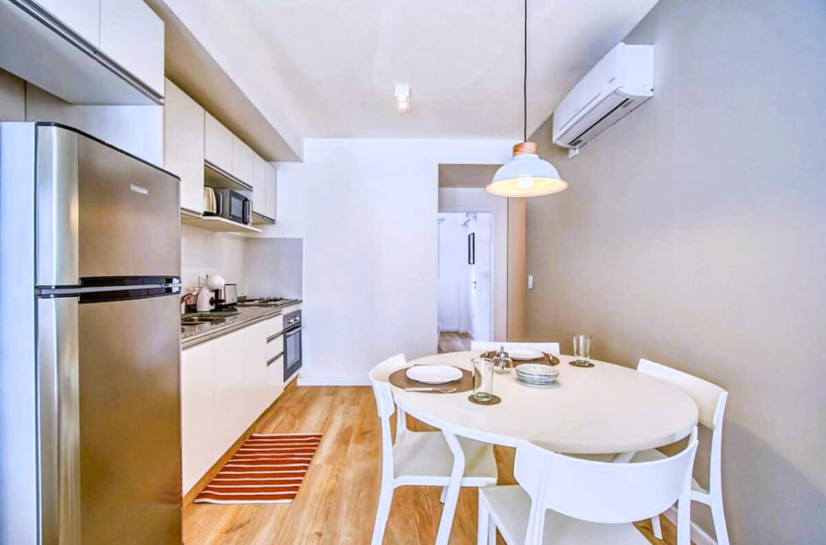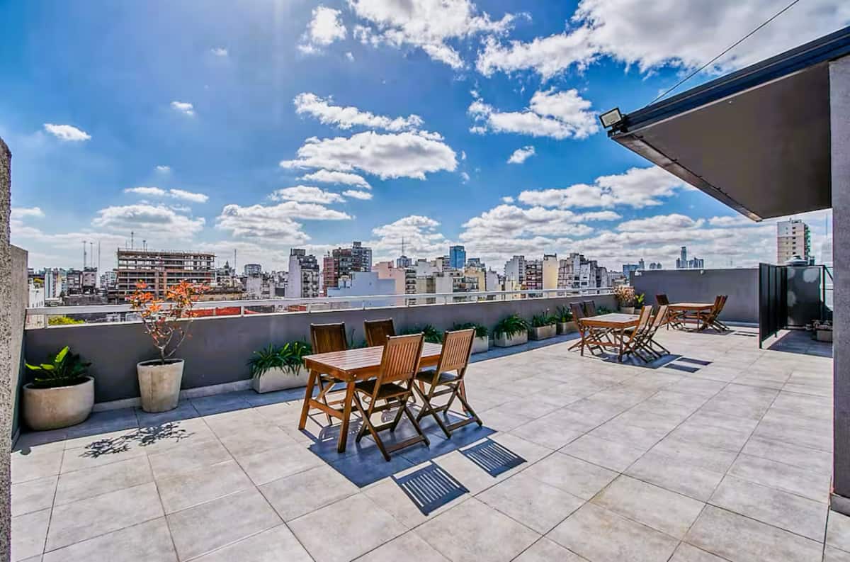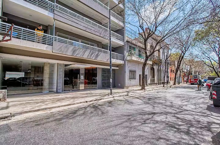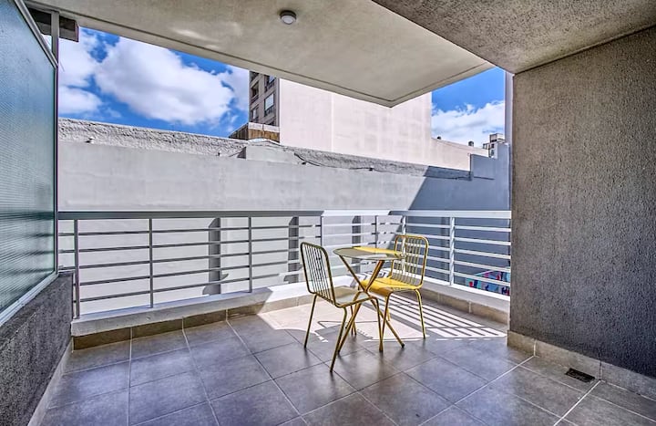 Departamento de 2 ambientes en Presidente Luis Sáenz Peña, en Monserrat, con balcón amplio. Cuenta con dormitorio privado, living con sofá, cocina totalmente equipada y baño completo. Incluye aire acondicionado, WiFi y TV. El edificio dispone de pileta, parrillas, gimnasio compartido y laundry, con ascensor y calefacción. El ingreso y egreso se realiza en horarios establecidos por la reserva; el estacionamiento en la vía pública es gratuito y el edificio no cuenta con cochera propia.