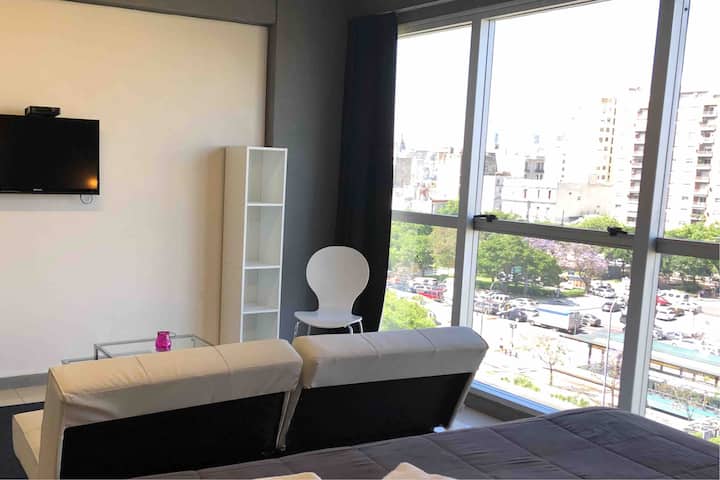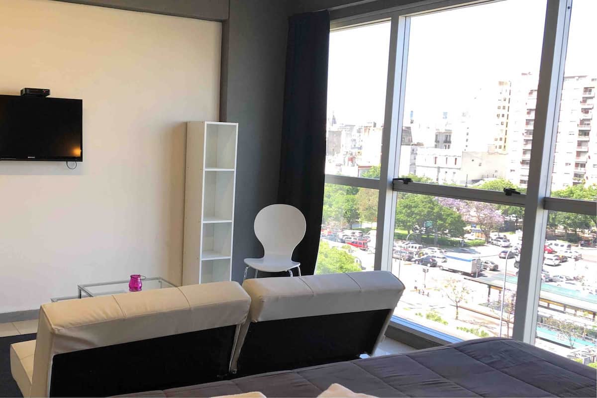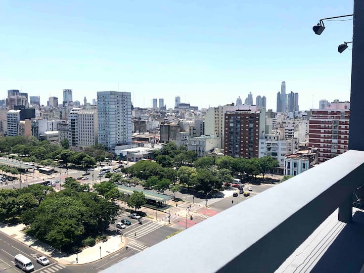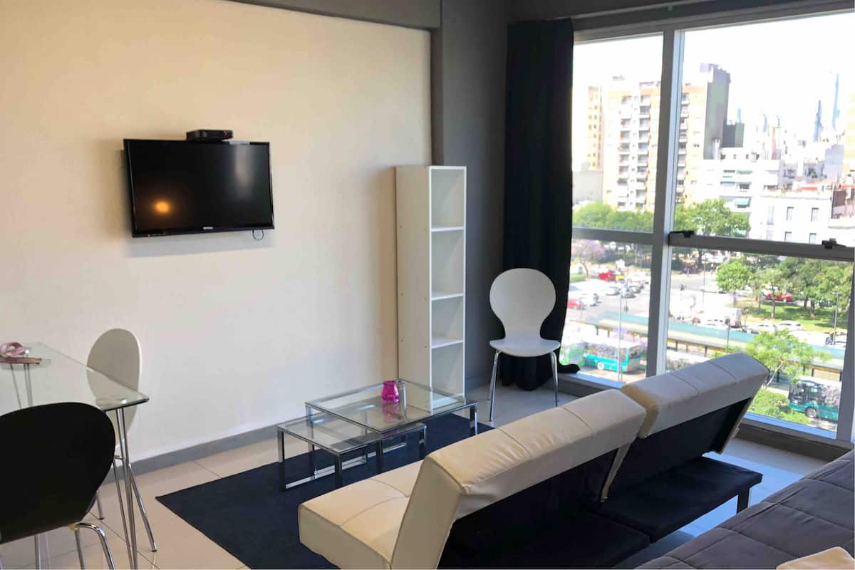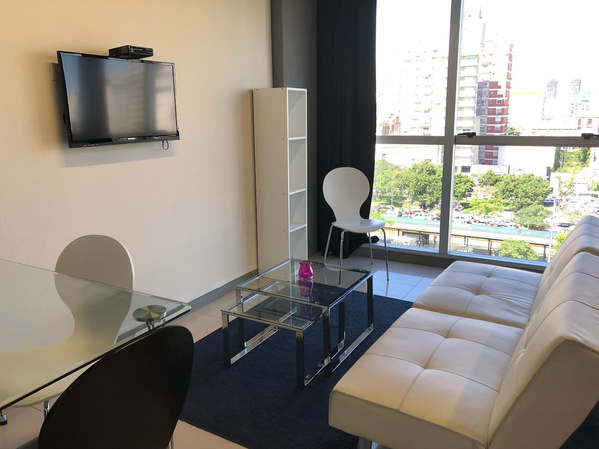 Departamento de 1 dormitorio de 35 m² con vista a Av. 9 de Julio. Tiene grandes ventanales, pisos de porcelanato y kitchenette equipada con heladera con freezer, cocina a gas y vajilla. Cuenta con baño con ducha, dormitorio con 2 camas individuales y juegos de ropa de cama, y living con sofá, mesa y TV LED de 32" con cable. El edificio dispone de terraza en el 13° piso con vista en todos los puntos cardinales y sector para fumadores; la administración coordina el uso de parrilla con reserva.