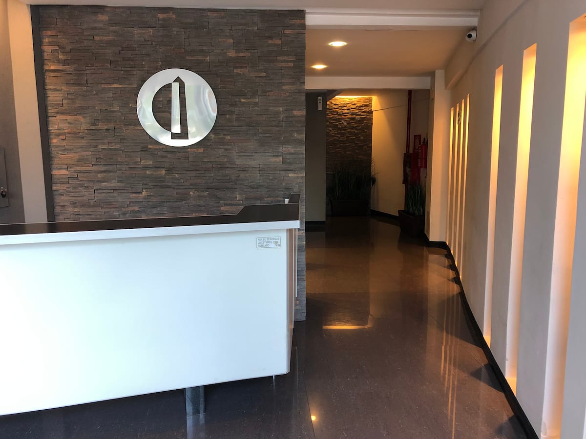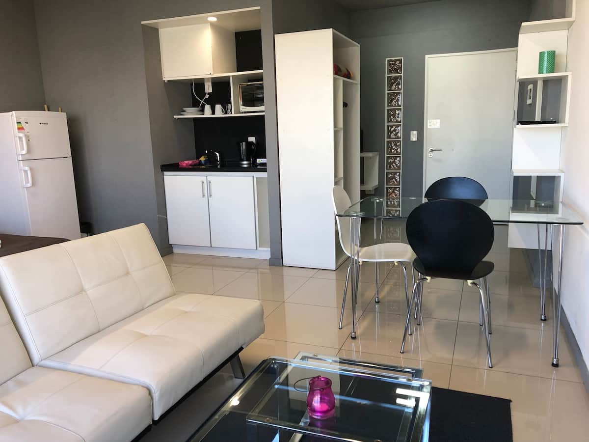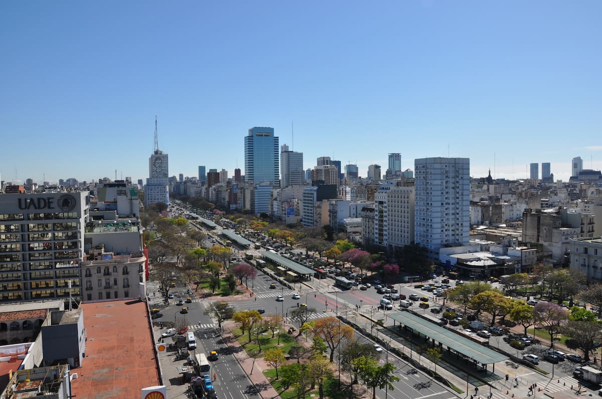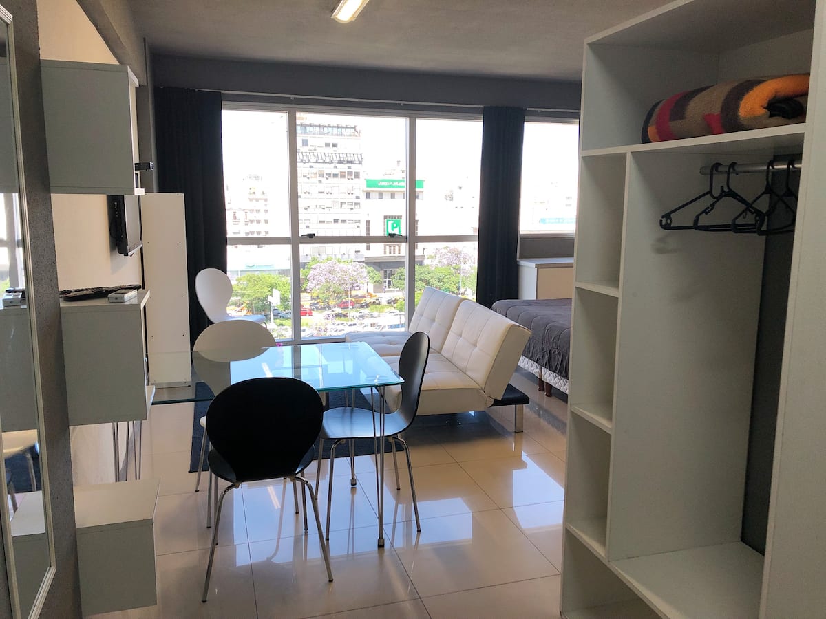 Departamento de 1 dormitorio de 35 m² con vista a Av. 9 de Julio. Tiene grandes ventanales, pisos de porcelanato y kitchenette equipada con heladera con freezer, cocina a gas y vajilla. Cuenta con baño con ducha, dormitorio con 2 camas individuales y juegos de ropa de cama, y living con sofá, mesa y TV LED de 32" con cable. El edificio dispone de terraza en el 13° piso con vista en todos los puntos cardinales y sector para fumadores; la administración coordina el uso de parrilla con reserva.