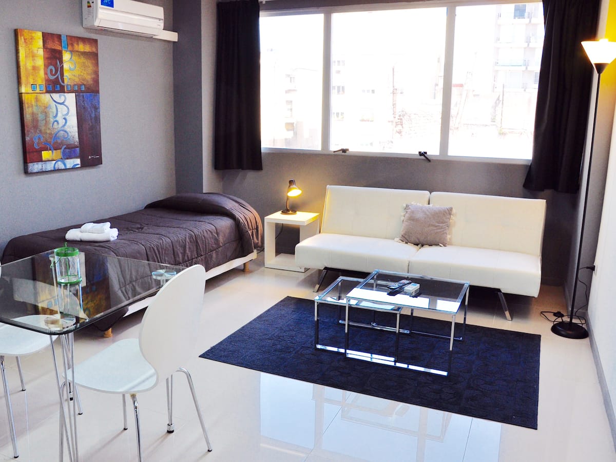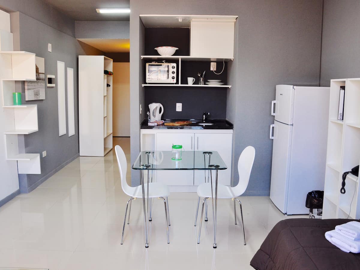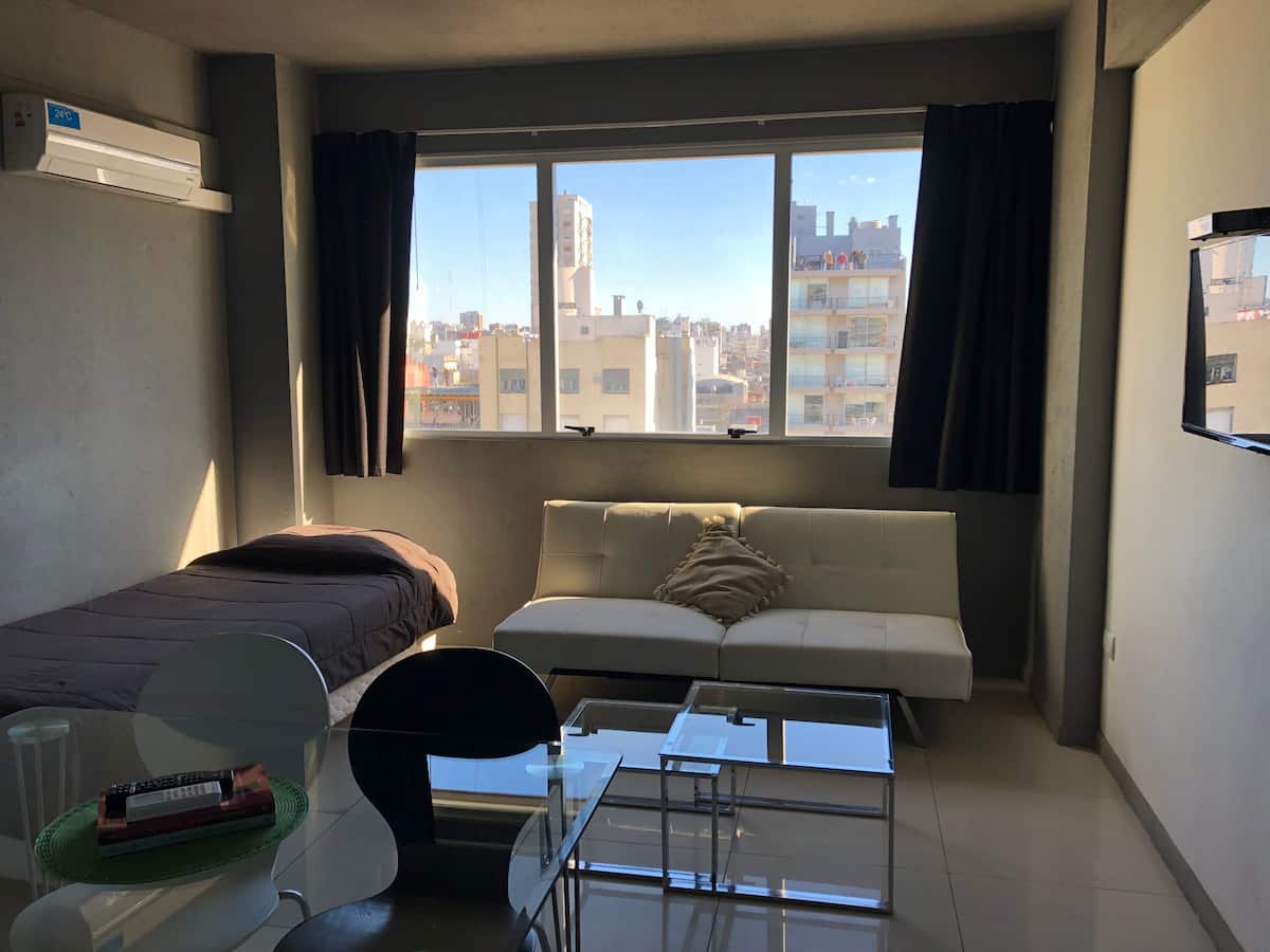 Apartamento com 30 m² em Constitución, com grandes janelas e piso de porcelanato. Inclui cozinha compacta equipada (geladeira com freezer, forno elétrico, cooktop/anafe e utensílios), área de estar com TV LED de 32" com TV a cabo e ar-condicionado quente/frio. O apartamento tem banheiro com box de chuveiro e toalhas, além de mesa de vidro para 4 pessoas e sofá. O edifício dispõe de terraço no 13º andar com vista para os pontos cardeais, permite fumar e conta com uso de área de churrasqueira medi
