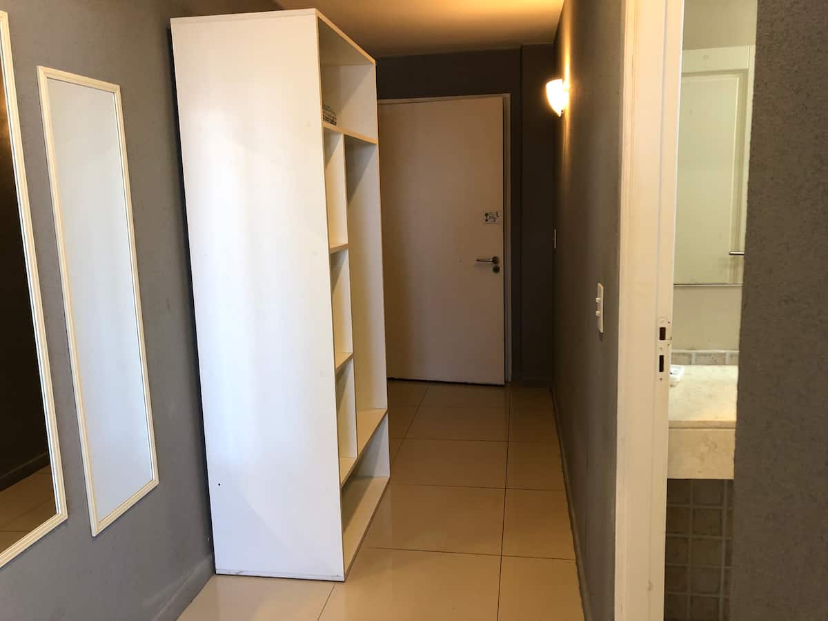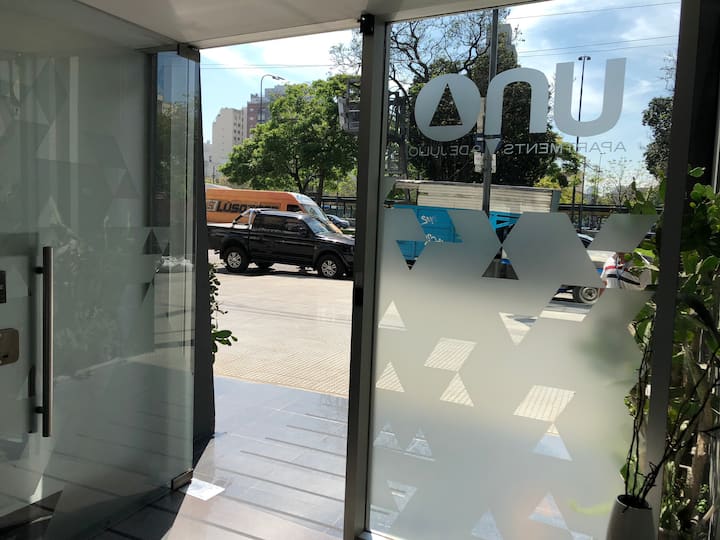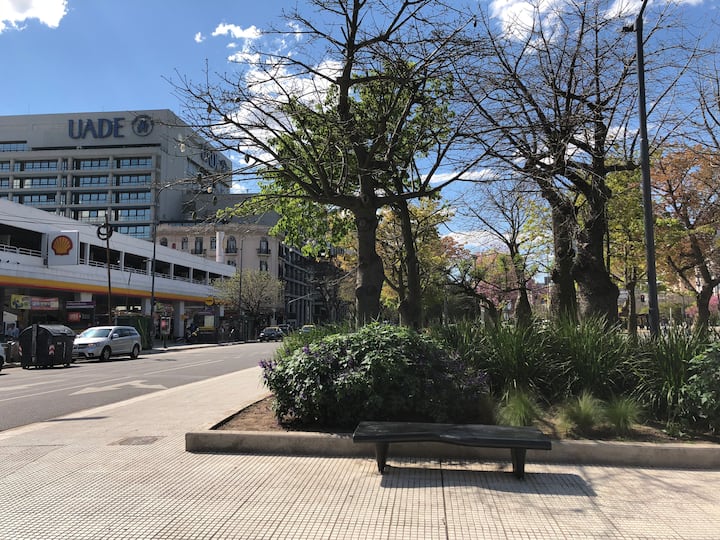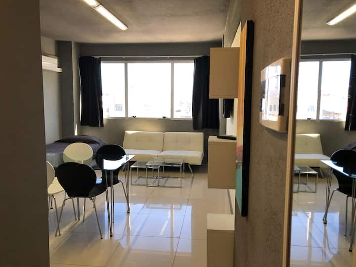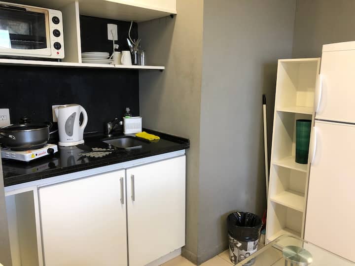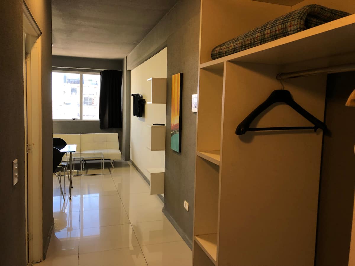 Apartamento com 30 m² em Constitución, com grandes janelas e piso de porcelanato. Inclui cozinha compacta equipada (geladeira com freezer, forno elétrico, cooktop/anafe e utensílios), área de estar com TV LED de 32" com TV a cabo e ar-condicionado quente/frio. O apartamento tem banheiro com box de chuveiro e toalhas, além de mesa de vidro para 4 pessoas e sofá. O edifício dispõe de terraço no 13º andar com vista para os pontos cardeais, permite fumar e conta com uso de área de churrasqueira medi