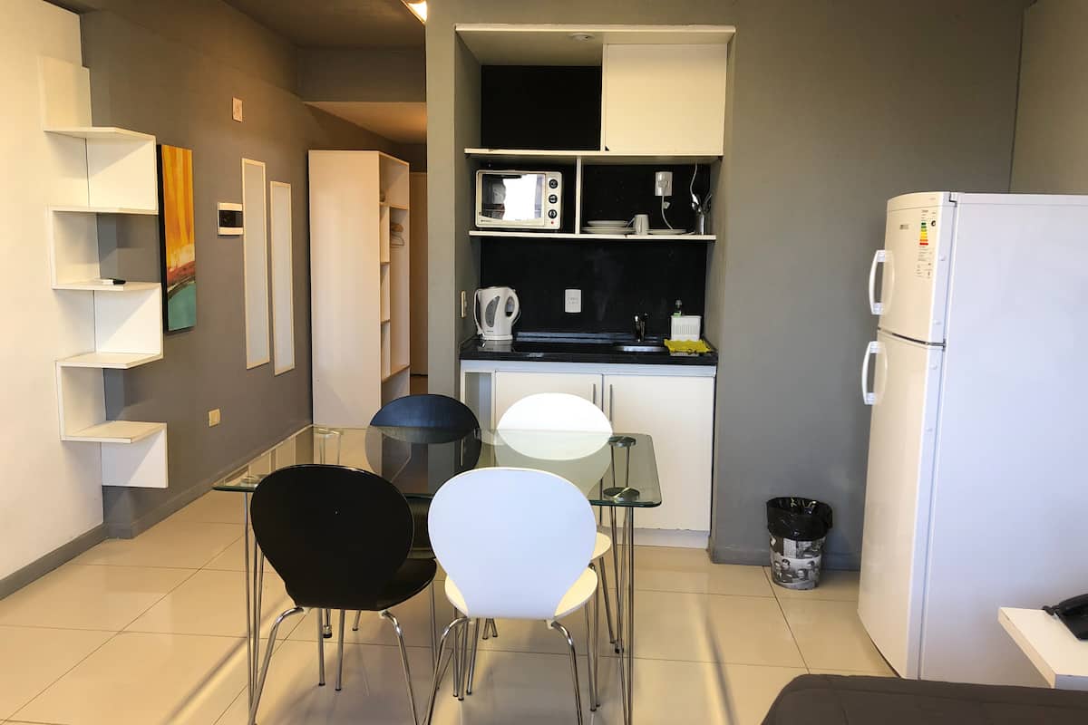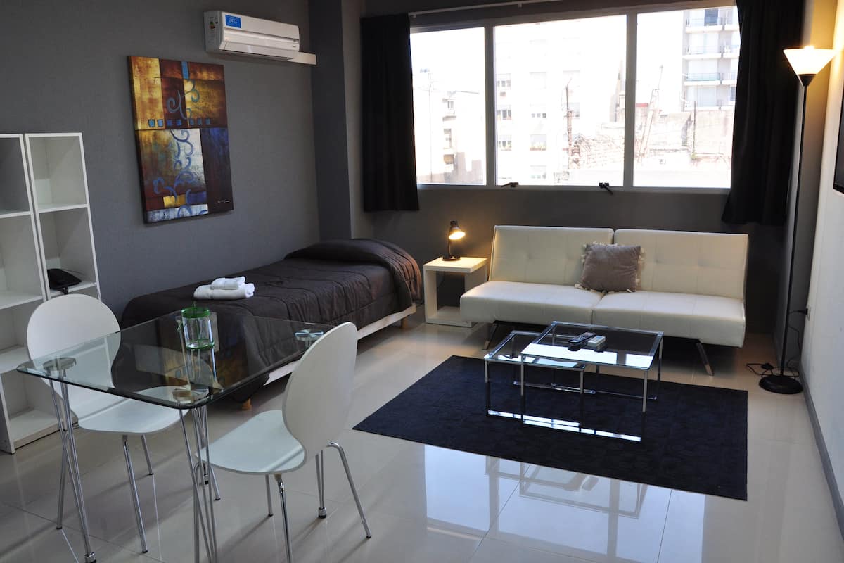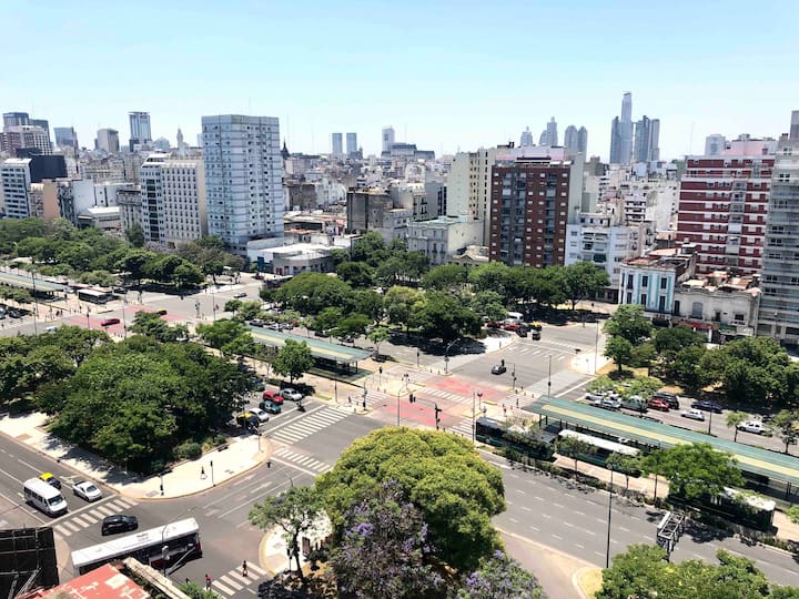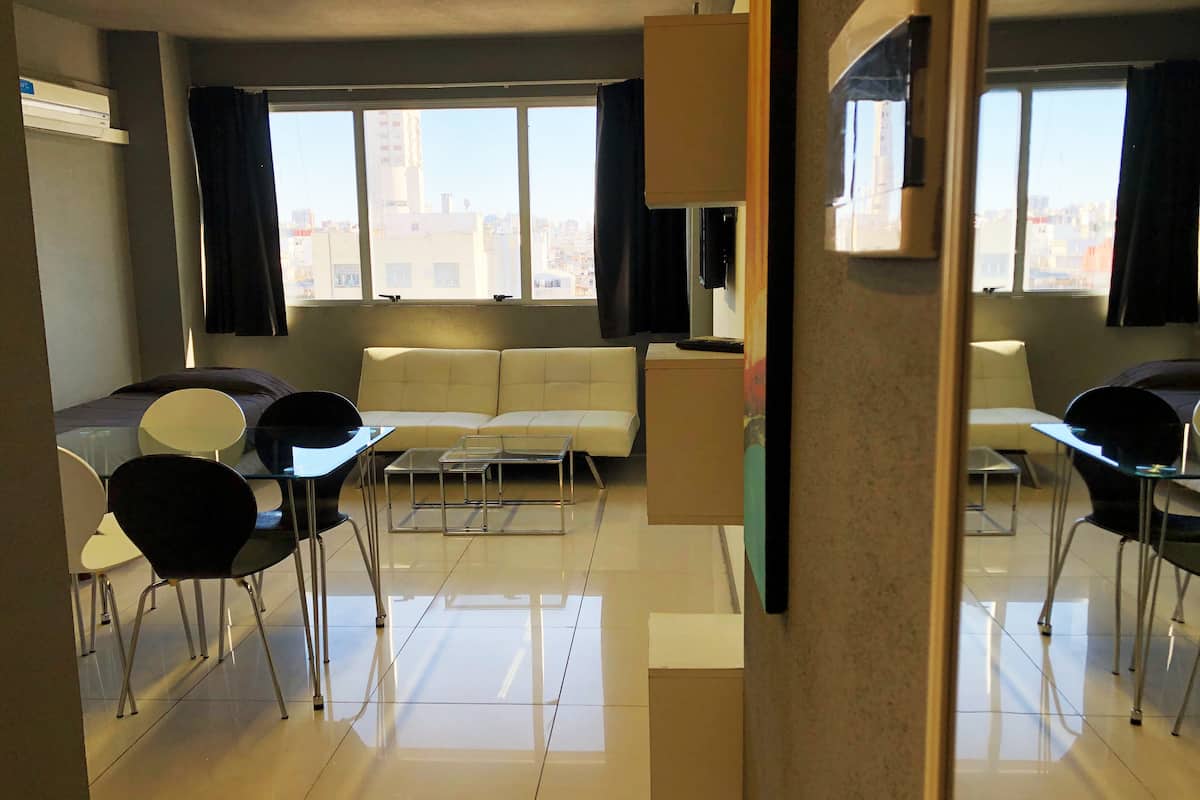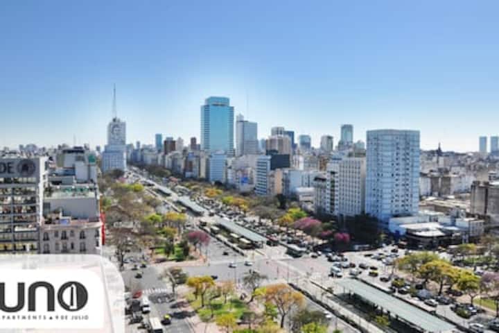 Departamento de 1 dormitorio de 30 m² sobre Av. 9 de Julio, en una propiedad ubicada a pocos pasos de San Telmo. Cuenta con amoblado y equipamiento básico: aire acondicionado frío/calor, cocina equipada con heladera con freezer, anafe, horno eléctrico y vajilla completa. Incluye dormitorio con sommier individual y ropa de cama, baño con ducha y set de toallas, comedor con mesa de vidrio y 4 sillas, y living con sofá, mesa y TV LED 32" con cable. El edificio dispone de terraza en el 13° piso con