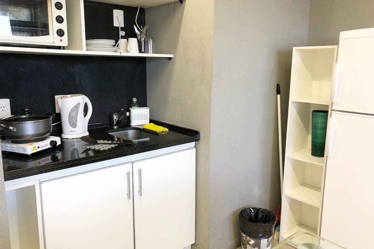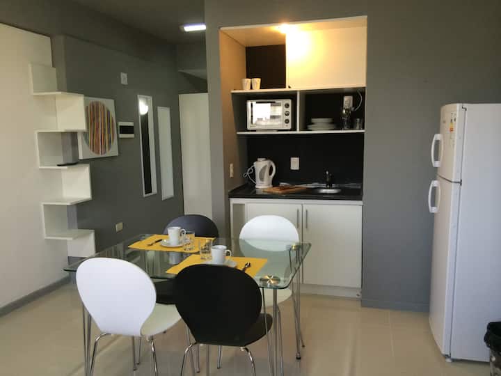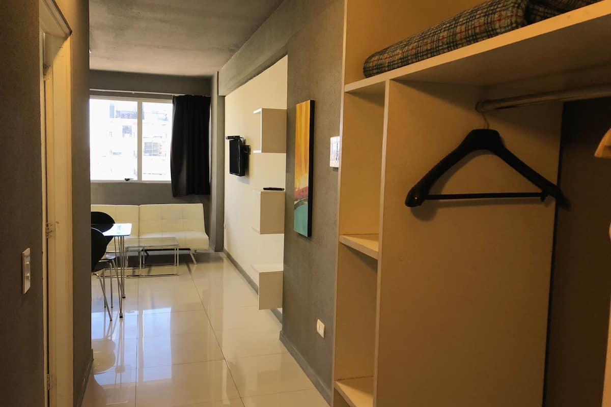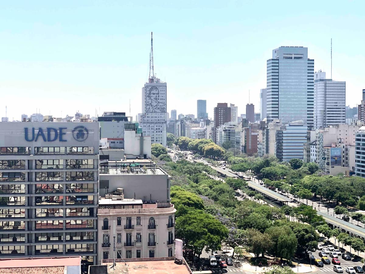 Departamento de 1 dormitorio de 30 m² sobre Av. 9 de Julio, en una propiedad ubicada a pocos pasos de San Telmo. Cuenta con amoblado y equipamiento básico: aire acondicionado frío/calor, cocina equipada con heladera con freezer, anafe, horno eléctrico y vajilla completa. Incluye dormitorio con sommier individual y ropa de cama, baño con ducha y set de toallas, comedor con mesa de vidrio y 4 sillas, y living con sofá, mesa y TV LED 32" con cable. El edificio dispone de terraza en el 13° piso con