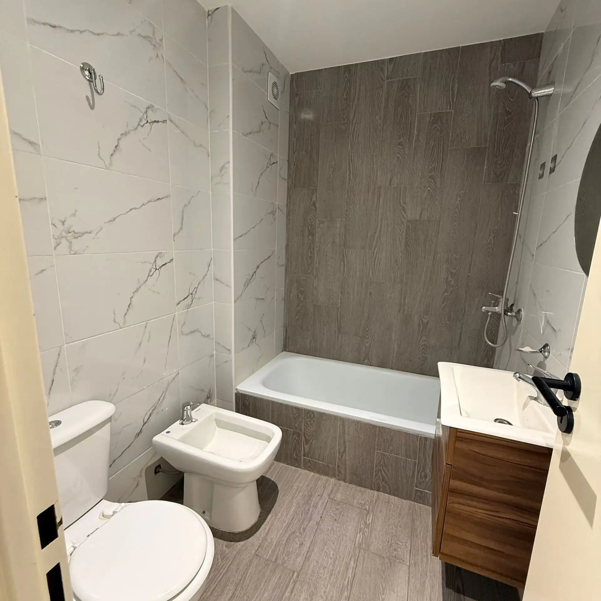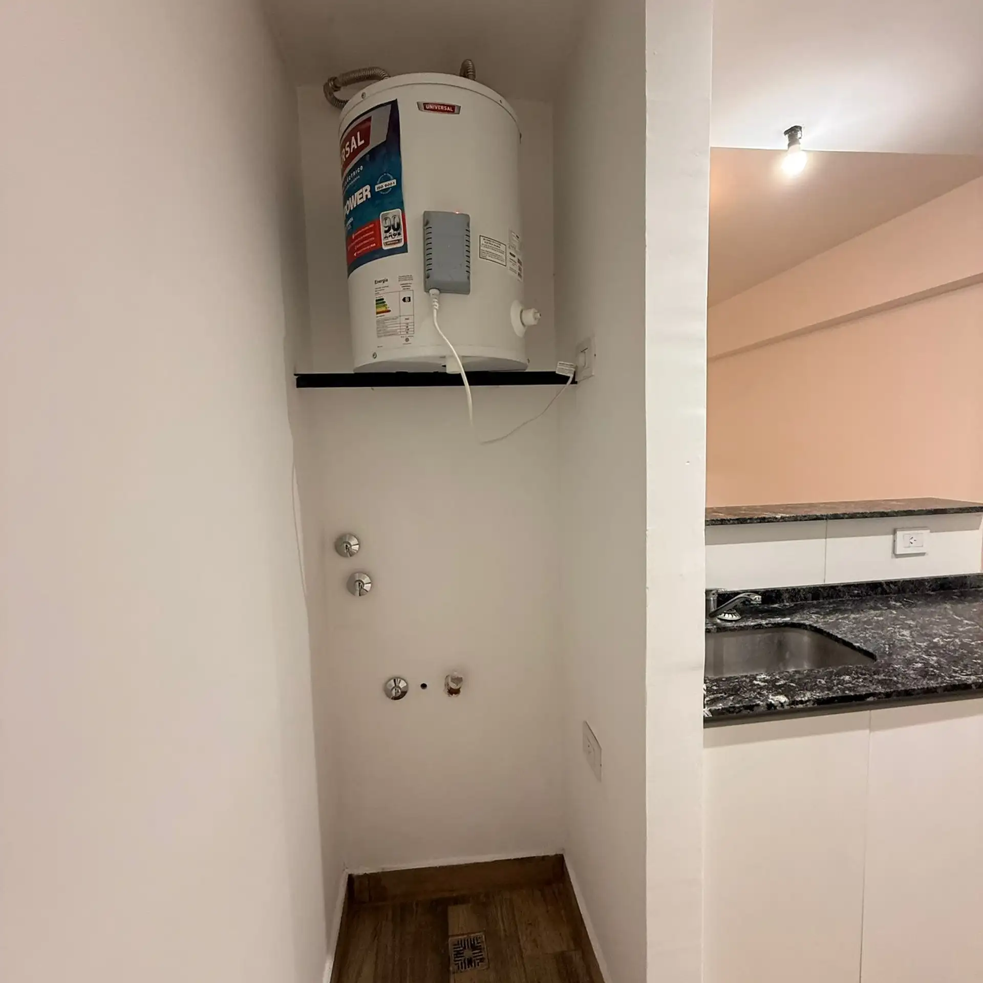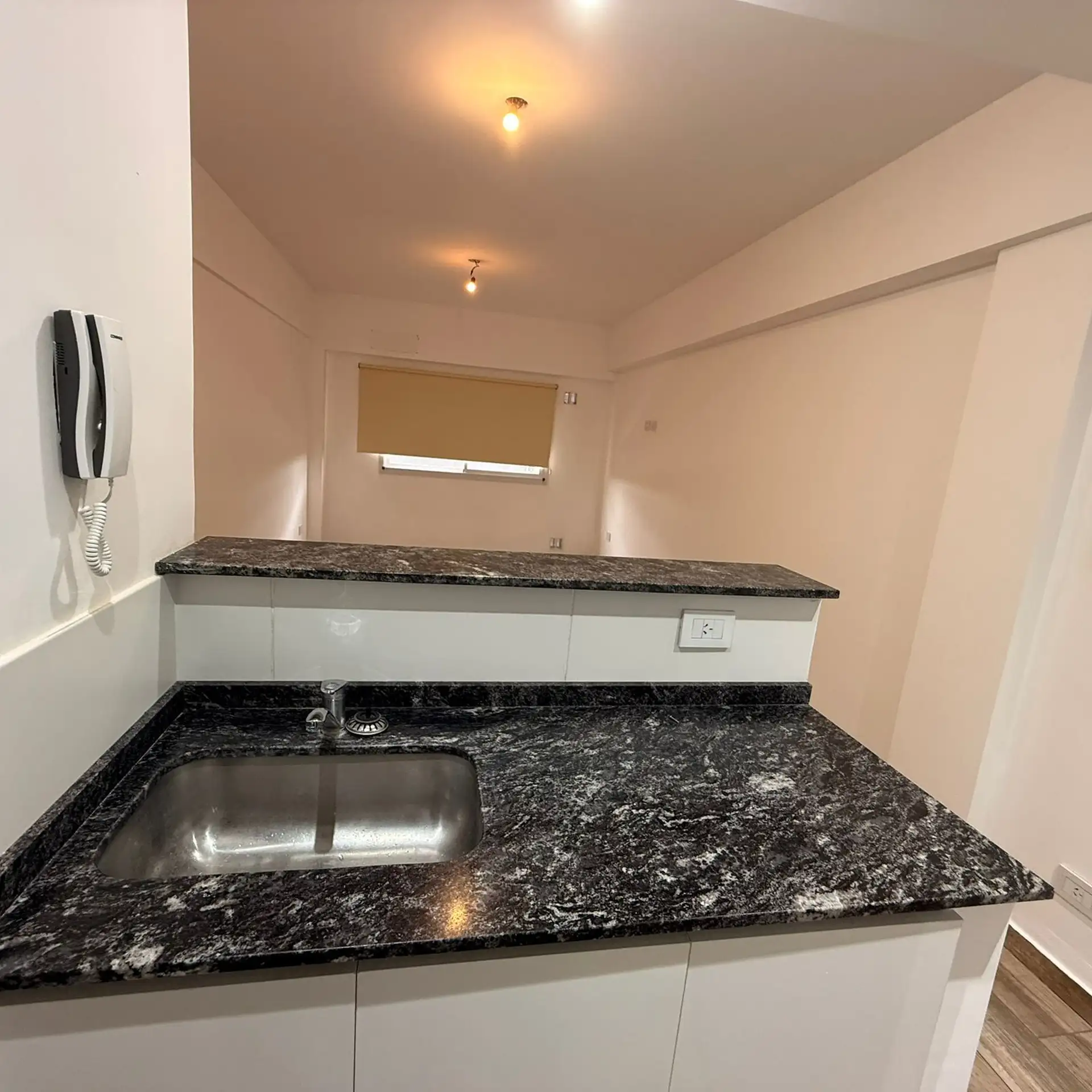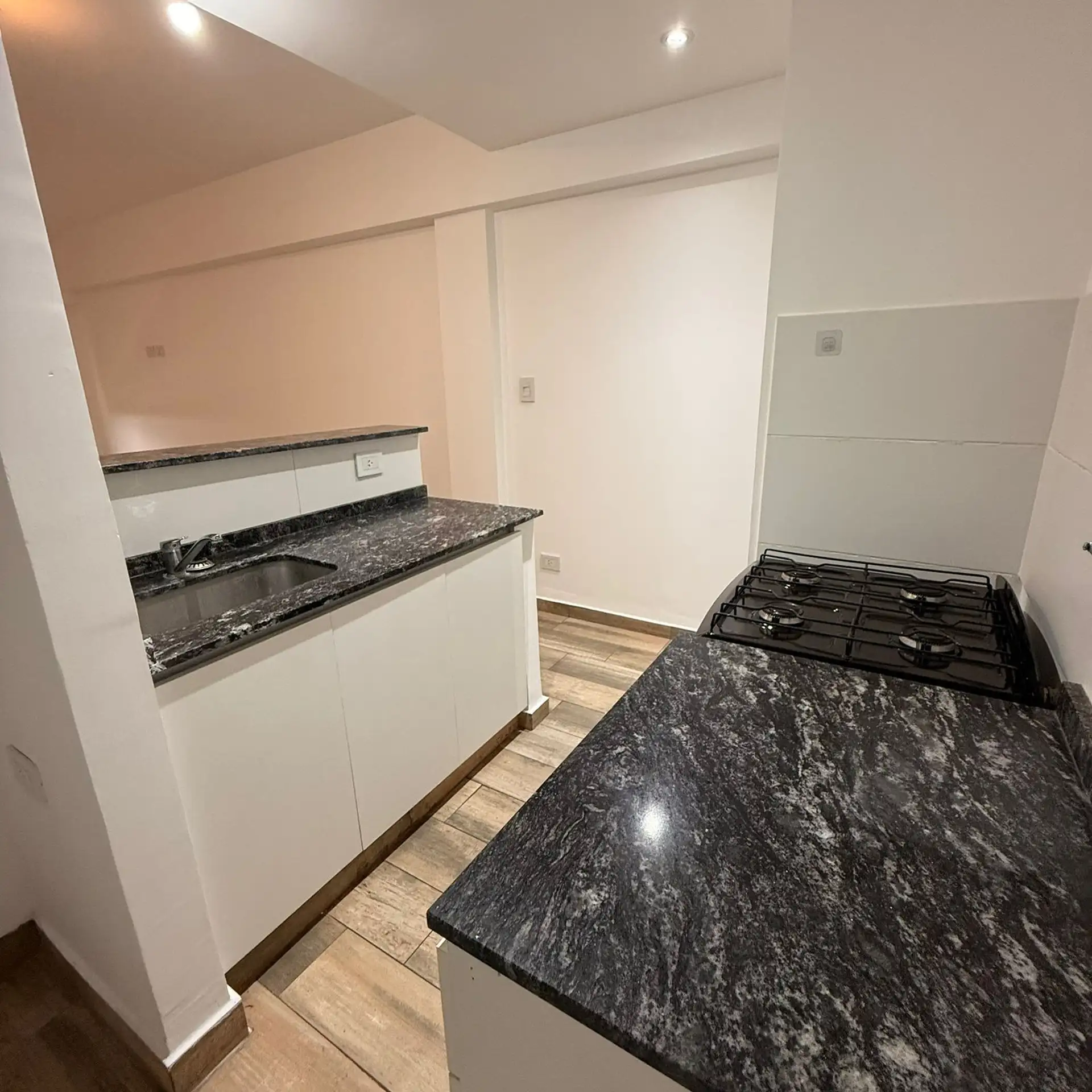 Departamento monoambiente en 4° piso. Incluye cocina con bajo mesada y artefacto de cocina, termotanque eléctrico e instalación para lavarropas. Cuenta con baño completo con bañera y ambiente con piso de porcelanato símil madera, cortina roller y preinstalación para aire acondicionado.