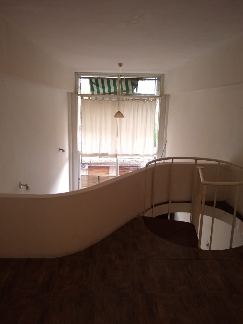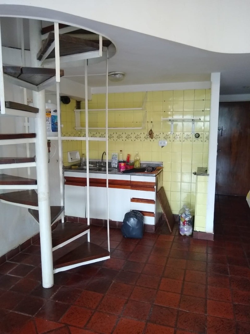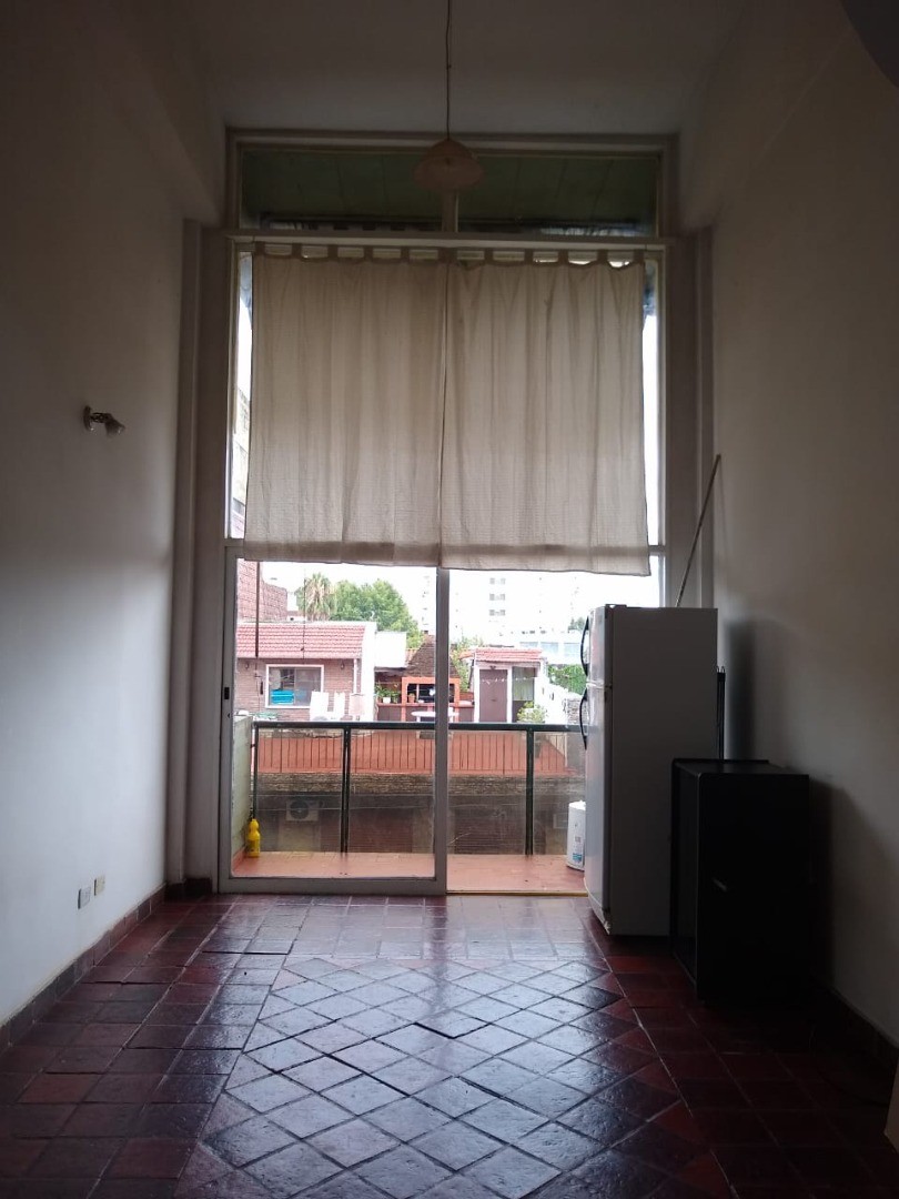 Departamento de 2 ambientes en doble altura, con el dormitorio en entrepiso que balconea al ambiente. Indica orientación al frente y no tiene gas natural. El contrato es por 2 años con ajuste trimestral por IPC.