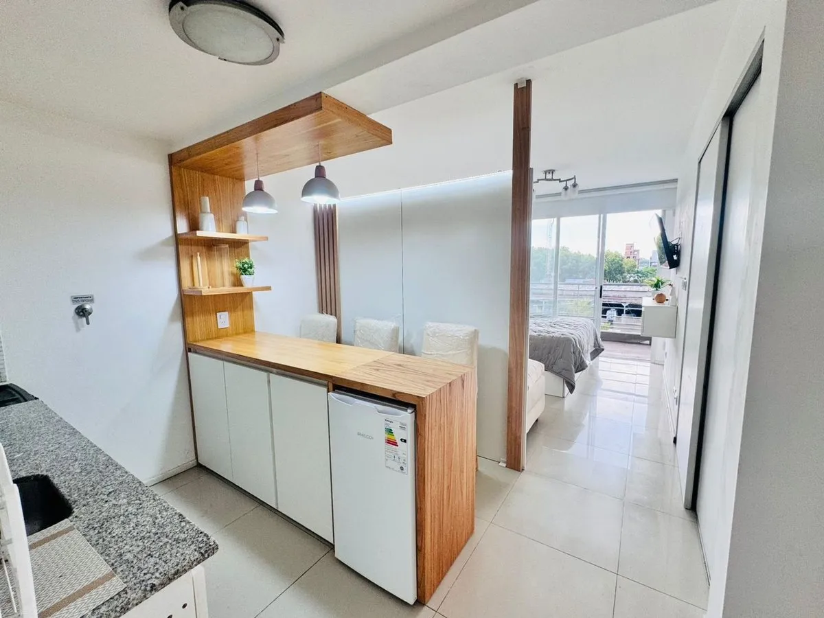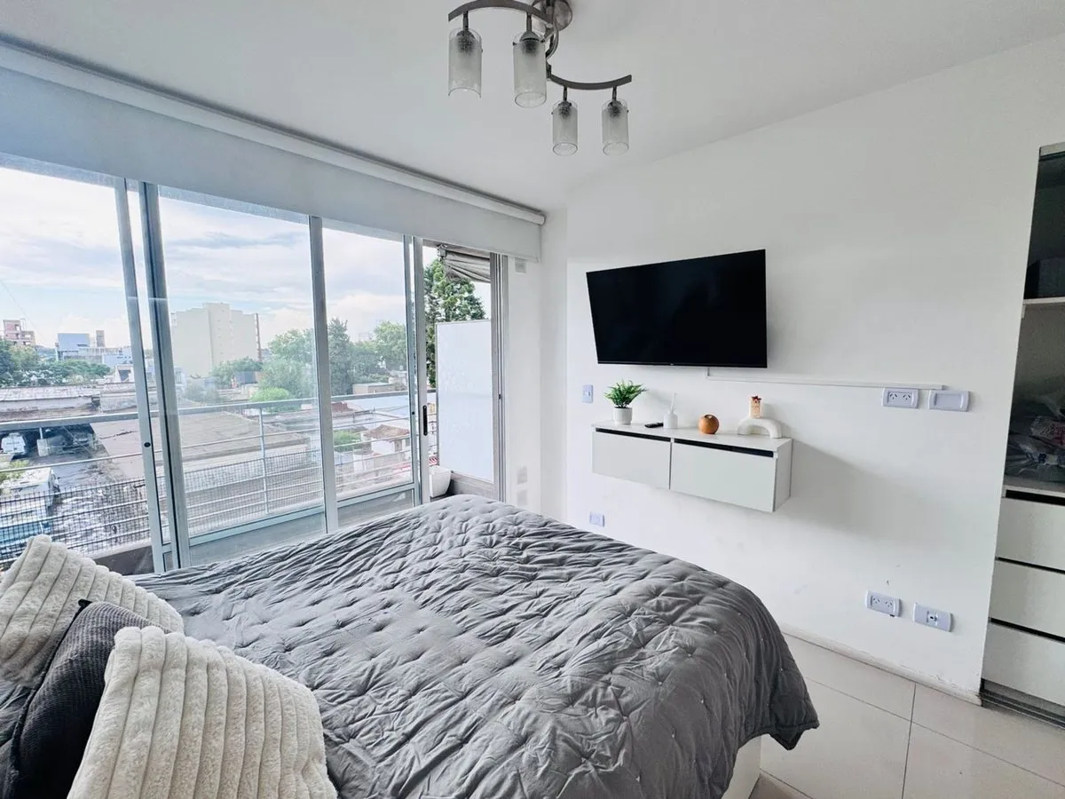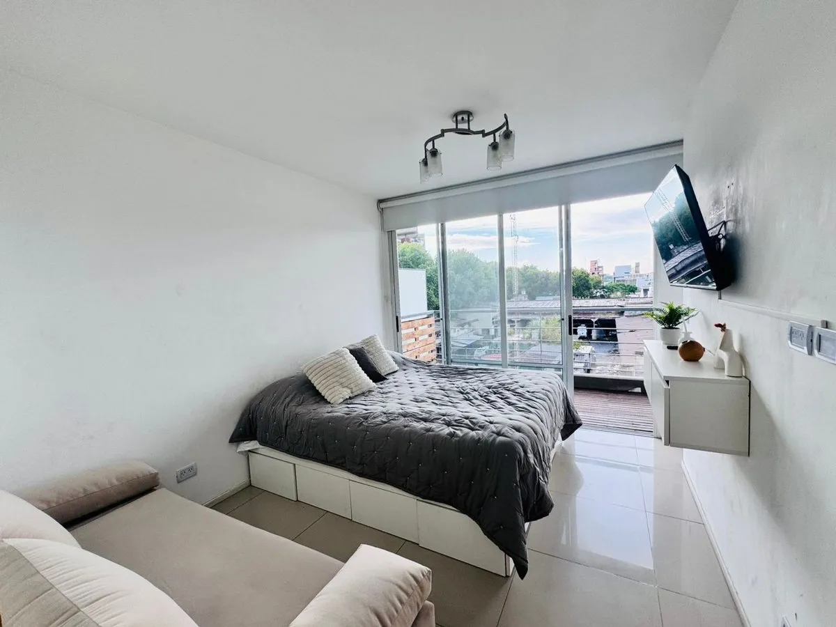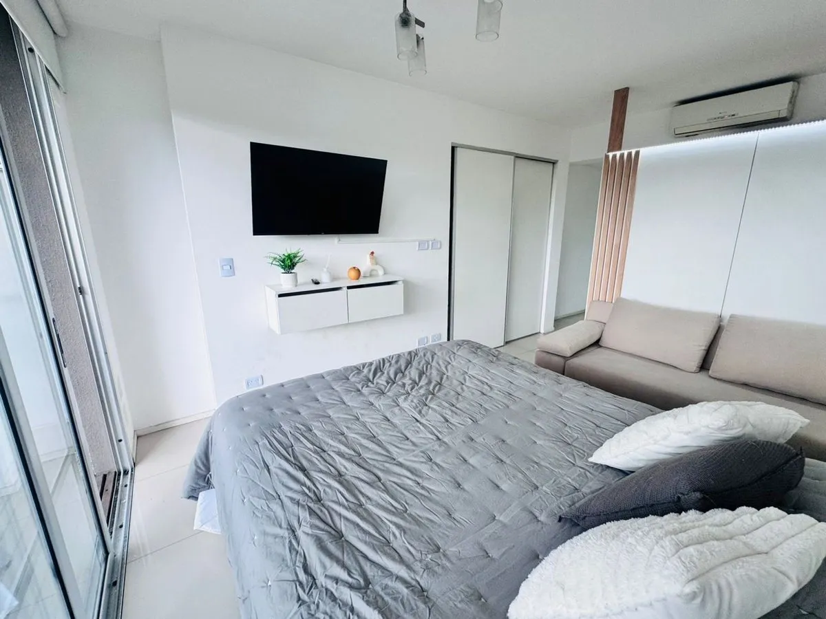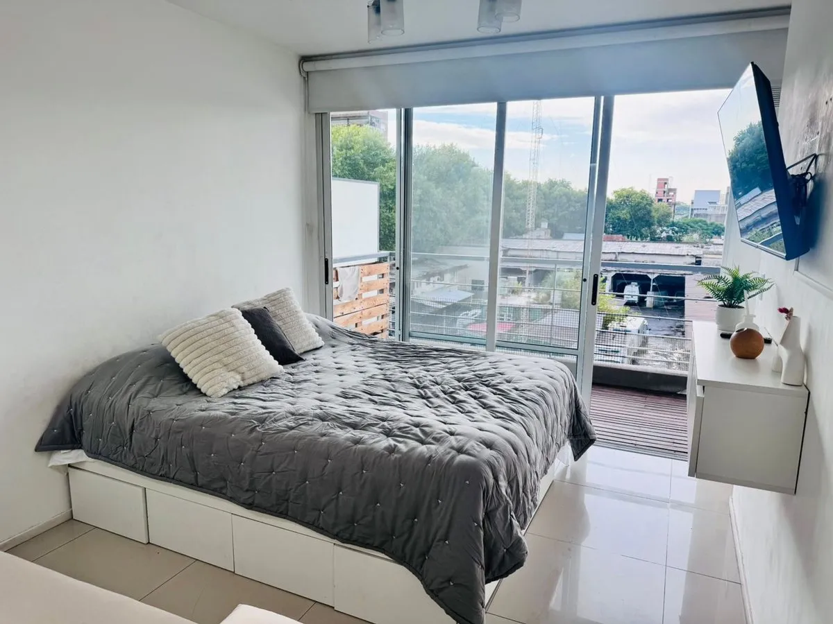 Departamento monoambiente de 30 m² en el 4° piso, en San Martín, sobre Av. Rivadavia. Está equipado y dividido en 2 ambientes, con cama de 1,40 x 2 m, sofá de 3 cuerpos convertible y TV LED, además de aire acondicionado frío/calor y placard de doble puerta corrediza. Desde el dormitorio se accede a un balcón al contrafrente con vista abierta. Cocina equipada con horno microondas, cafetera, pava eléctrica y vajilla completa, y baño con bañera y extractor de aire. El edificio tiene 2 ascensores, p