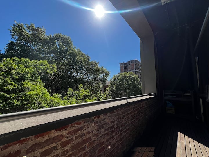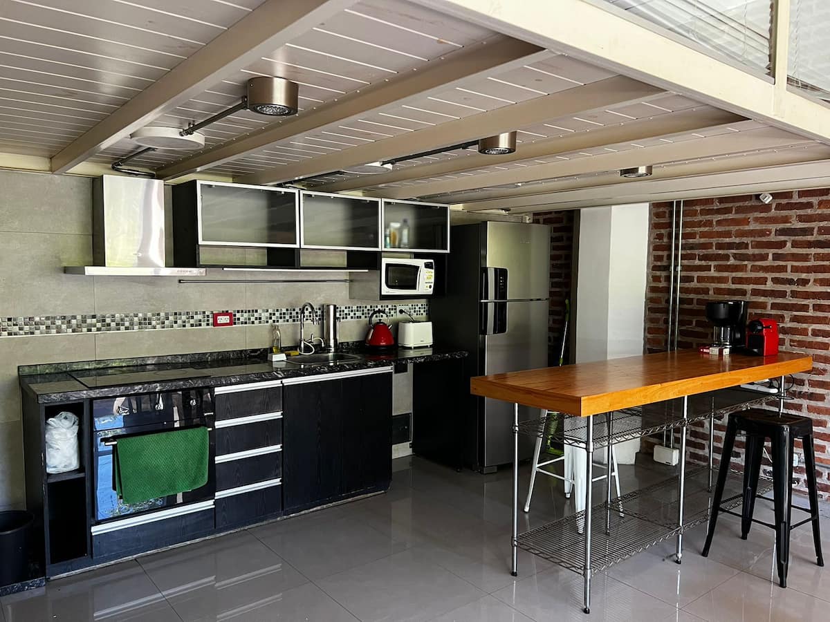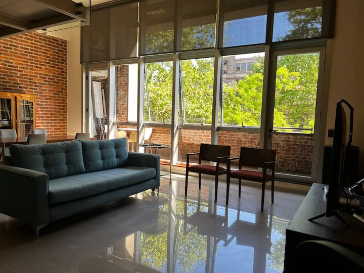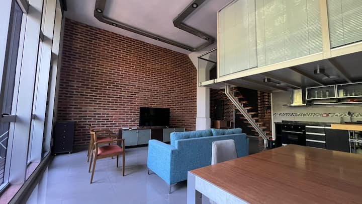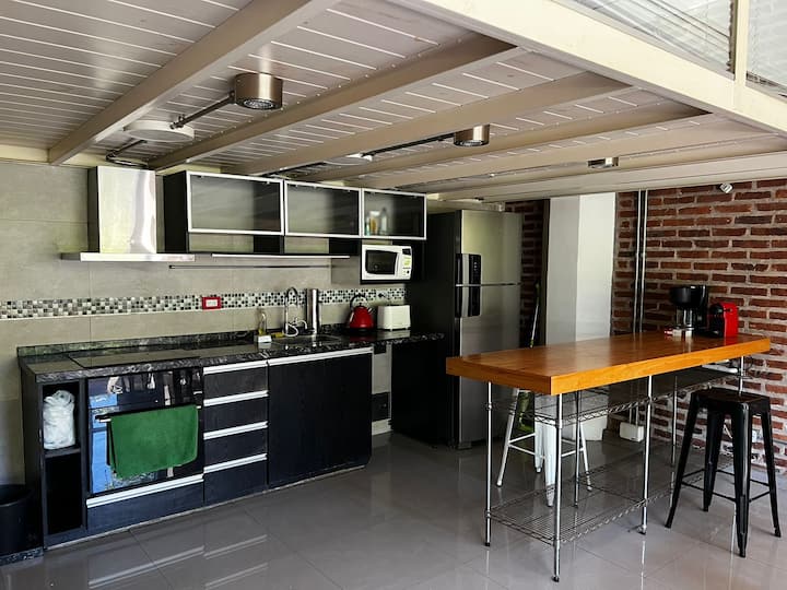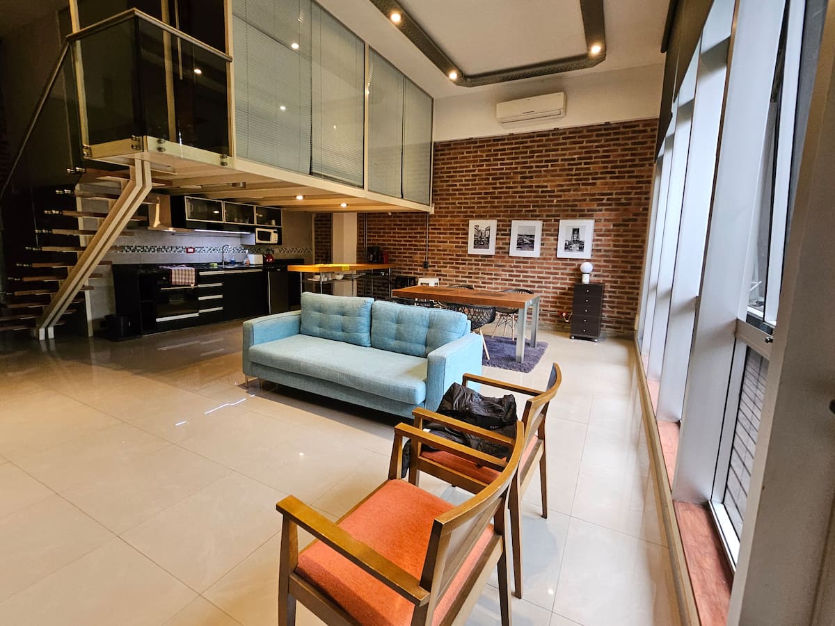 Loft de 70 m² en dos plantas en La Boca, con 1 dormitorio, 1 baño y living con cocina integrada. Tiene balcón privado con parrilla. La cocina está equipada y el departamento se describe con techos altos.