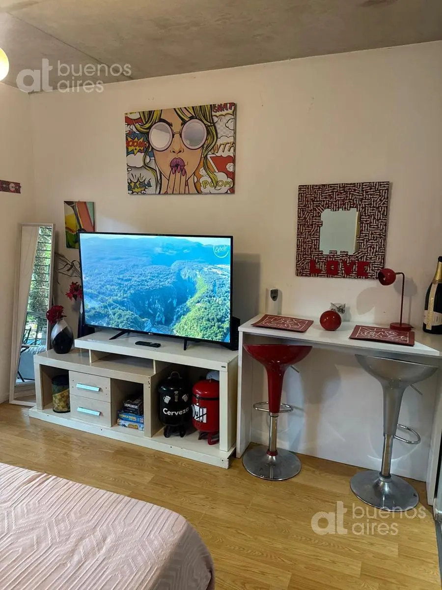 Monoambiente de alquiler temporario con balcón en La Boca. Cuenta con acceso con cerradura digital con clave numérica. La unidad tiene cocina con hornallas eléctricas, heladera bajo mesada, vajilla completa y microondas, y el sector del dormitorio dispone de cama rebatible doble, escritorio y espacio de guardado, aire acondicionado frío-calor Whirlpool y rack para Smart TV Noblex de 60', además de juegos de mesa, libros, toallas, sábanas, frazadas y acolchados. El balcón tiene amueblamiento Acap
