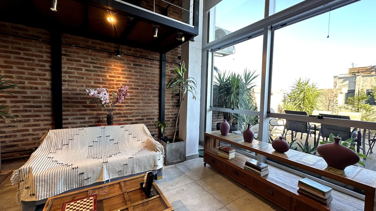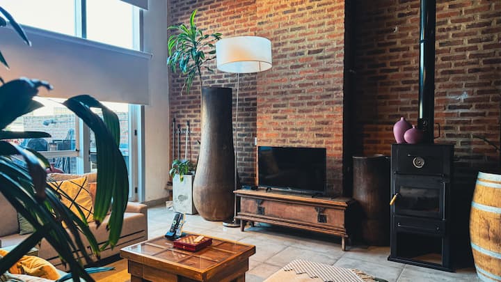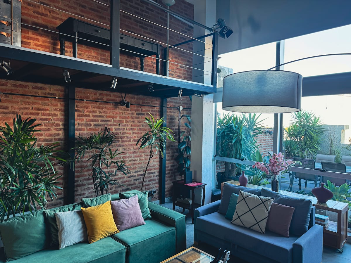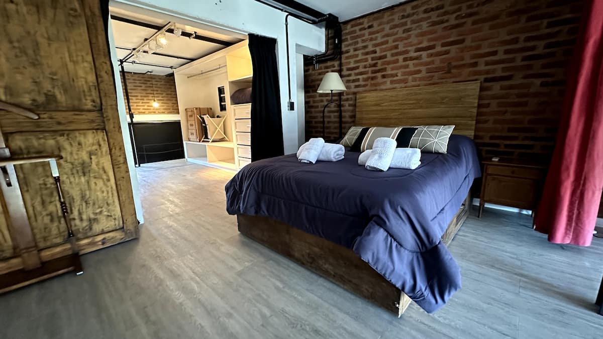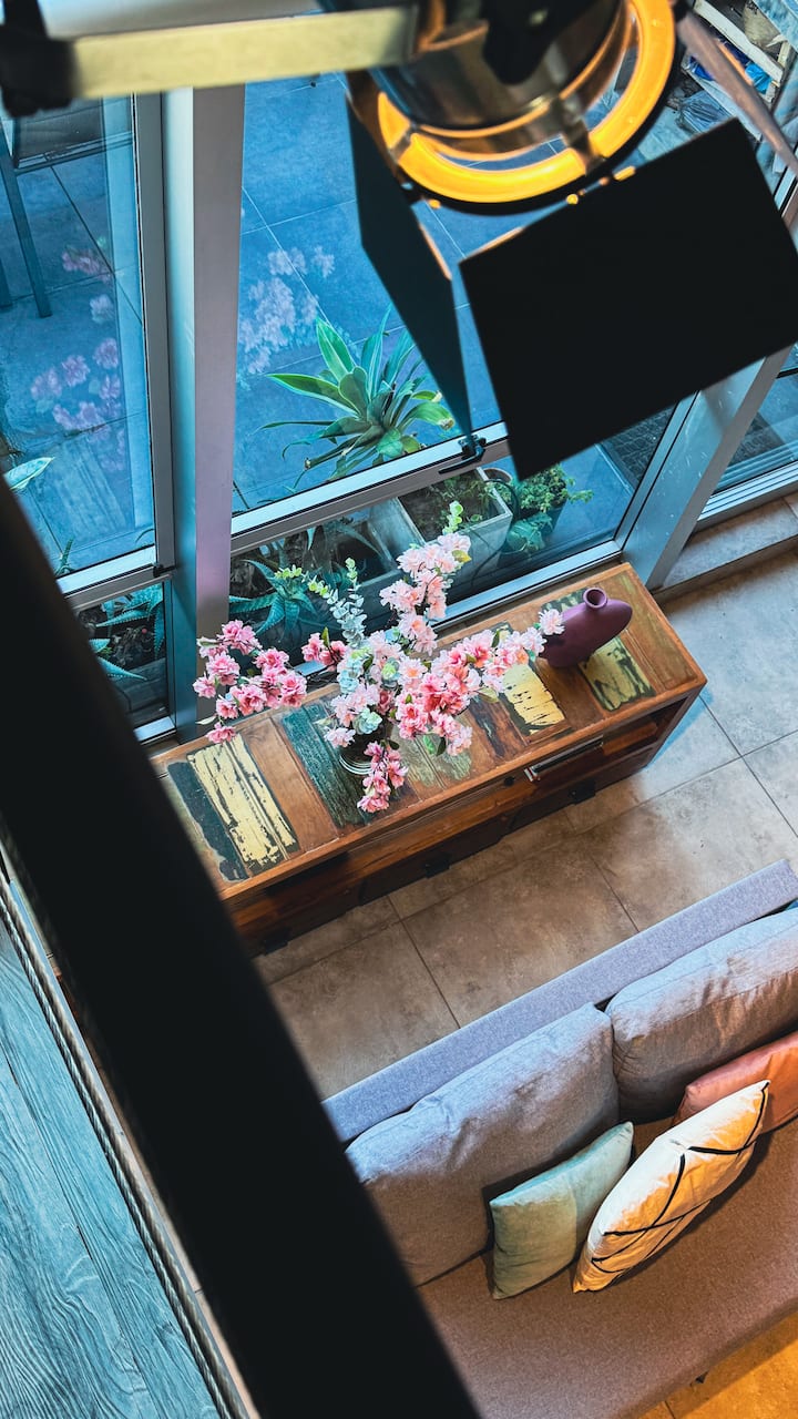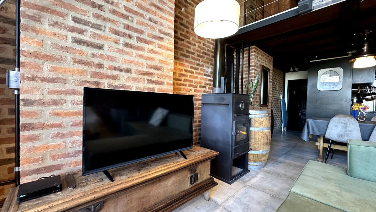 Loft de 1 dormitorio en La Boca, en el edificio Molina, ex fábrica de Alpargatas. Cuenta con doble altura y ventanales de piso a techo, con vista a la Bombonera. El espacio incluye cama queen y panel de vidrio traslúcido, cocina equipada con horno eléctrico, anafe, microondas, heladera con freezer y pava eléctrica, y living con sofá, Smart TV.