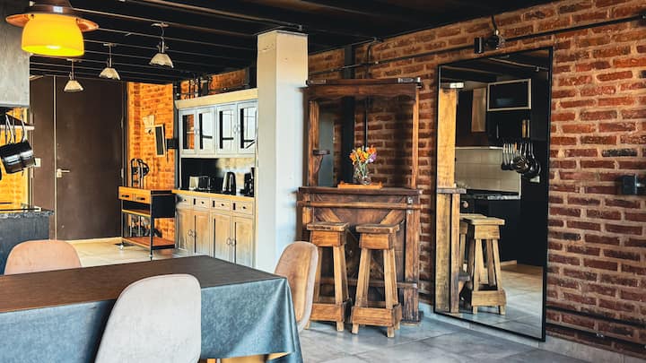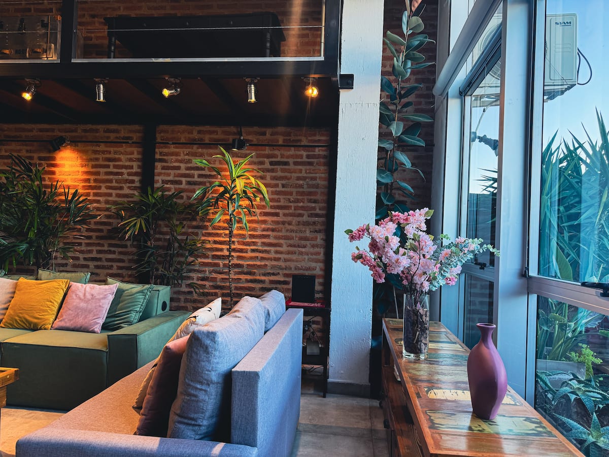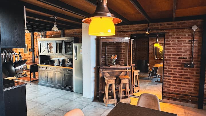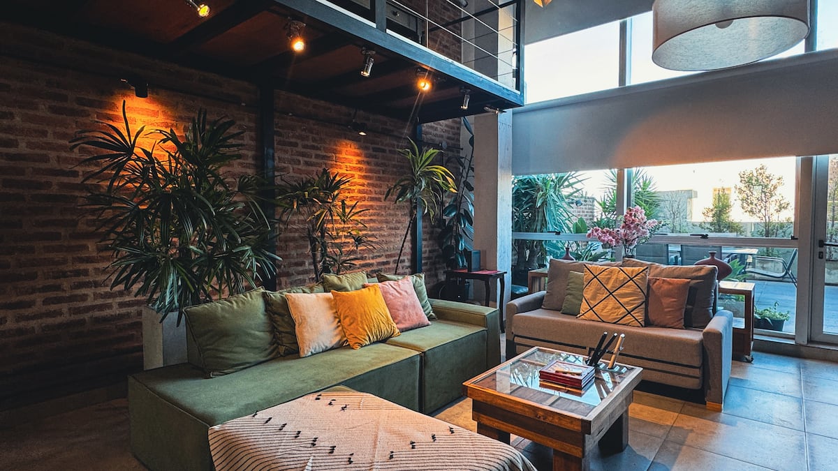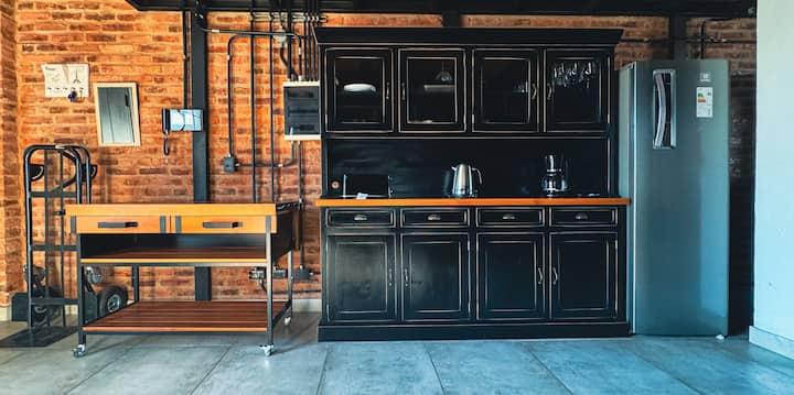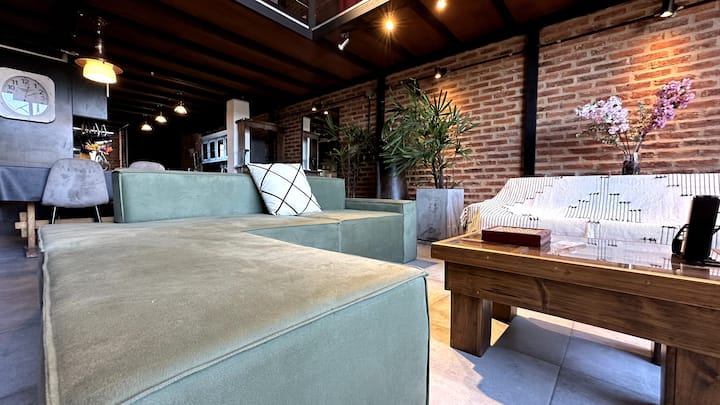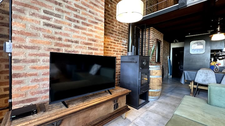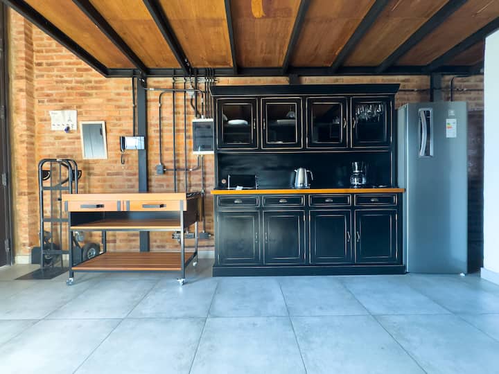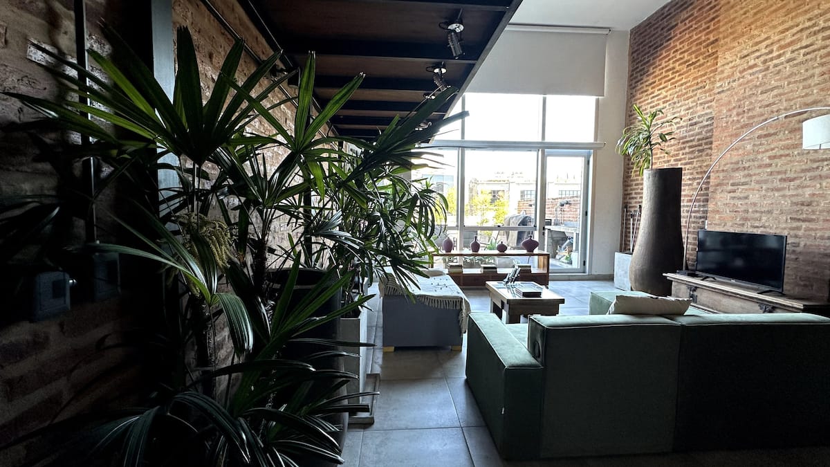 Loft de 1 dormitorio en La Boca, en el edificio Molina, ex fábrica de Alpargatas. Cuenta con doble altura y ventanales de piso a techo, con vista a la Bombonera. El espacio incluye cama queen y panel de vidrio traslúcido, cocina equipada con horno eléctrico, anafe, microondas, heladera con freezer y pava eléctrica, y living con sofá, Smart TV.