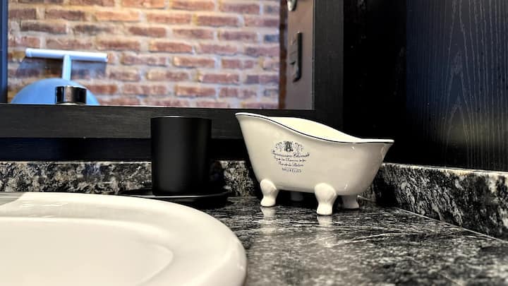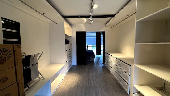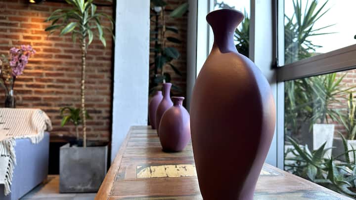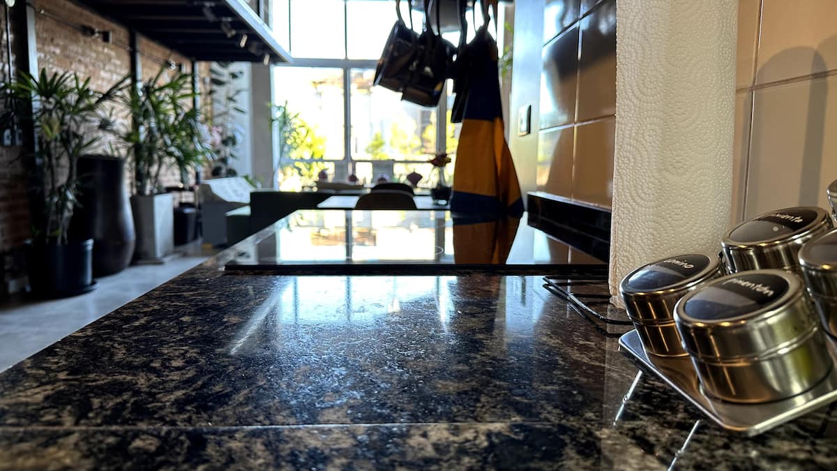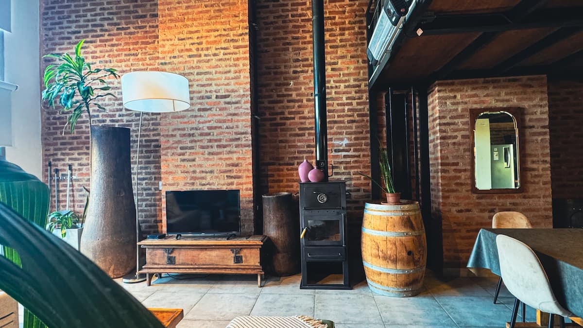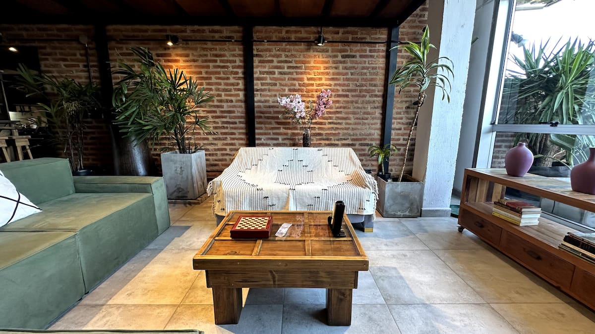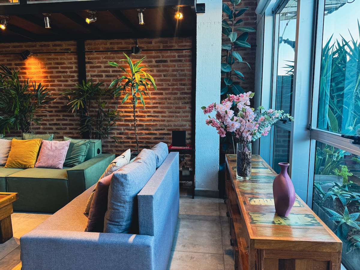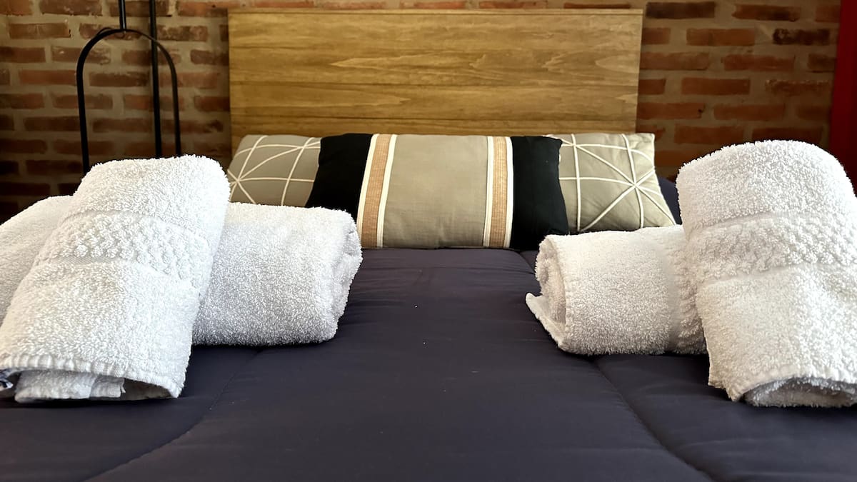 Loft de 1 dormitorio en La Boca, en el edificio Molina, ex fábrica de Alpargatas. Cuenta con doble altura y ventanales de piso a techo, con vista a la Bombonera. El espacio incluye cama queen y panel de vidrio traslúcido, cocina equipada con horno eléctrico, anafe, microondas, heladera con freezer y pava eléctrica, y living con sofá, Smart TV.