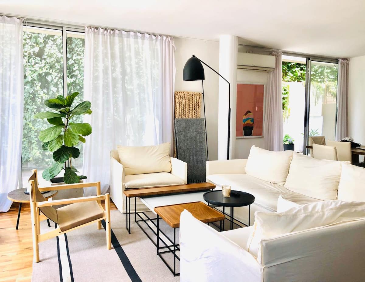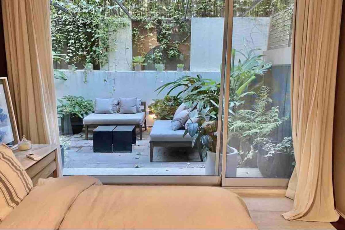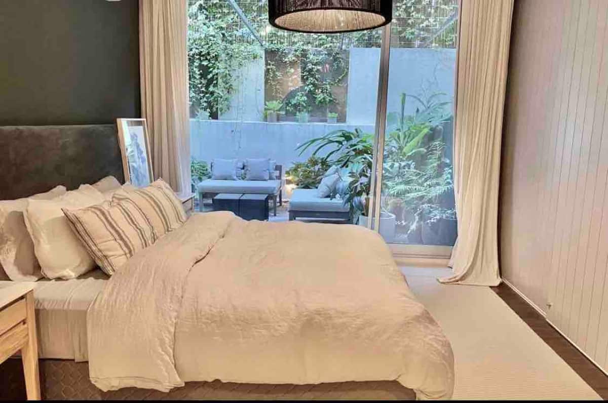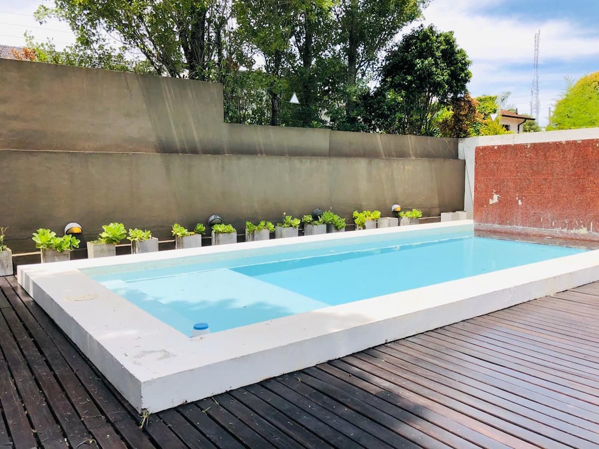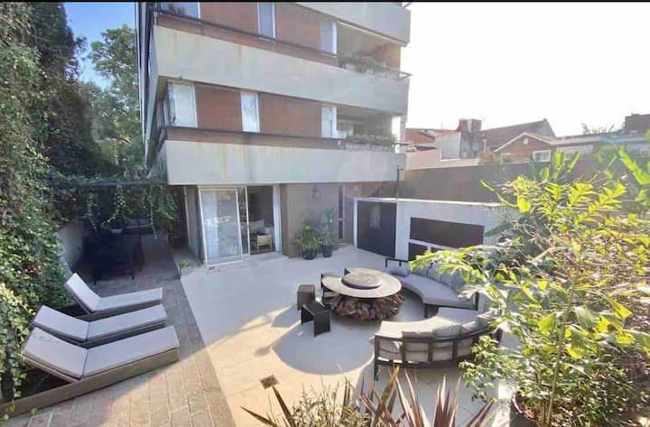Departamento de 1 dormitorio en La Lucila, en un edificio sobre Av. Del Libertador. Tiene ventana de piso a techo con acceso al patio. El edificio cuenta con pileta. El patio tiene parrilla, ducha y hogar. El alquiler incluye restricción de fiestas y eventos con música alta; el incumplimiento puede derivar en rescisión.