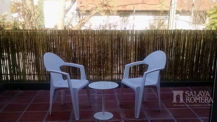 Departamento de 1 dormitorio en La Lucila. El anuncio menciona iluminación diseñada a medida y que el departamento está amueblado. Se indica que el entorno es tranquilo y que ofrece vistas desde donde se observan amaneceres y la ciudad.