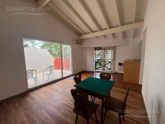 Departamento de 2 ambientes en alquiler en La Lucila. Al frente, con living comedor, cocina con barra hacia el living y cocina a gas. Tiene espacio para heladera, lugar para lavarropas y alacenas de guardado. El dormitorio cuenta con 2 placares, ventilador de techo y baño con yacuzzi, con claraboya en el techo. Dispone de aire acondicionado frío y estufa de tiro balanceado en el living, cortinas y gran terraza con parrilla. No se aceptan mascotas.