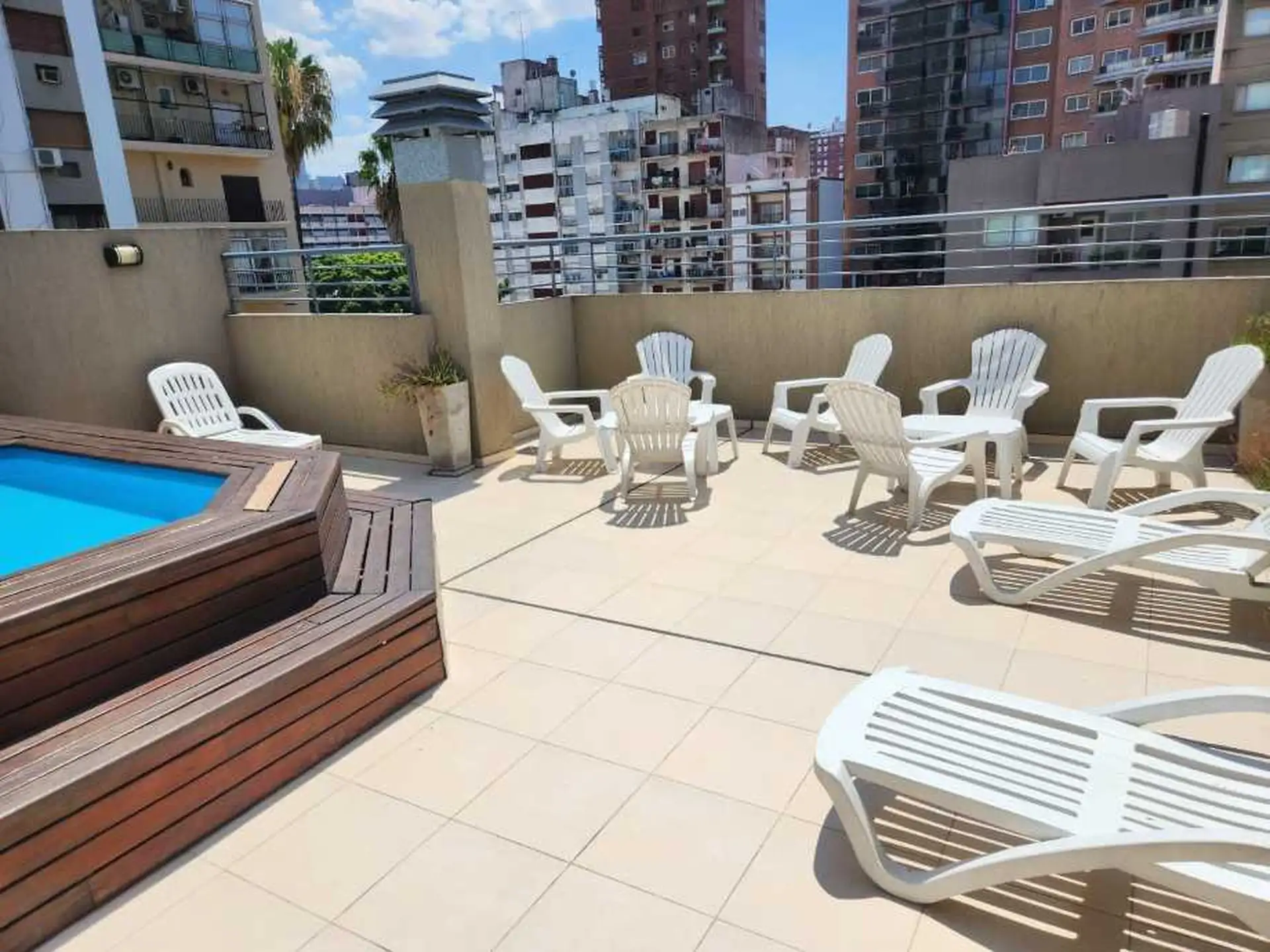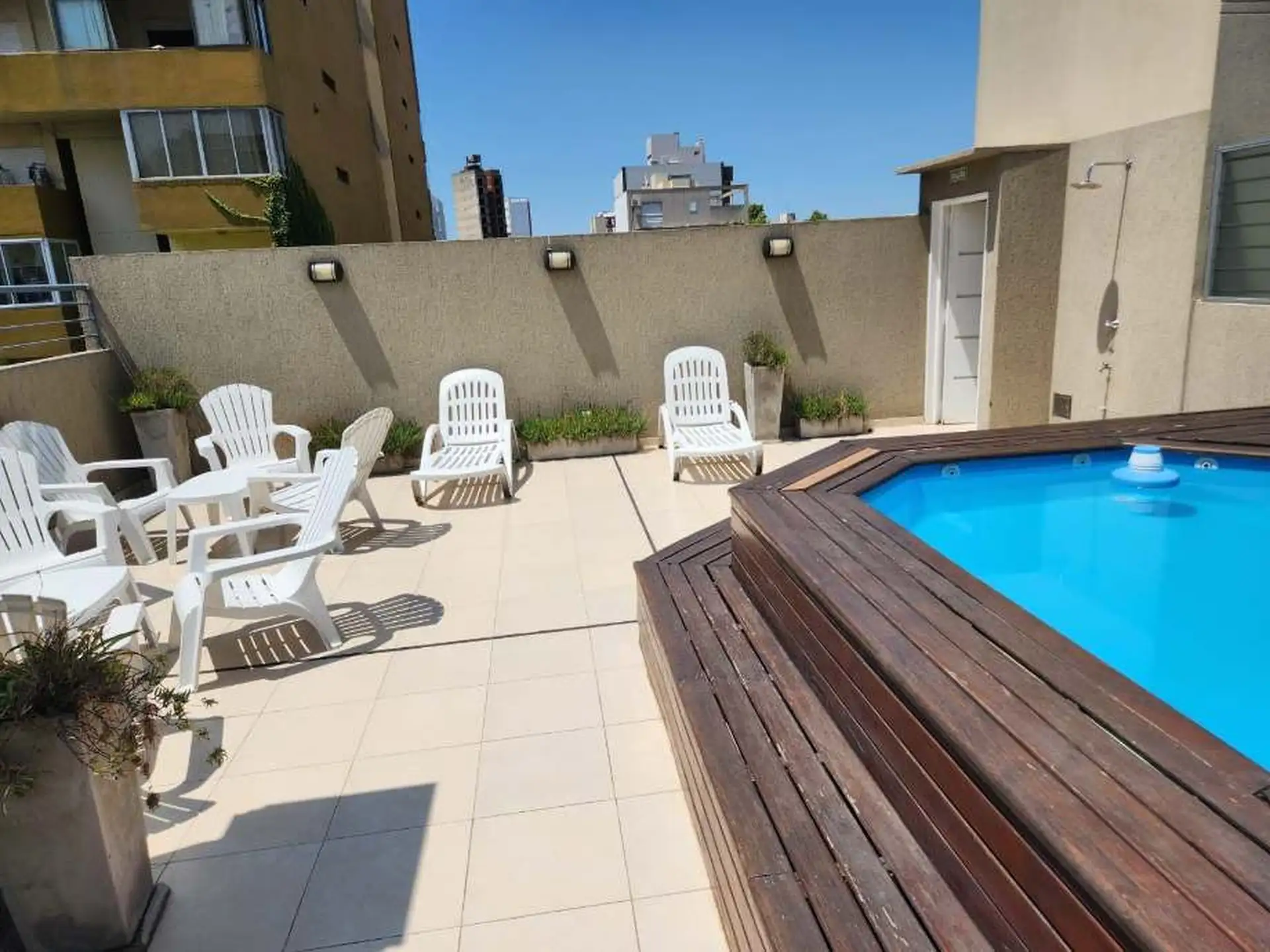 Departamento de 2 ambientes con balcón al contrafrente. Living comedor con salida al balcón, cocina independiente, toilette y dormitorio con vestidor y baño en suite. El edificio cuenta con piscina y solarium y está ubicado a media cuadra de Av. de Mayo. Requiere garantía propietaria familiar y justificación de ingresos propios. No se permiten mascotas. A cargo del inquilino: luz, gas, agua, impuesto municipal, seguro contra incendio y expensas comunes (expensas aproximadas sujetas a verificació