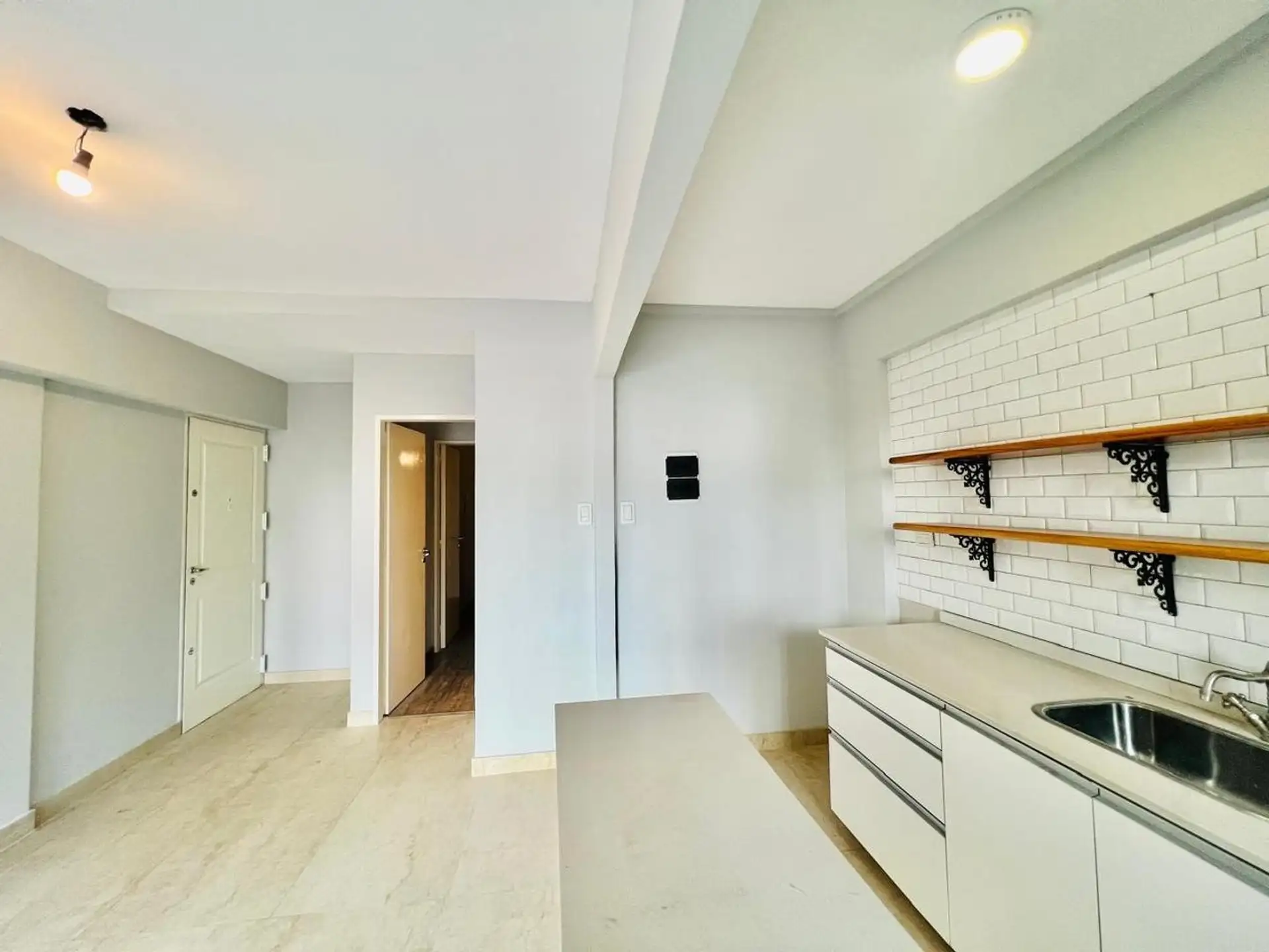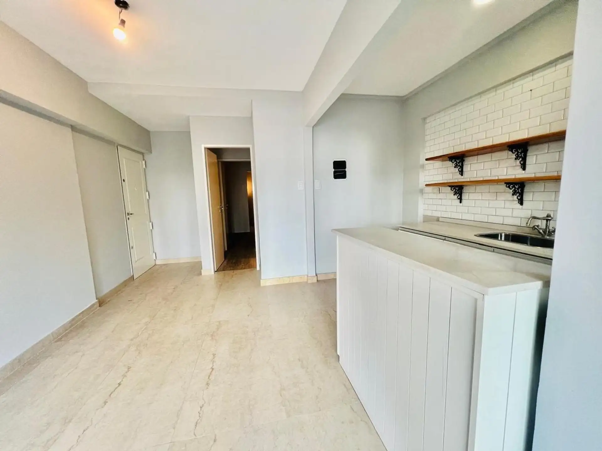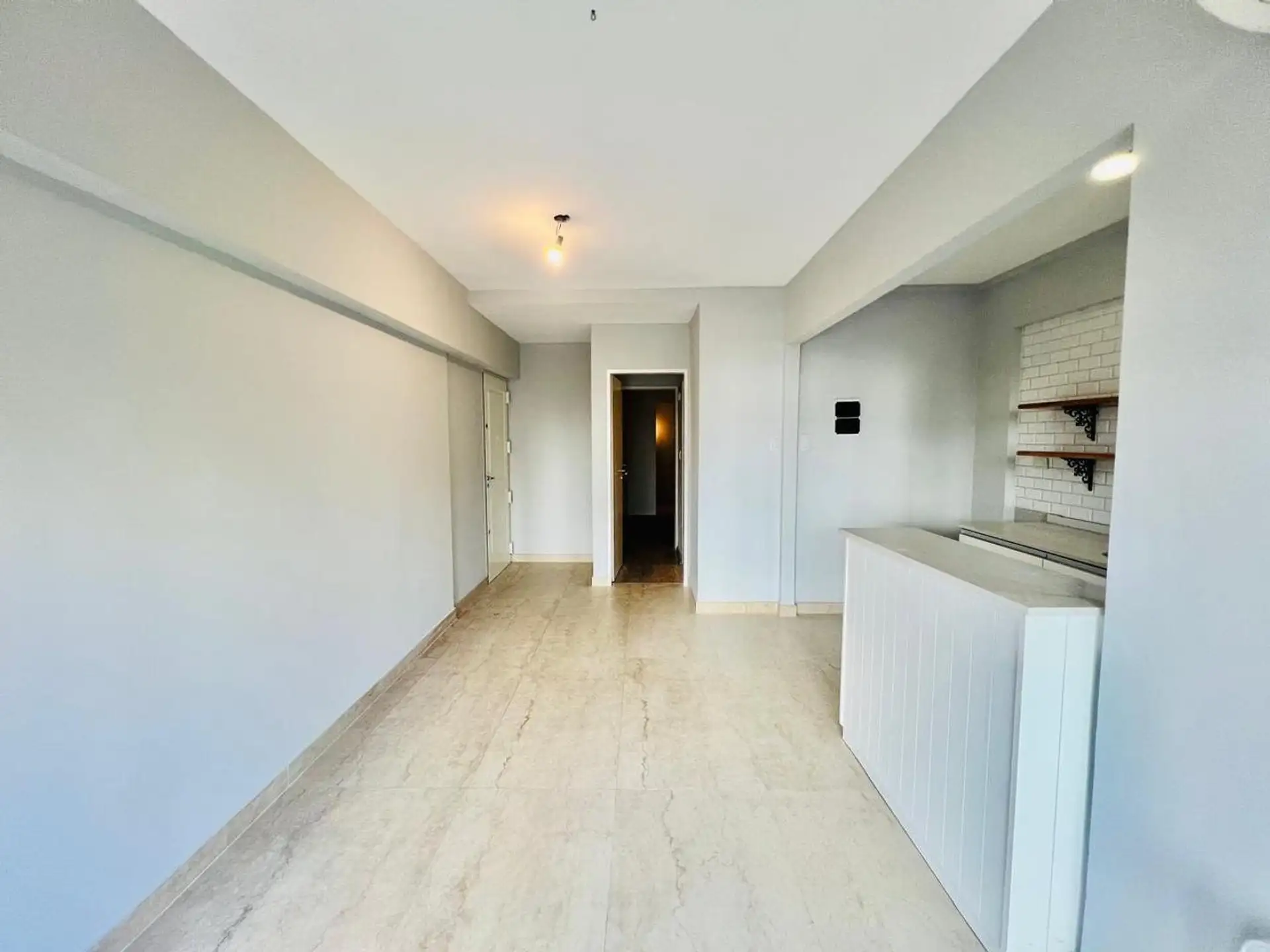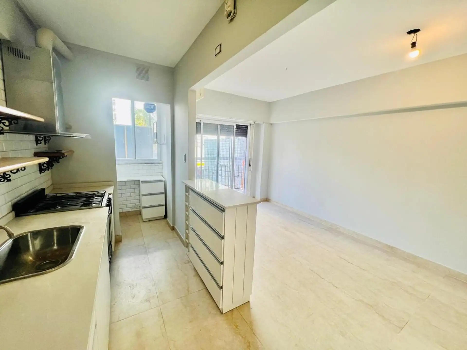 Departamento de 2 ambientes en Ramos Mejía, en primer piso al frente con ascensor. Living-comedor con cocina integrada separada por una barra y acceso al balcón al frente mediante puerta-ventana. Cocina con mesada de silestone, muebles bajo mesada y un espacio pequeño para lavadero; baño completo en porcelanato y dormitorio amplio. Ubicado a 3 cuadras de la estación de Ramos Mejía y a metros de Av. de Mayo. Medidas aproximadas.
