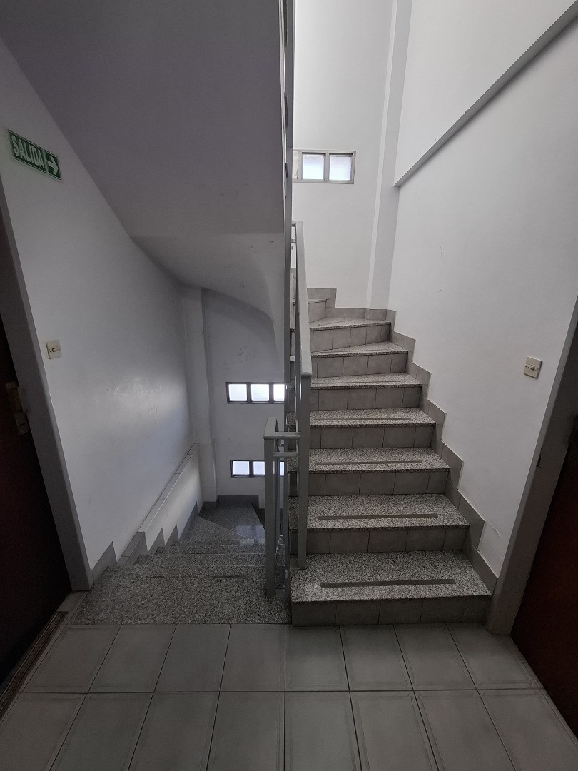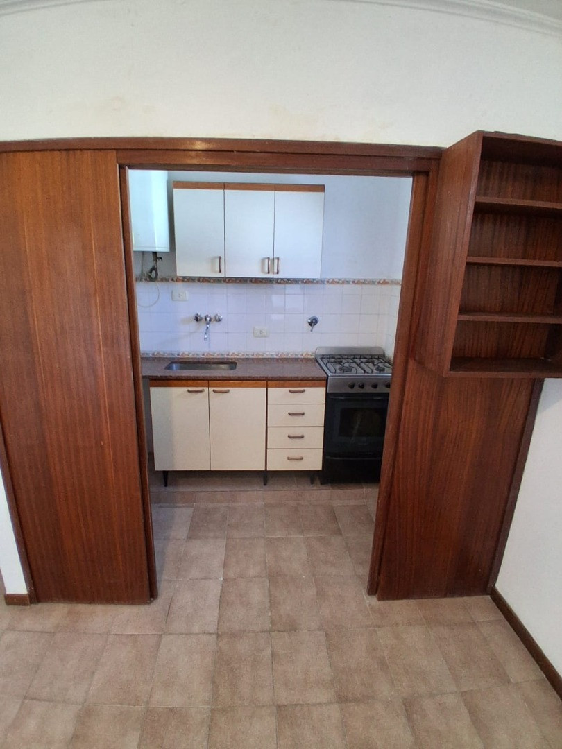 Departamento monoambiente, dividido en primer piso por escaleras, al contrafrente. Cuenta con ambiente con aire acondicionado instalado, cocina separada con muebles completos y cocina a gas, y baño completo con ducha. Tiene recepción o comedor diario y terraza con lavadero común para conectar lavarropas.