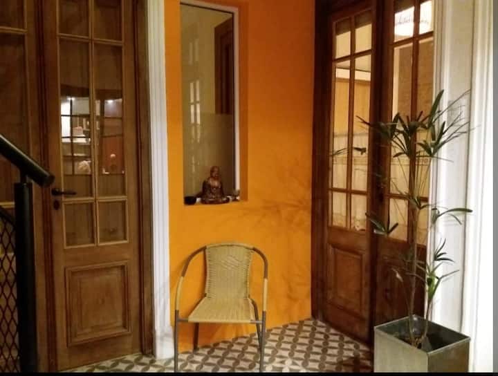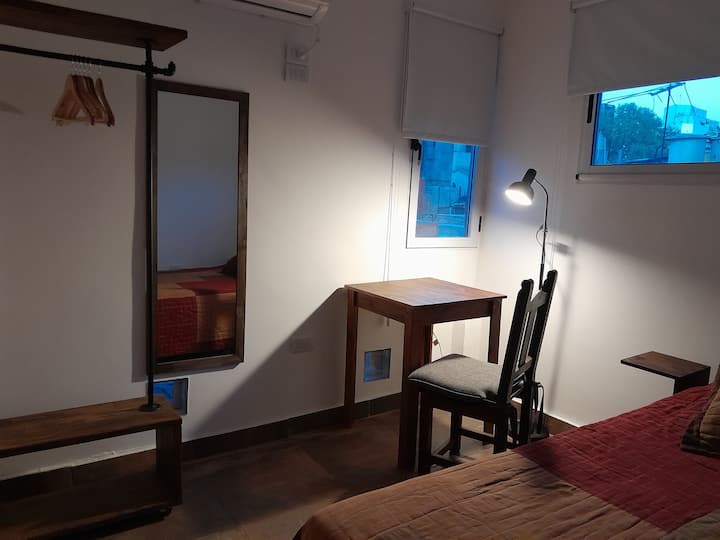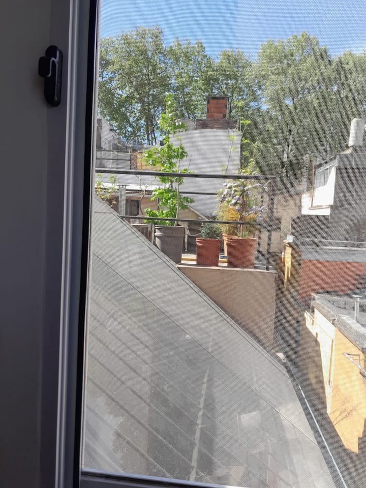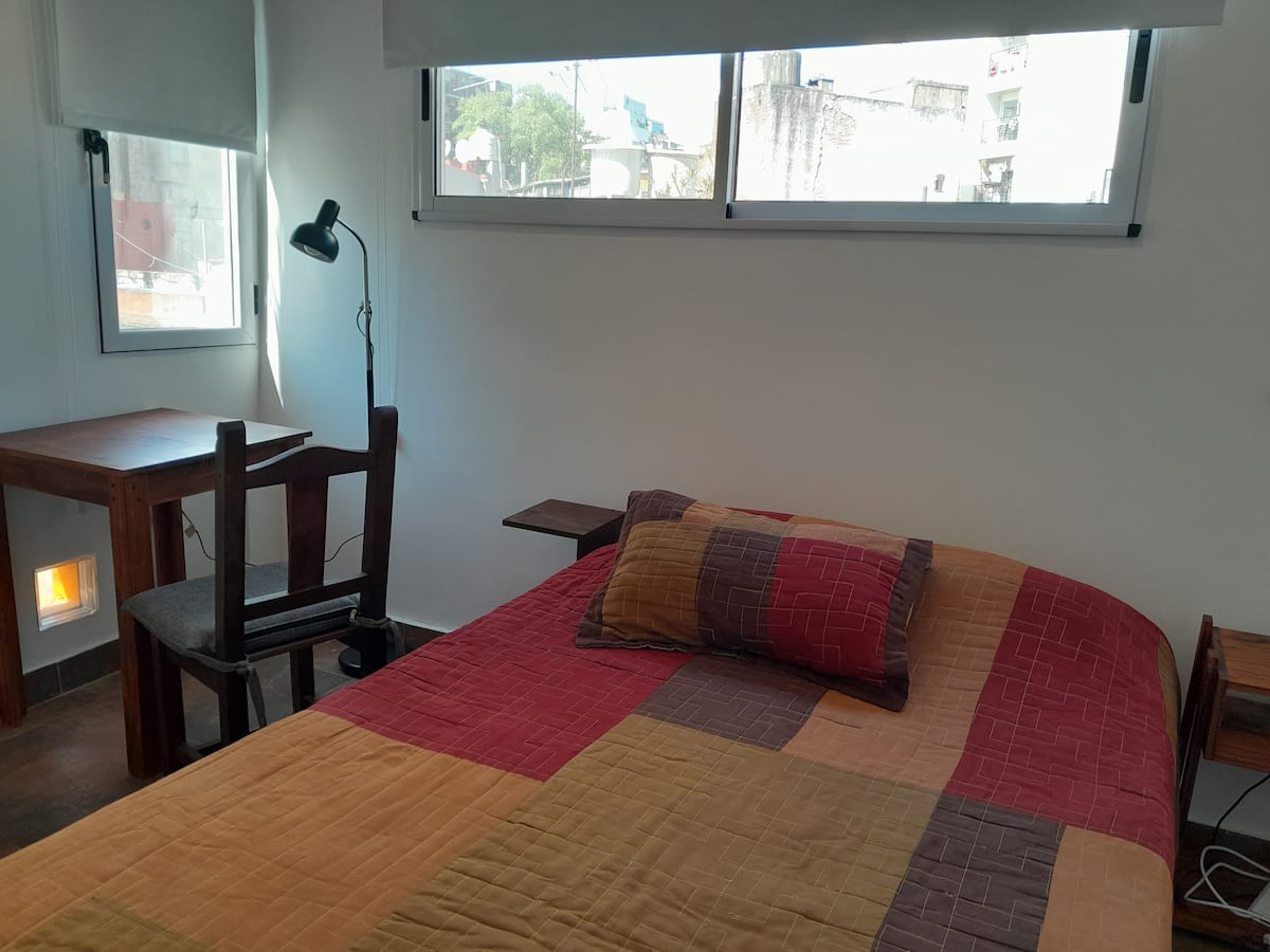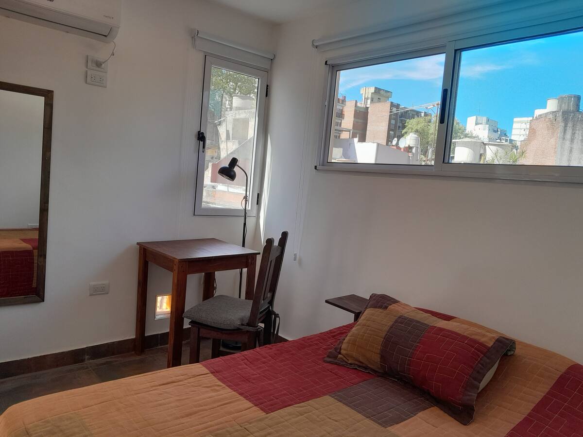 Habitación en un departamento con ingreso casi independiente, con acceso por escalera desde el 1er piso. La habitación se ubica sobre la terraza y cuenta con baño contiguo de uso casi exclusivo, mientras que hay otro baño en planta baja. En el inmueble hay 2 cocinas, una destinada al uso exclusivo de los huéspedes. Ubicación en una avenida con comercios y transporte público en La Paternal.