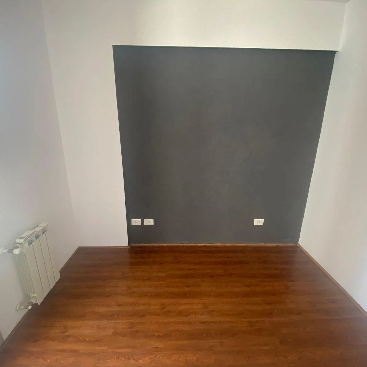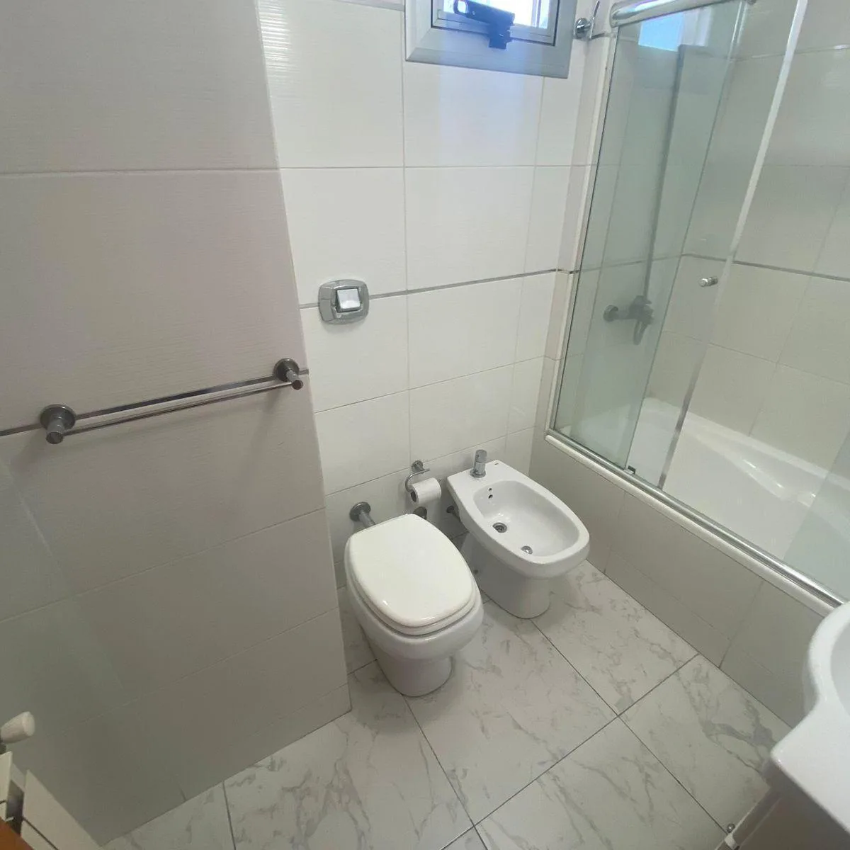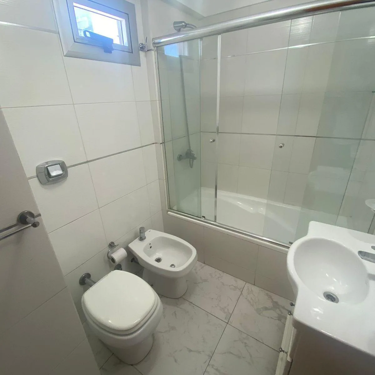 Departamento de 2 ambientes al contrafrente en Lanús Oeste, con balcón. Cuenta con cocina comedor con artefacto de cocina y extractor de aire, aire acondicionado frío, hall con placard y calefacción por radiadores en todos los ambientes. La habitación tiene pisos de madera flotante, puerta balcón y aire acondicionado frío-calor, y el baño completo incluye vanitory, bidet y bañera con mampara de vidrio templado. El balcón aterrazado tiene parrilla a gas, mesada de granito, bacha de acero inoxidab