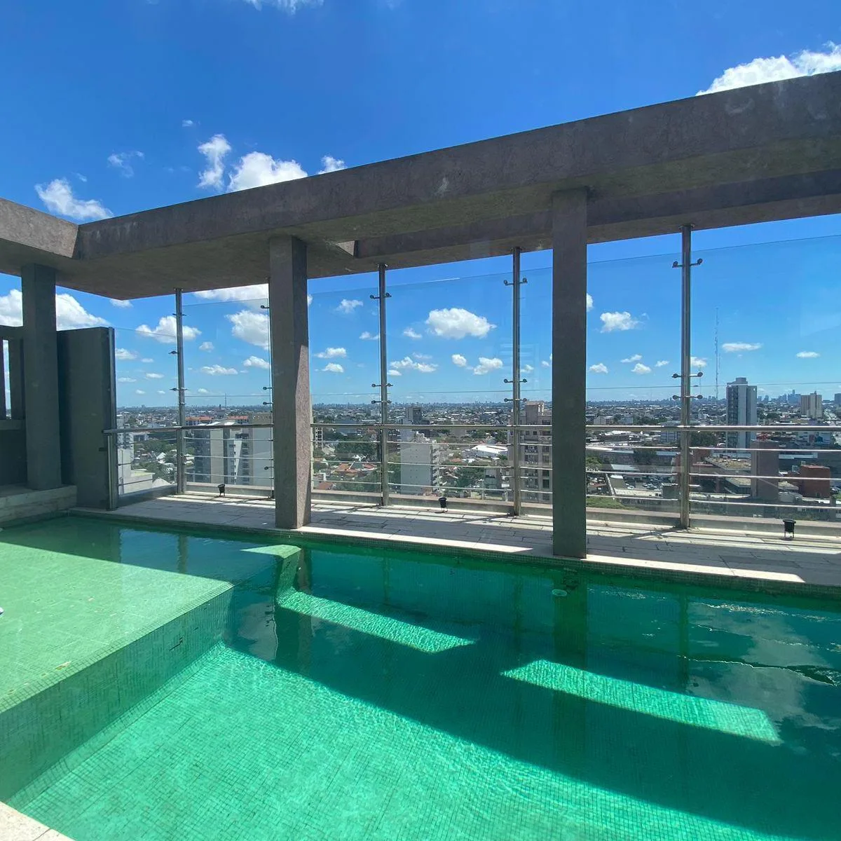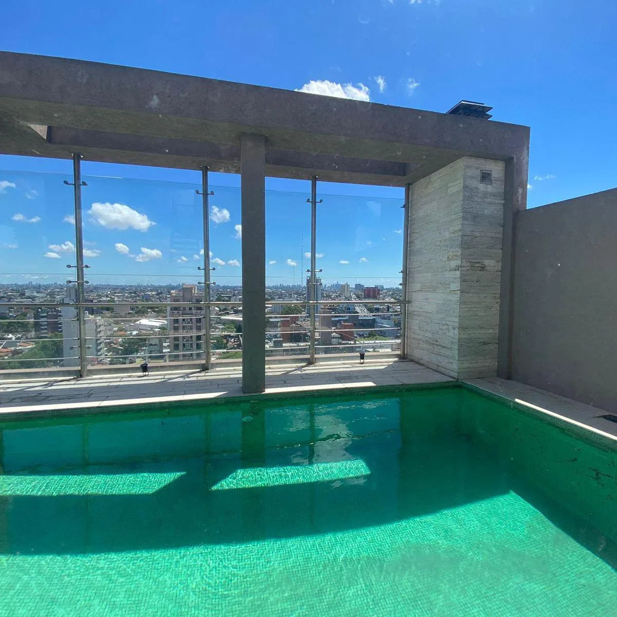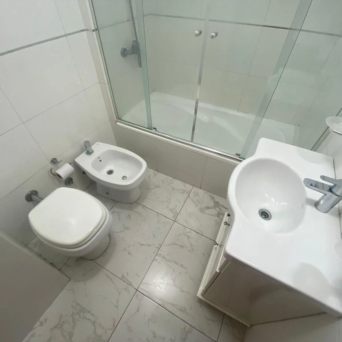 Departamento de 2 ambientes al contrafrente en Lanús Oeste, con balcón. Cuenta con cocina comedor con artefacto de cocina y extractor de aire, aire acondicionado frío, hall con placard y calefacción por radiadores en todos los ambientes. La habitación tiene pisos de madera flotante, puerta balcón y aire acondicionado frío-calor, y el baño completo incluye vanitory, bidet y bañera con mampara de vidrio templado. El balcón aterrazado tiene parrilla a gas, mesada de granito, bacha de acero inoxidab