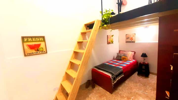 Habitación en entrepiso compartido. El espacio se utiliza en conjunto con amigos o familiares, con privacidad dentro del cuarto. Se consulta el precio para 3 personas.