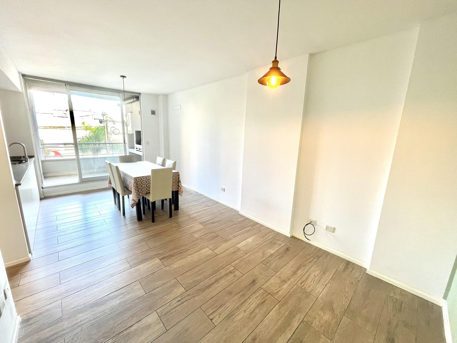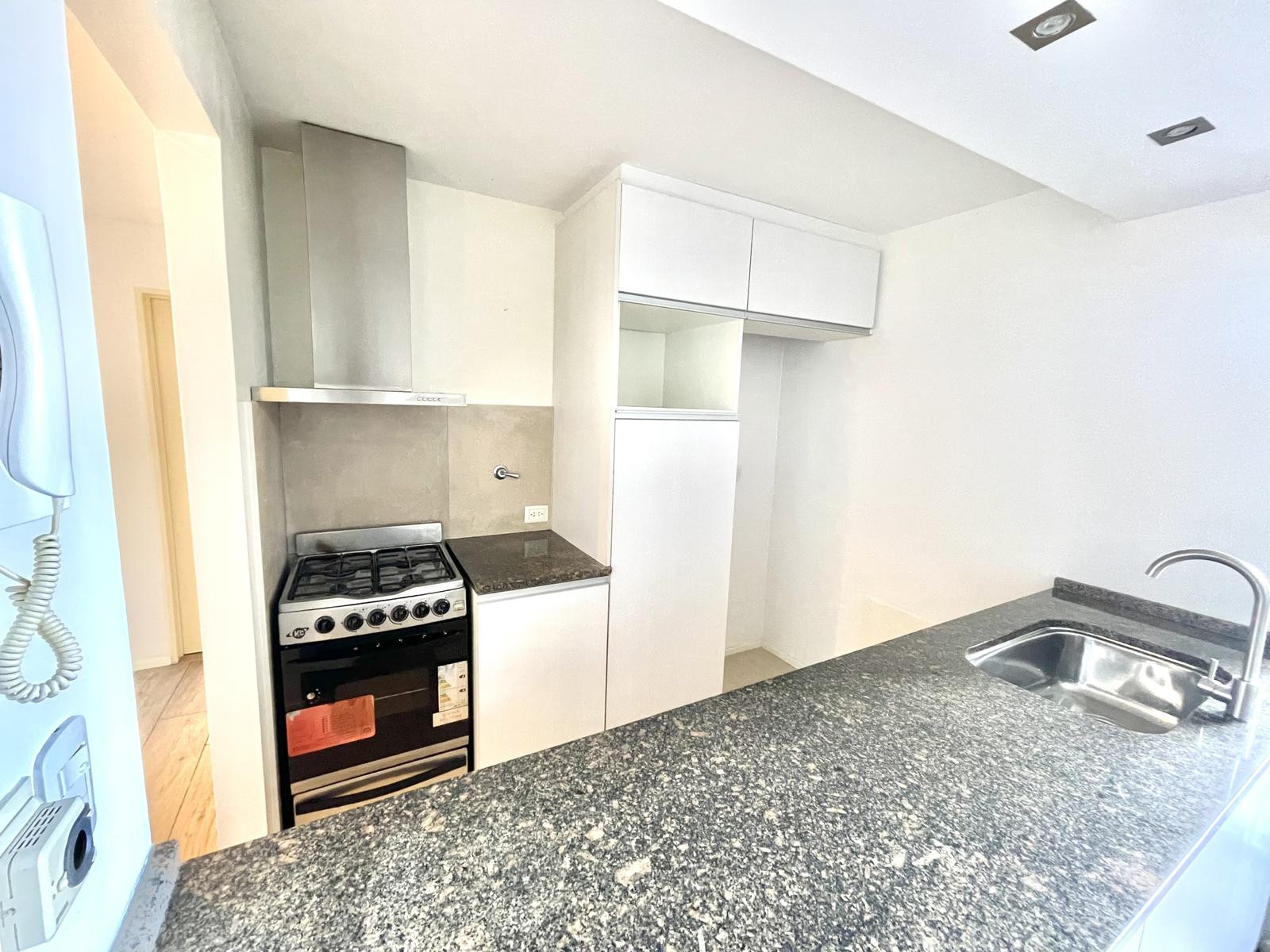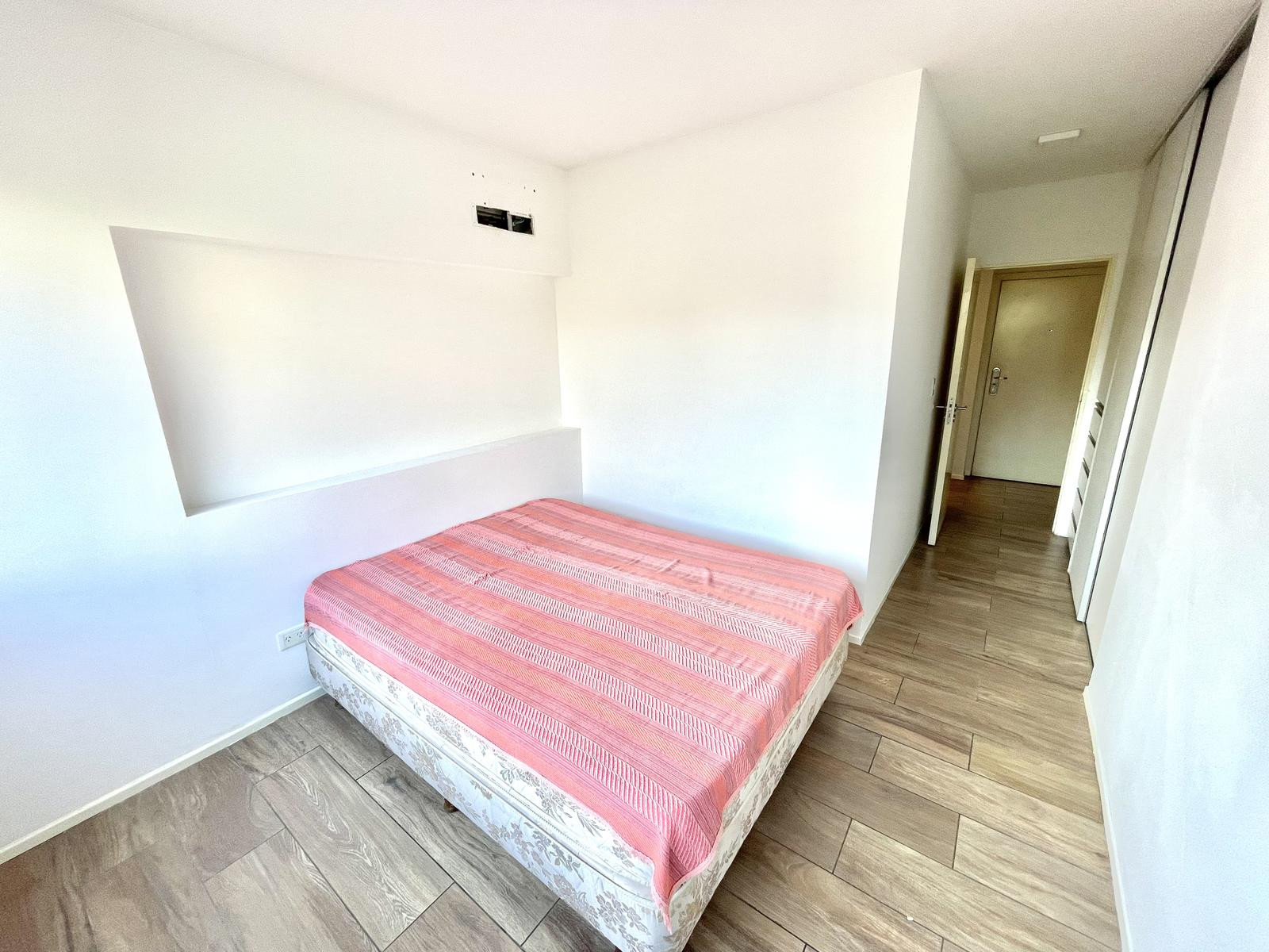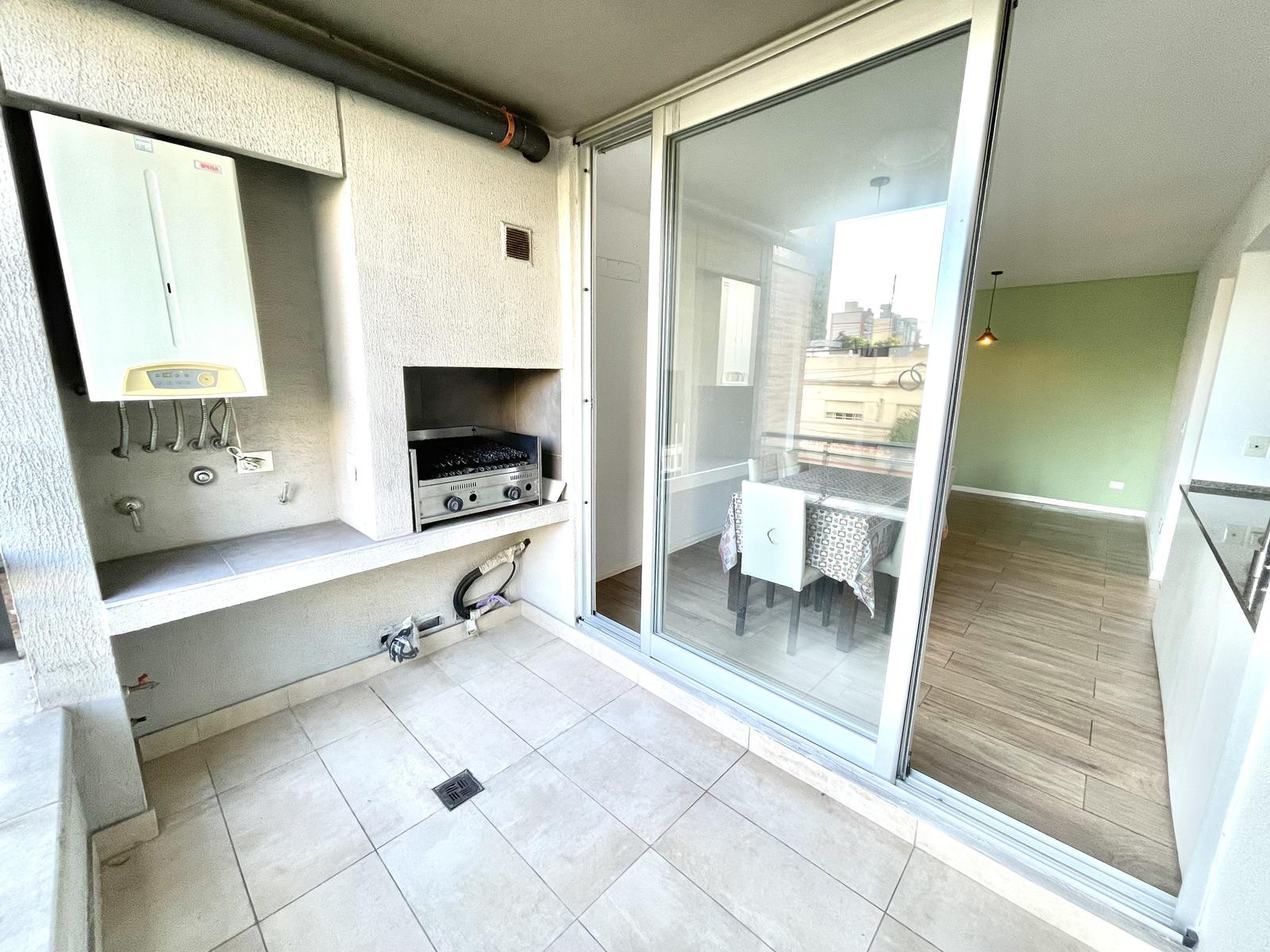 Departamento de 2 ambientes con 1 dormitorio, cochera y balcón. Cuenta con estar con cocina semintegrada con barra desayunadora, mueble bajo y alacena, dormitorio con placard y baño completo. El balcón tiene parrilla a gas. Incluye calefacción por piso radiante con caldera individual y puerta de acceso blindada. El edificio tiene salón de reuniones, gimnasio y piscina.