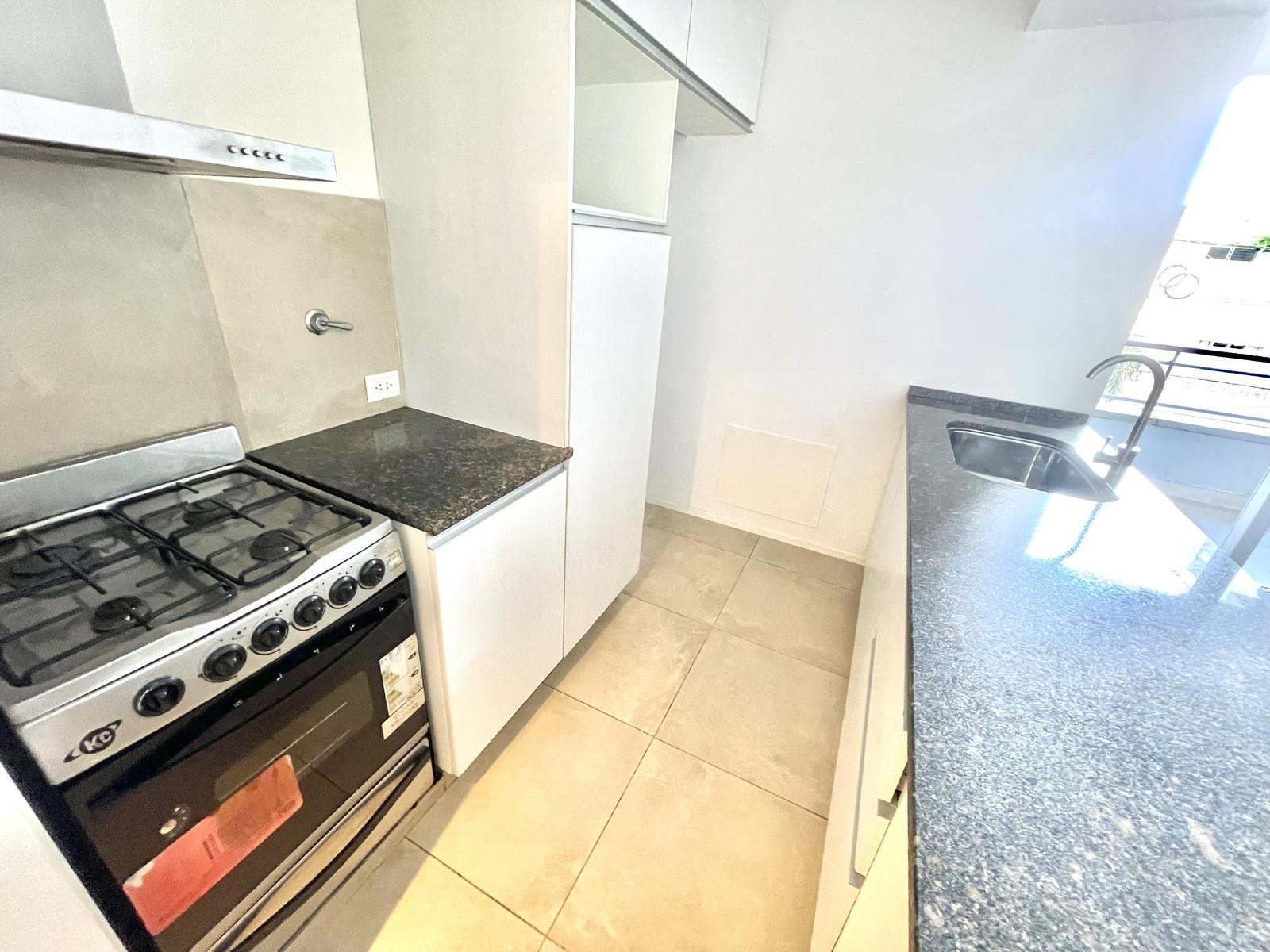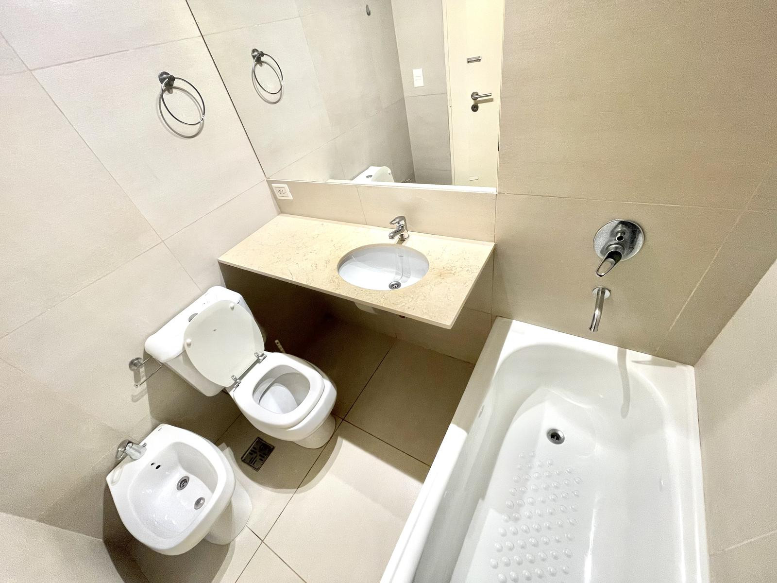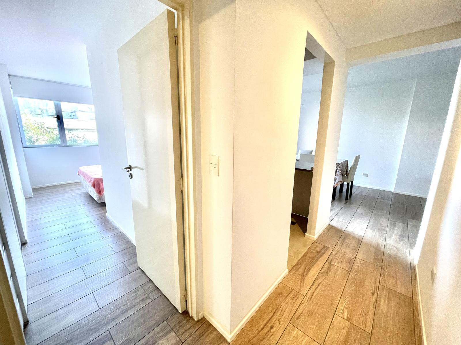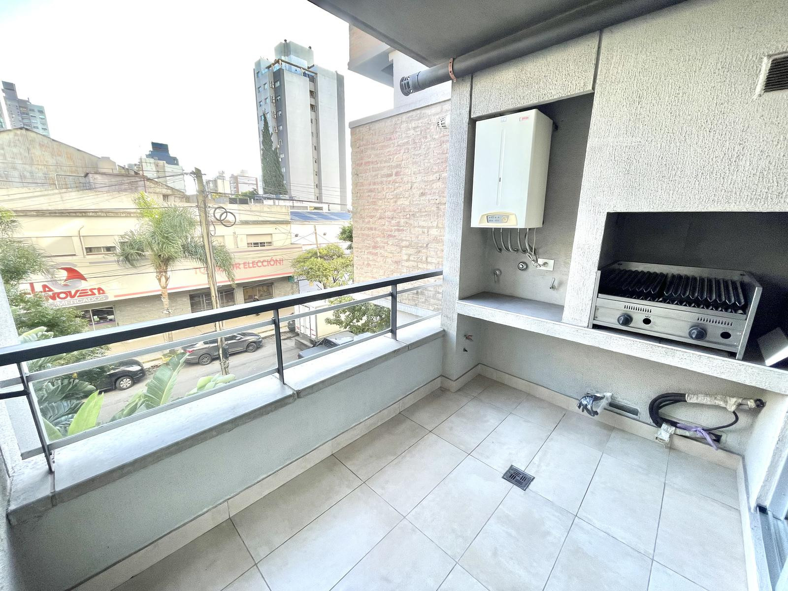 Departamento de 2 ambientes con 1 dormitorio, cochera y balcón. Cuenta con estar con cocina semintegrada con barra desayunadora, mueble bajo y alacena, dormitorio con placard y baño completo. El balcón tiene parrilla a gas. Incluye calefacción por piso radiante con caldera individual y puerta de acceso blindada. El edificio tiene salón de reuniones, gimnasio y piscina.