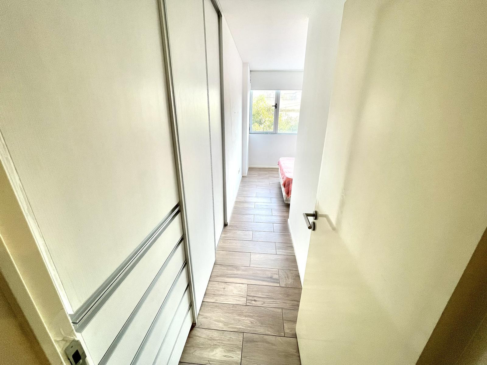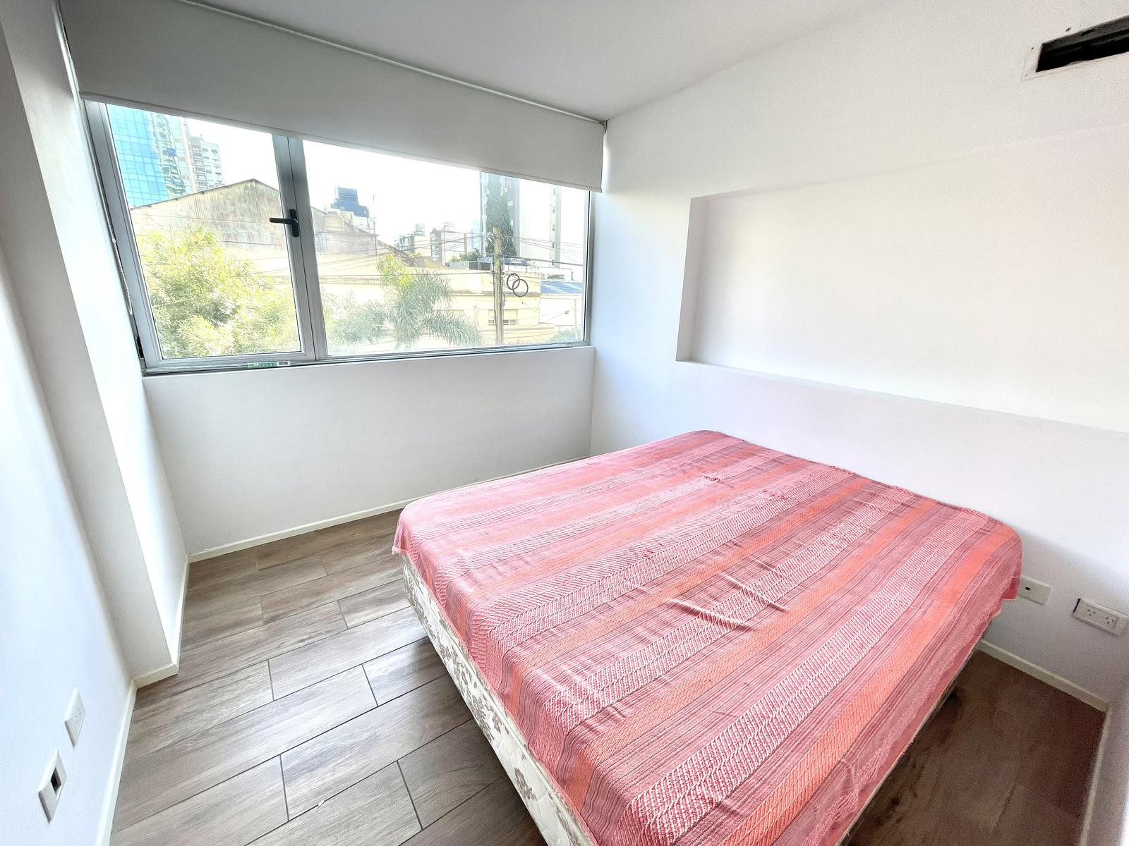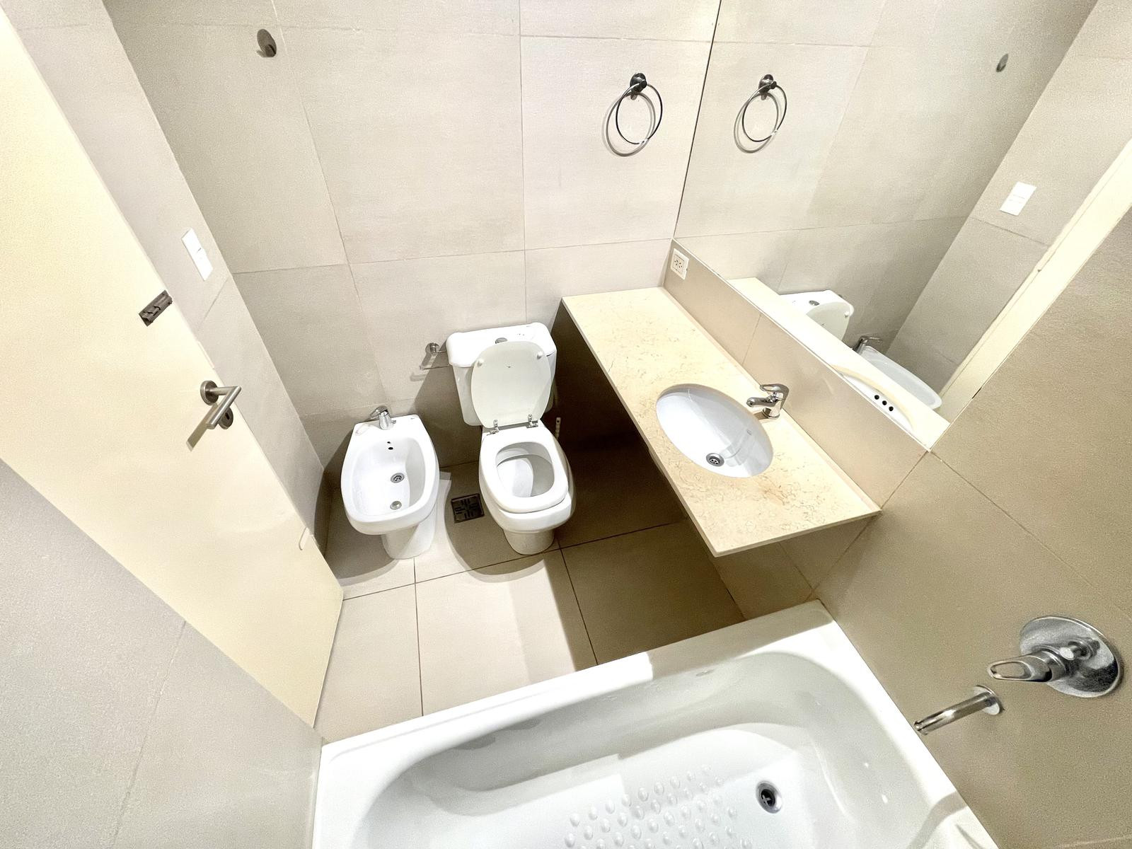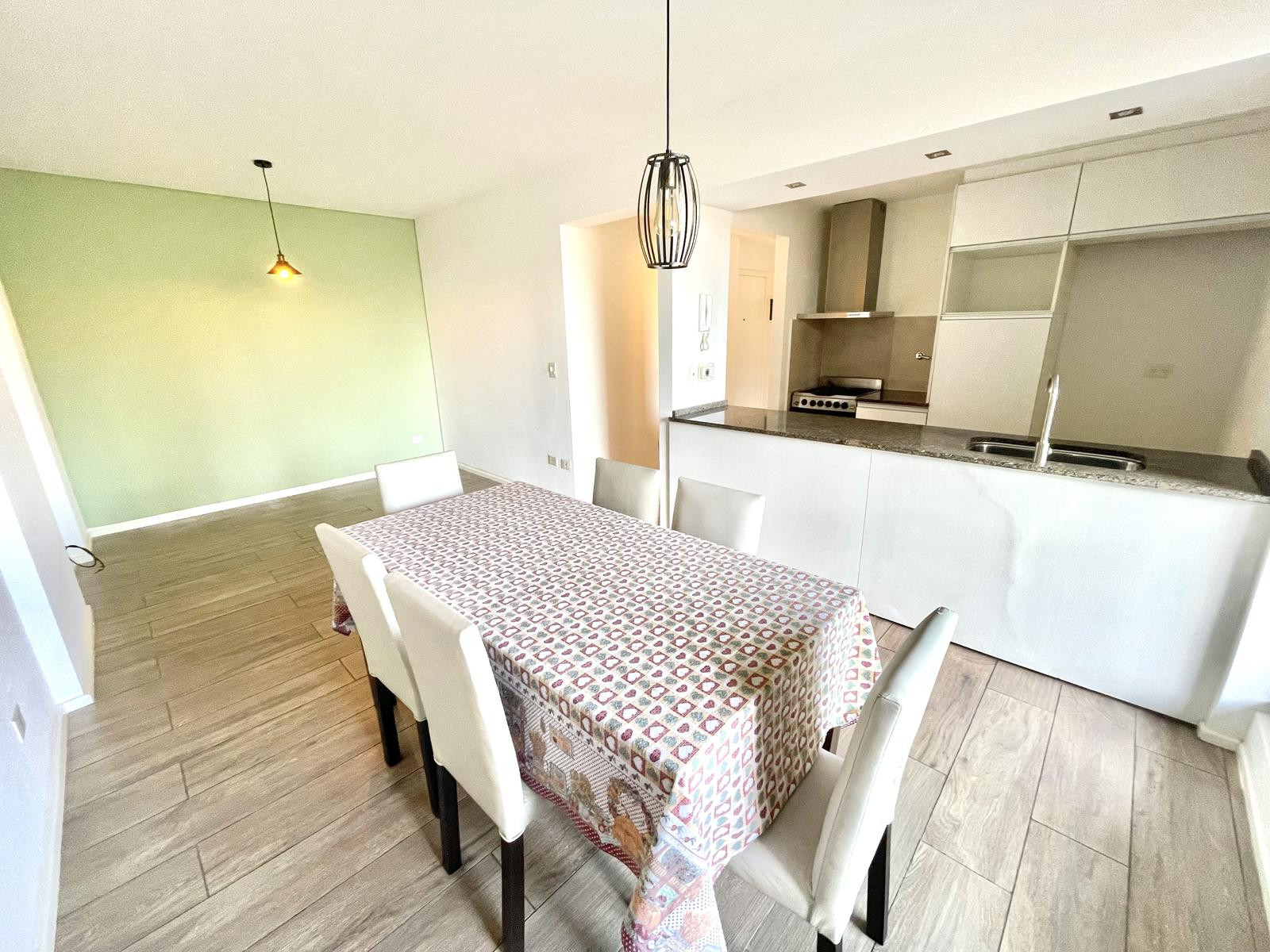 Departamento de 2 ambientes con 1 dormitorio, cochera y balcón. Cuenta con estar con cocina semintegrada con barra desayunadora, mueble bajo y alacena, dormitorio con placard y baño completo. El balcón tiene parrilla a gas. Incluye calefacción por piso radiante con caldera individual y puerta de acceso blindada. El edificio tiene salón de reuniones, gimnasio y piscina.