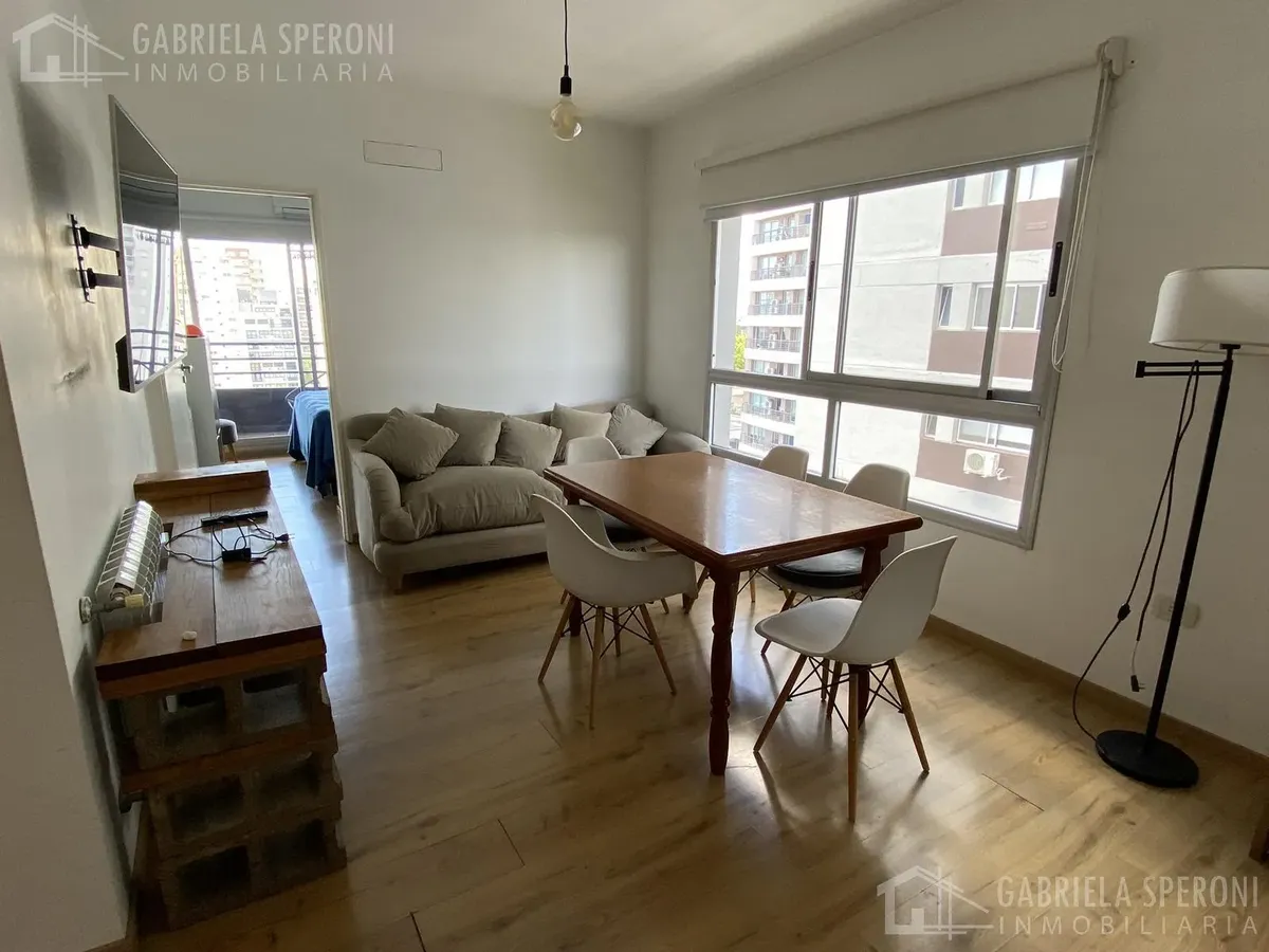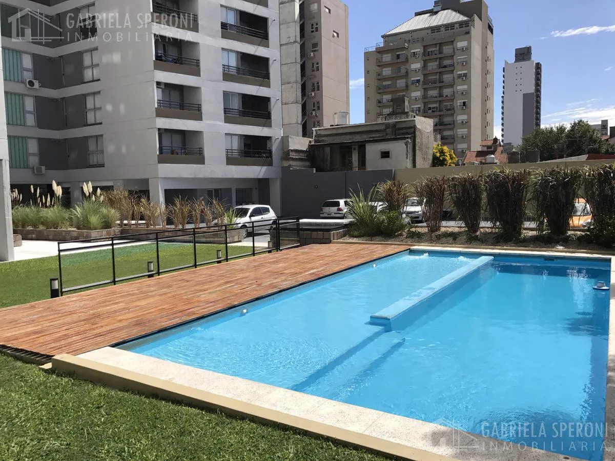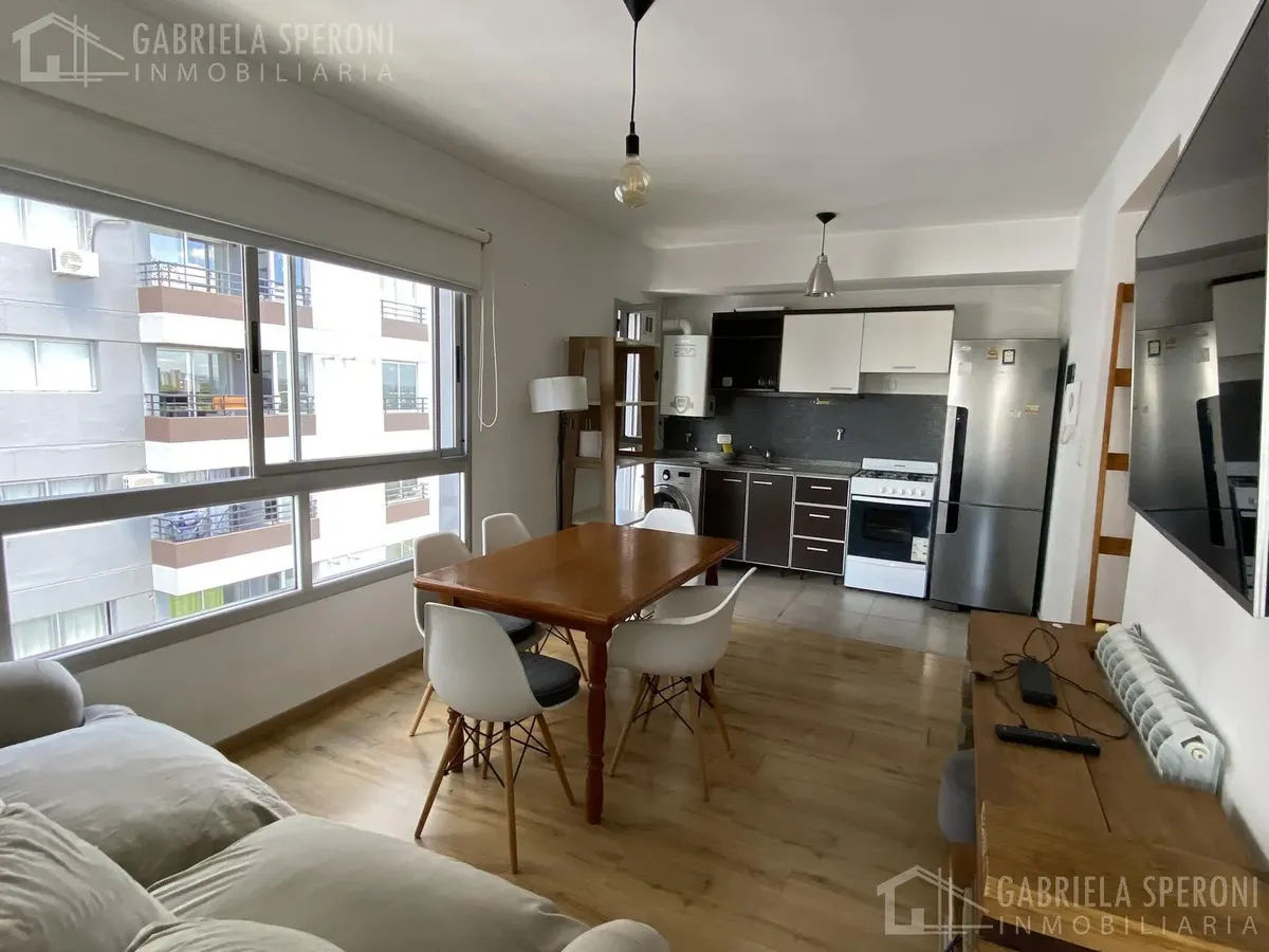 Departamento de 2 ambientes de 1 dormitorio, con equipamiento y muebles, ubicado en Torre Norte del edificio “Les Bruyeres” en Banfield. Living comedor con pisos flotantes y cocina integrada con muebles bajo y alto mesada, grifería monocomando, mesada de granito y espacio para lavarropas; dormitorio con placard con interiores, pisos flotantes y salida a balcón. Baño completo con bañera, calefacción por radiadores y agua caliente provista por caldera dual. El edificio cuenta con solarium, gimnasi