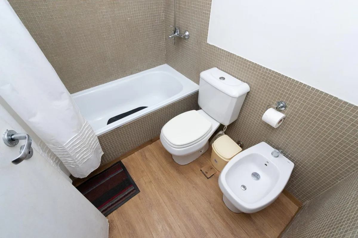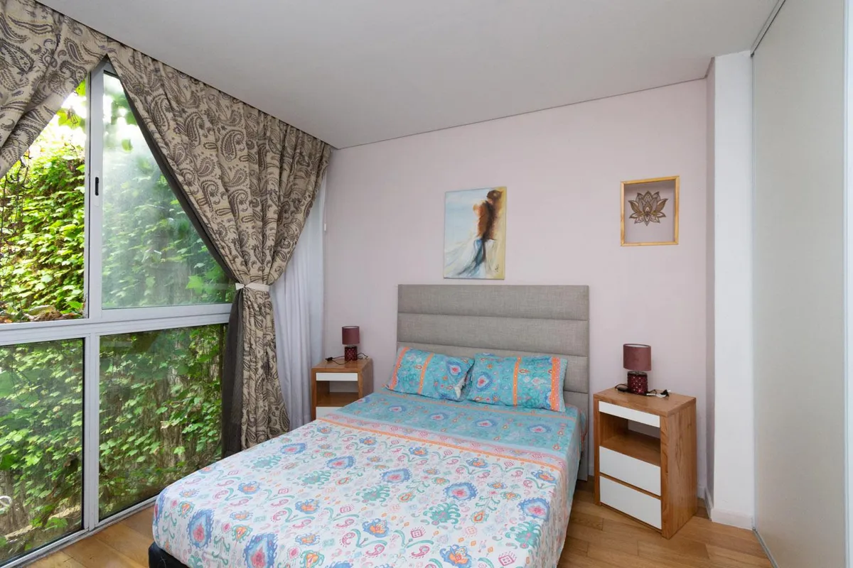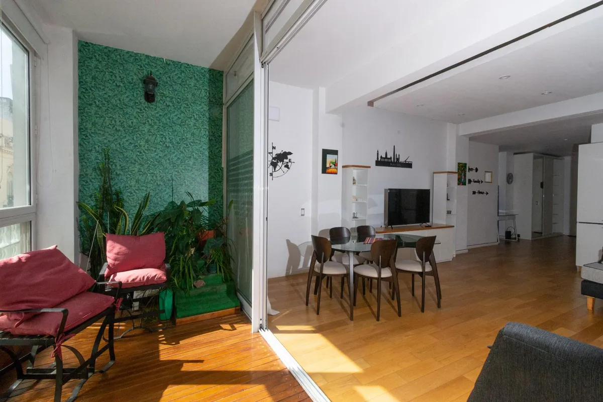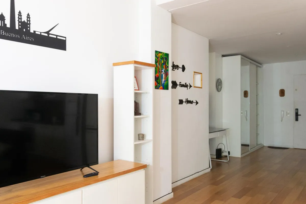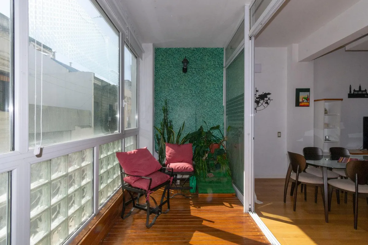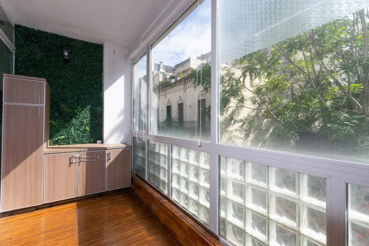 Departamento de 2 ambientes de 1 dormitorio en Monserrat, con balcón cerrado tipo jardín de invierno. Dispone de living comedor con ventanales, cocina integrada con horno y anafe eléctricos, extractor, espacio para heladera y microondas empotrado. Tiene baño completo con bañera, placard en el dormitorio y ventilación cruzada con aire acondicionado en ambos ambientes.