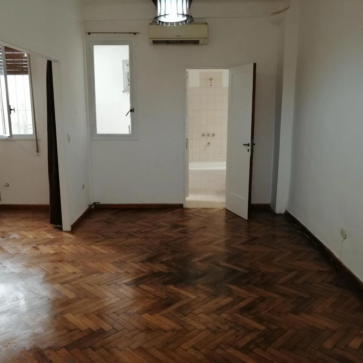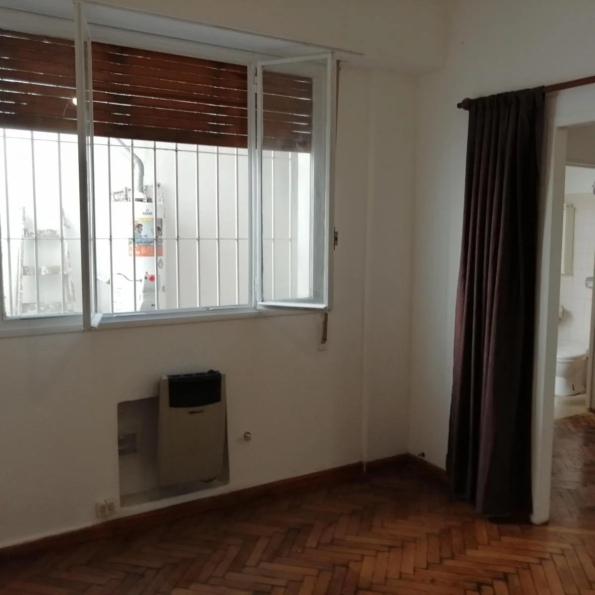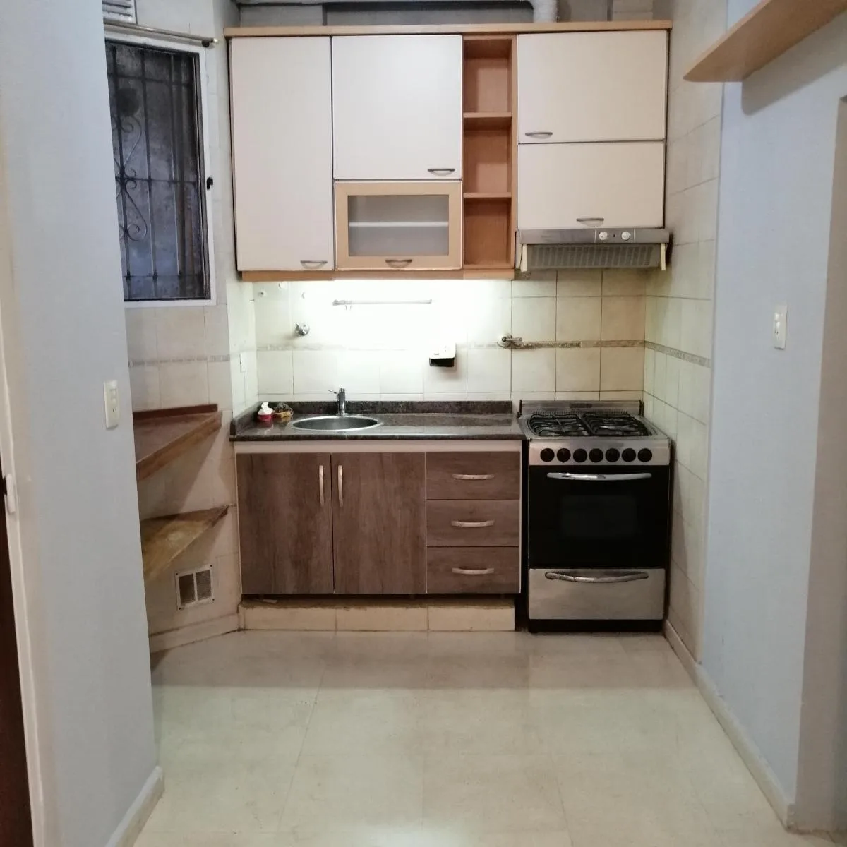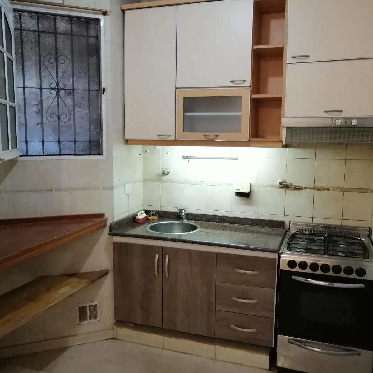 Departamento de 2 ambientes en planta baja, tipo PH, en Monserrat. Tiene 52 m² totales (44 m² cubiertos) y una antigüedad de 50 años. Cocina integrada con bajo mesada, alacena y espacio para heladera y microondas; living comedor con aire acondicionado frío-calor y pisos de parqué; habitación con placard empotrado y estufa tiro-balanceado. El baño completo con bañera tiene salida al patio. Patio semi-techado con lugar para lavarropas y termo-tanque a gas, con ventana a aire luz del edificio. Chil