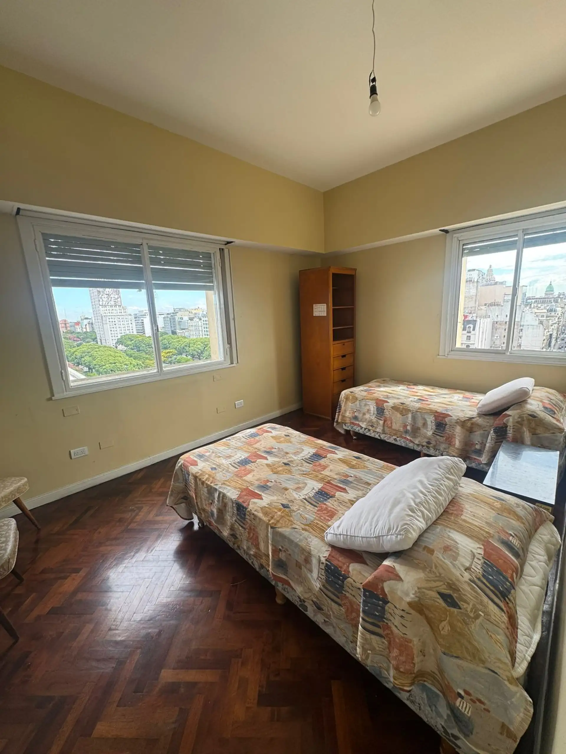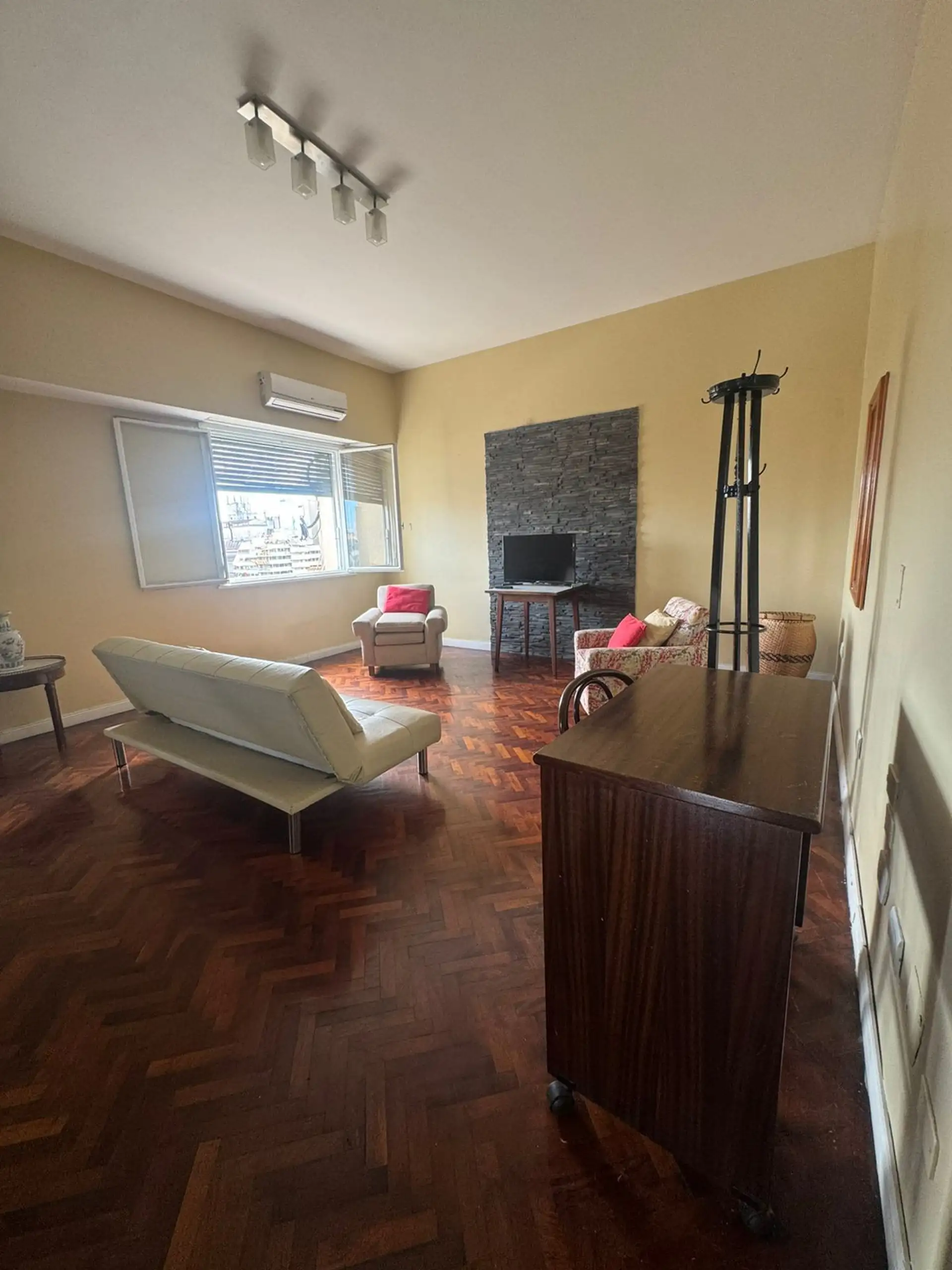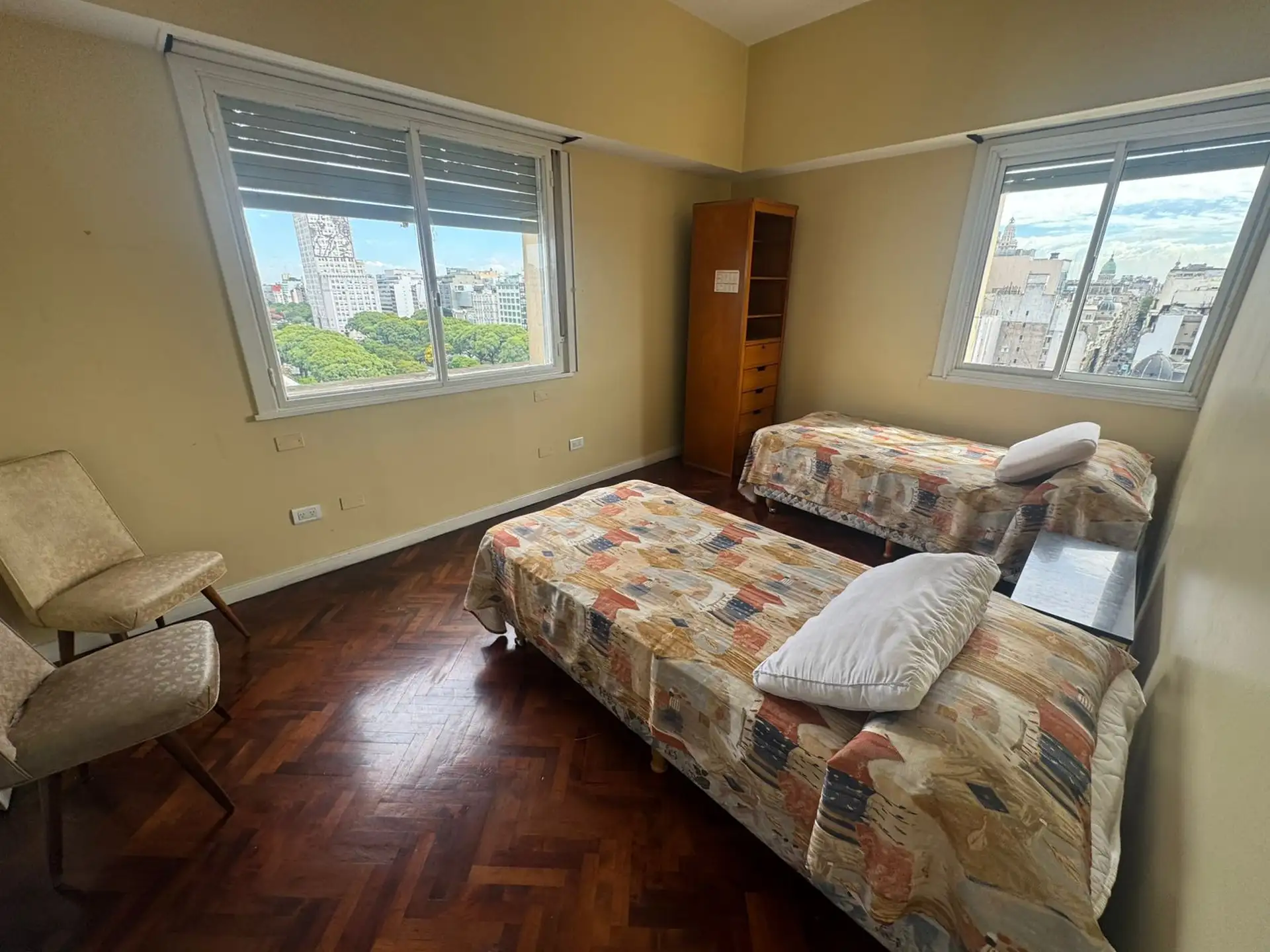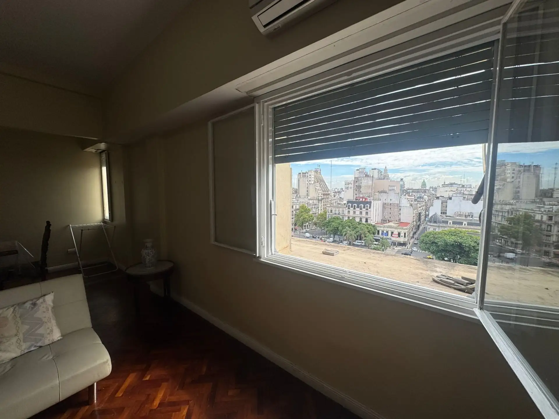 Departamento de 2 ambientes de 45 m² en el piso 9, al frente, con vista abierta a Av. 9 de Julio. Se alquila temporariamente y está amoblado y equipado, hasta 3 huéspedes. Cuenta con aire acondicionado; living/comedor con mesa y 6 sillas, sofá cama, 2 sillones individuales y escritorio con TV led; escritorio de estudio; cocina con 4 hornallas y horno, vajilla completa y heladera con freezer; baño completo. El edificio tiene entrada electrónica y seguridad 24 hs. El alquiler mensual es de U$ 800
