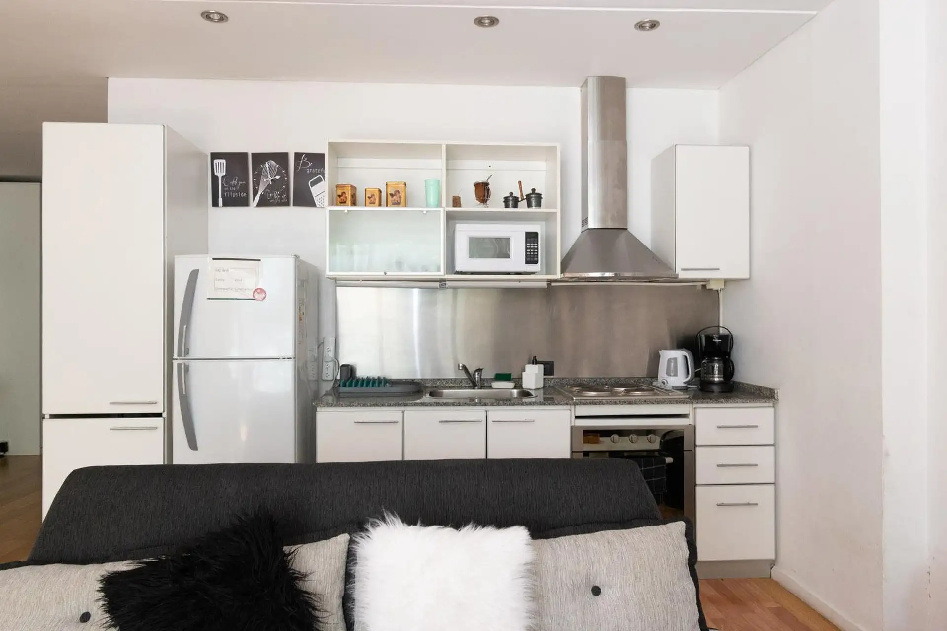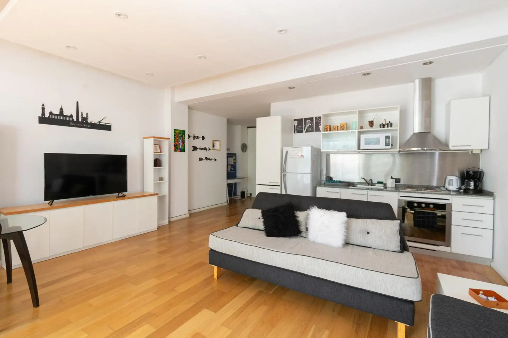 Departamento de 2 ambientes en San Telmo, con balcón cerrado tipo jardín de invierno. Cuenta con living-comedor con grandes ventanales, cocina integrada con horno y anafe eléctricos, extractor, espacio para heladera grande y microondas empotrado. Tiene 1 dormitorio con placard de piso a techo, baño completo con bañera y mueble de lavabo en madera maciza, ventilación cruzada y aire acondicionado en ambos ambientes. El edificio es moderno, de pocos pisos, con cerradura inteligente y ascensor; tien