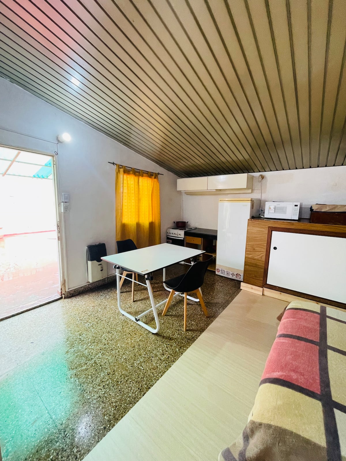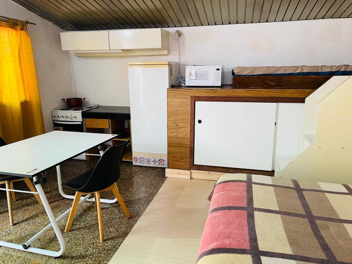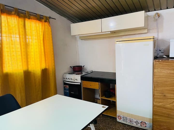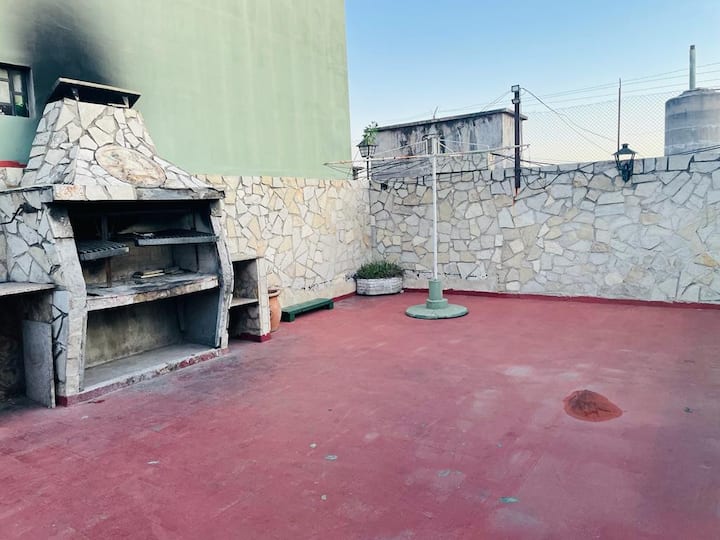 Departamento en Nueva Pompeya con acceso a patio y parrilla. Se ubica en planta baja. Cuenta con cama doble y cama individual, baño con ducha y cocina. Incluye acceso al departamento y al patio.