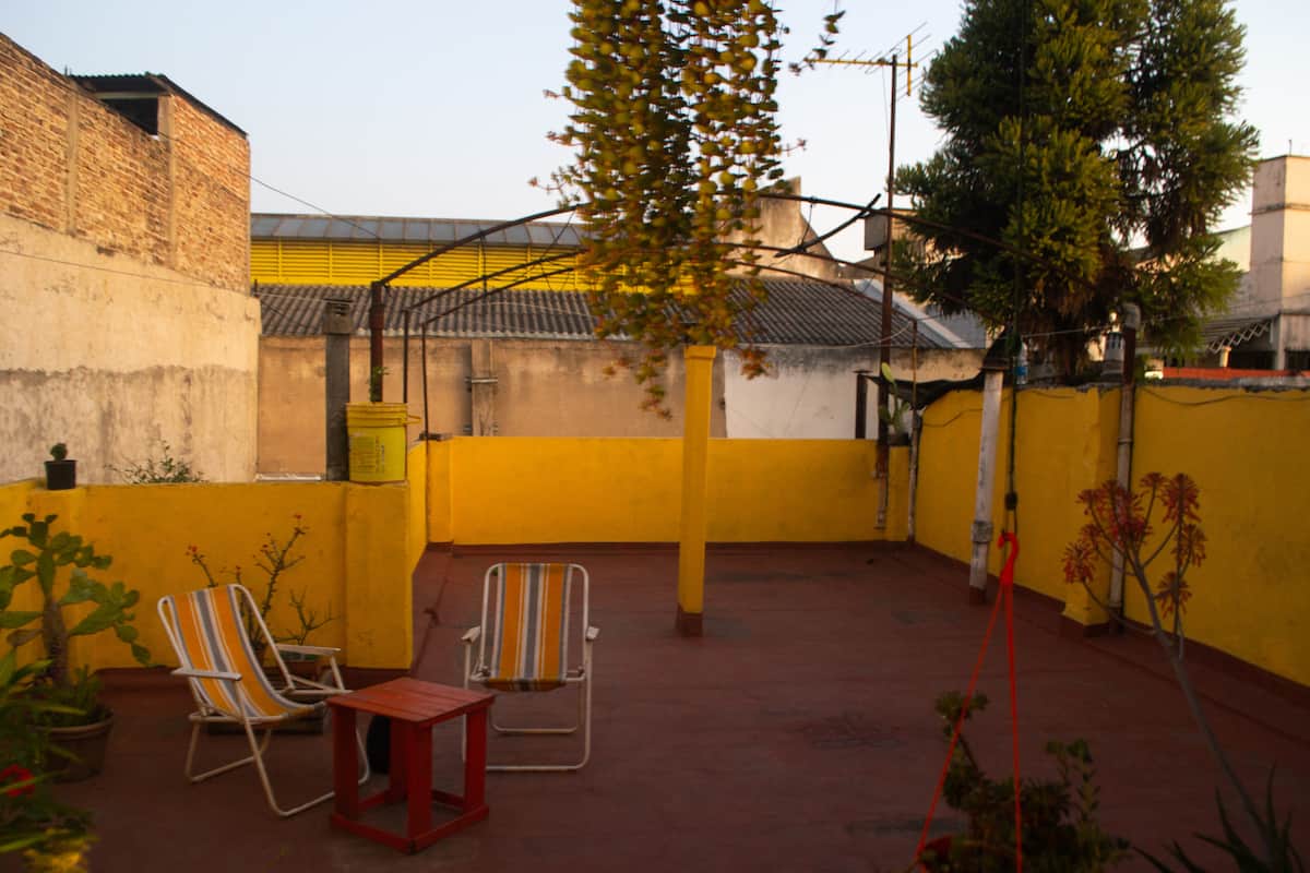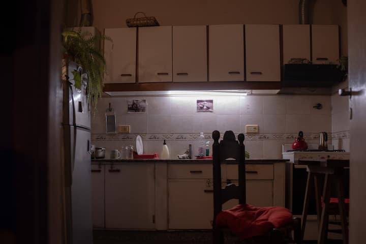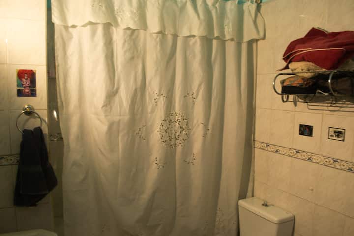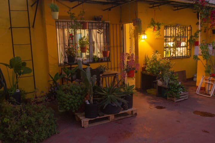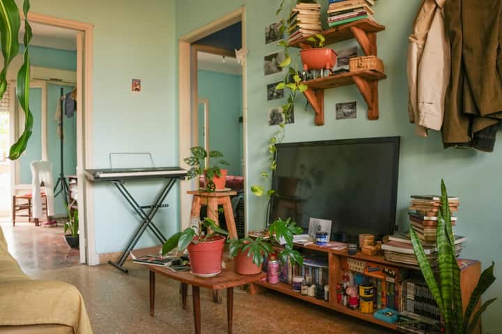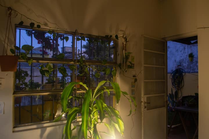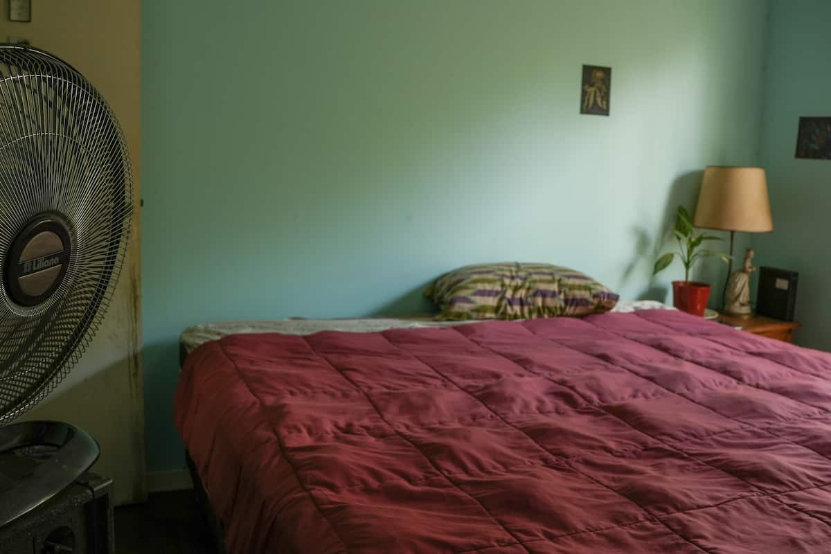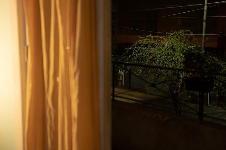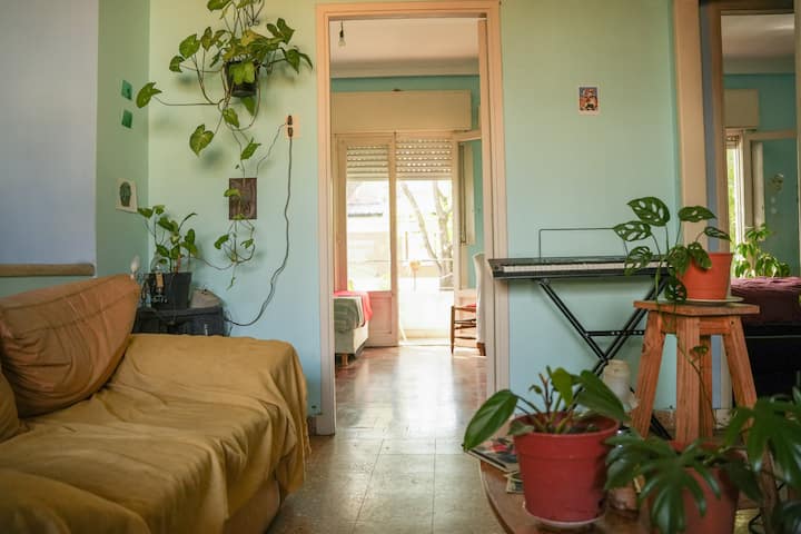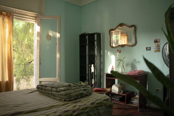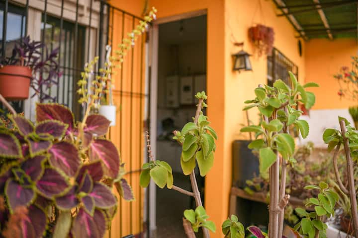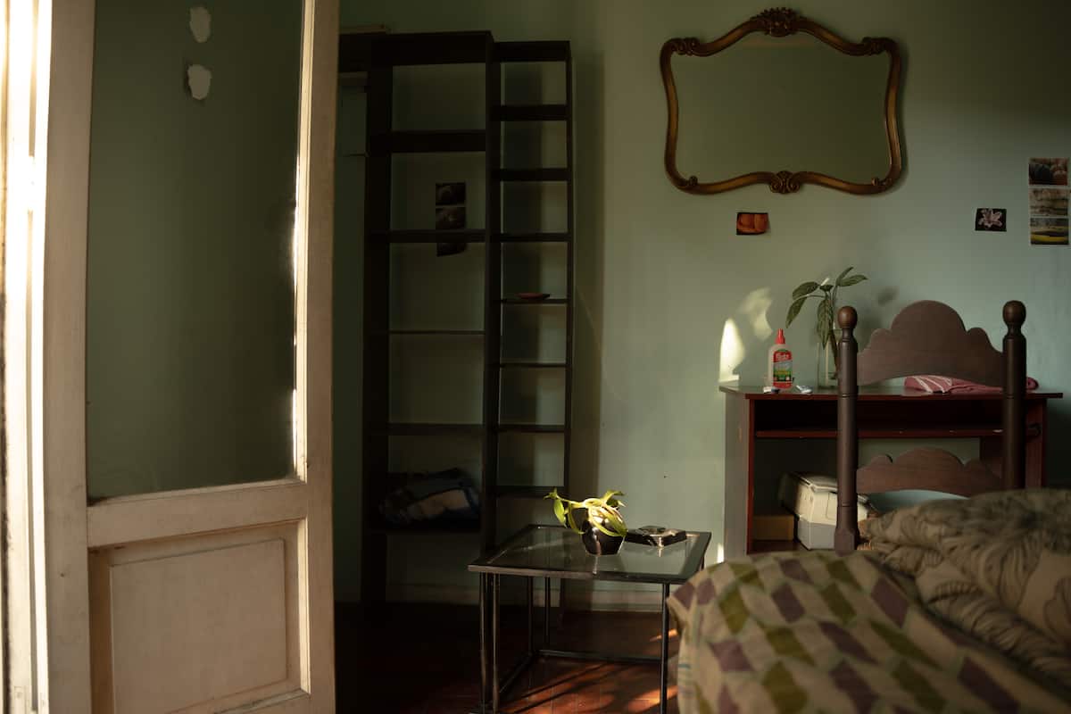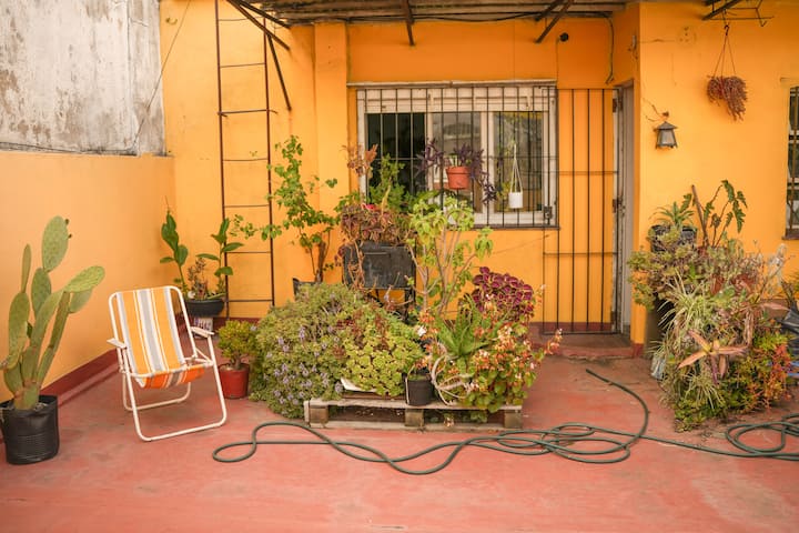 Habitación en PH de 3 ambientes en Nueva Pompeya, en 1er piso, con patio y balcón. El espacio se integra a un departamento compartido con baño, living, cocina, terraza y áreas comunes. La habitación incluye separador tipo biblioteca con placard, ventilador, escritorio, mesa, lámpara y cama de 2 plazas (1,40x1,90), con llave propia.