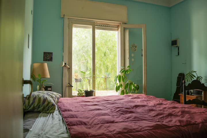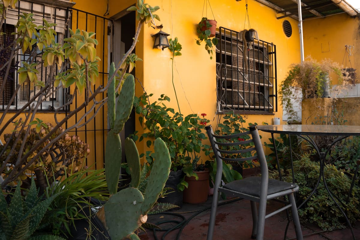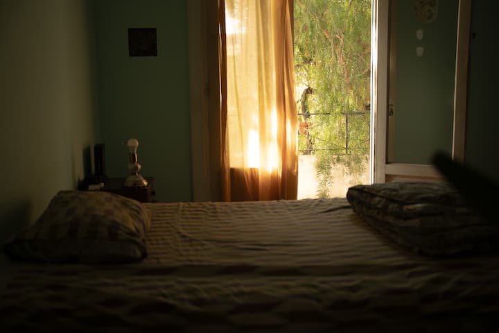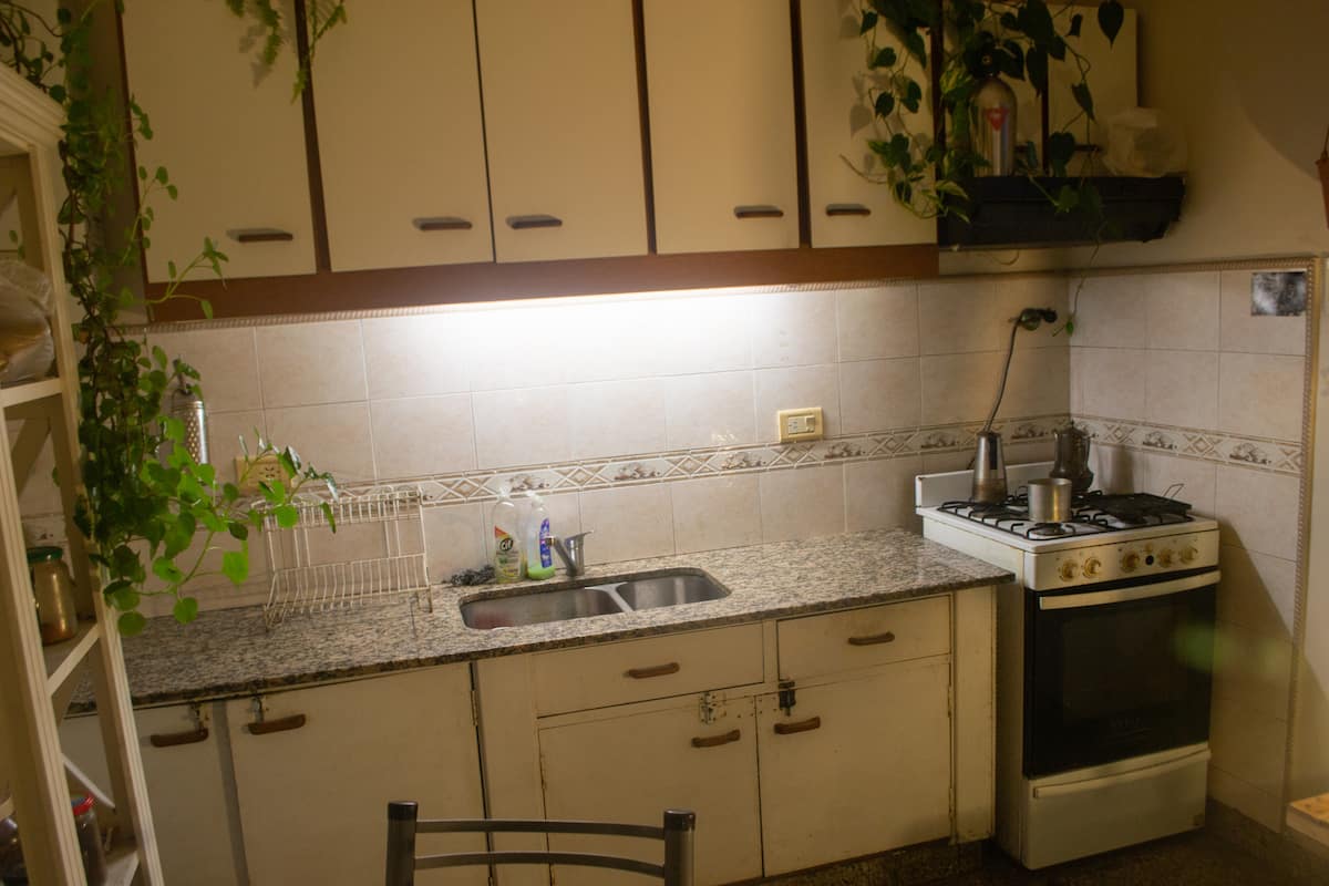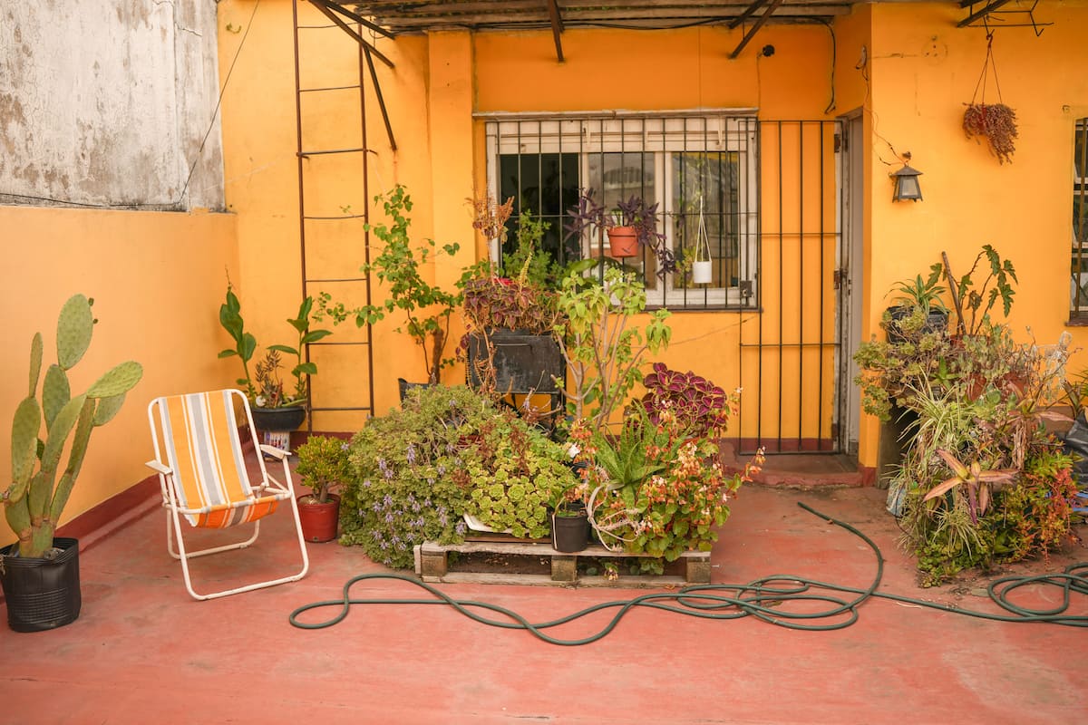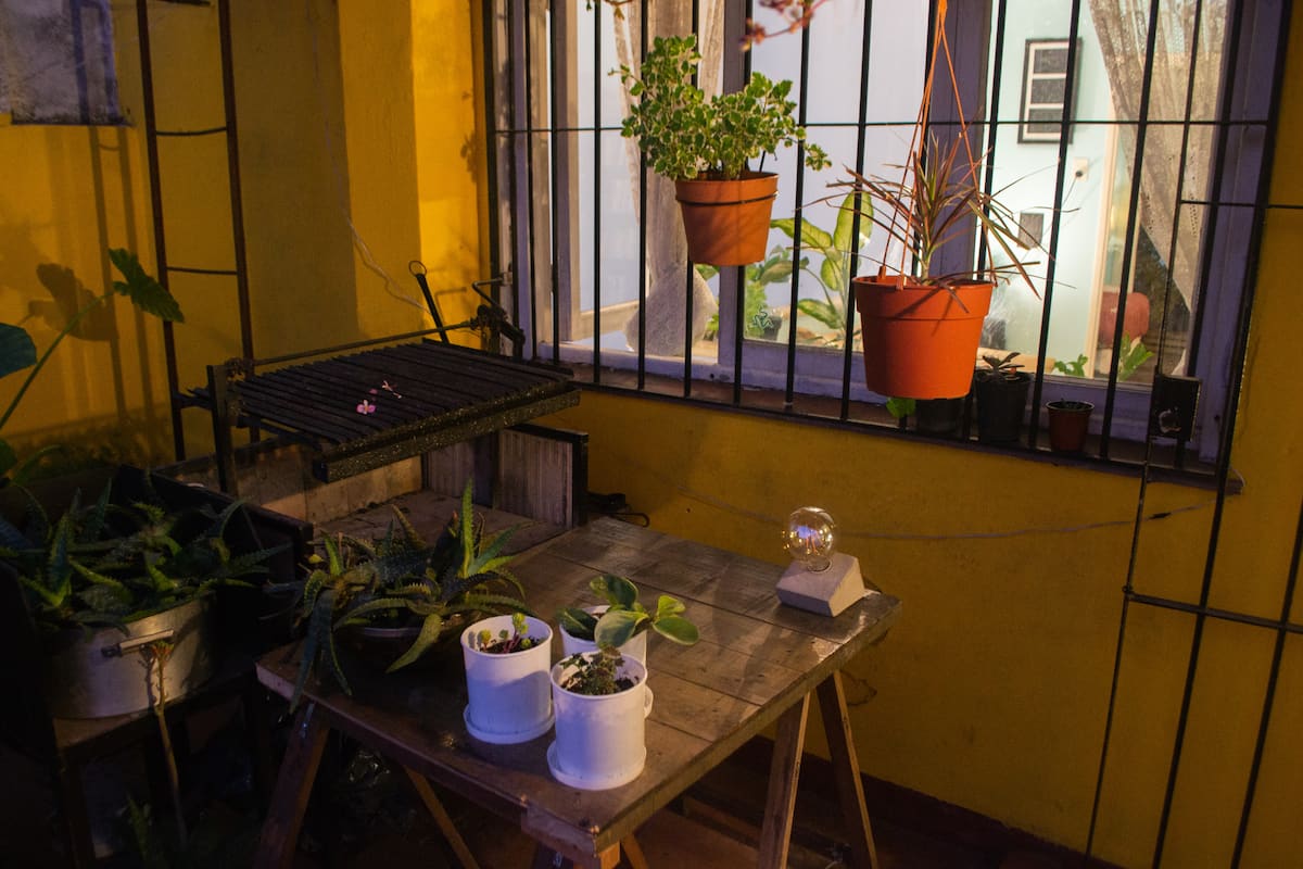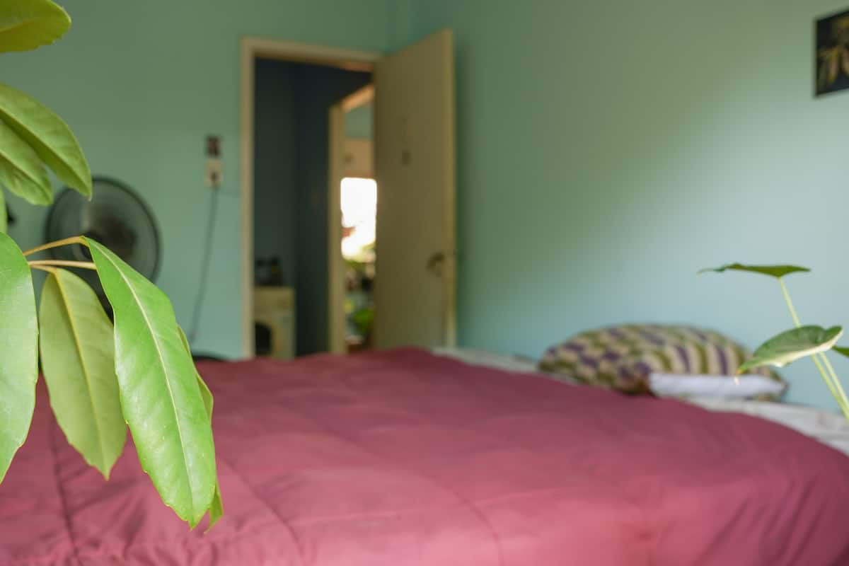 Habitación en PH de 3 ambientes en Nueva Pompeya, en 1er piso, con patio y balcón. El espacio se integra a un departamento compartido con baño, living, cocina, terraza y áreas comunes. La habitación incluye separador tipo biblioteca con placard, ventilador, escritorio, mesa, lámpara y cama de 2 plazas (1,40x1,90), con llave propia.
