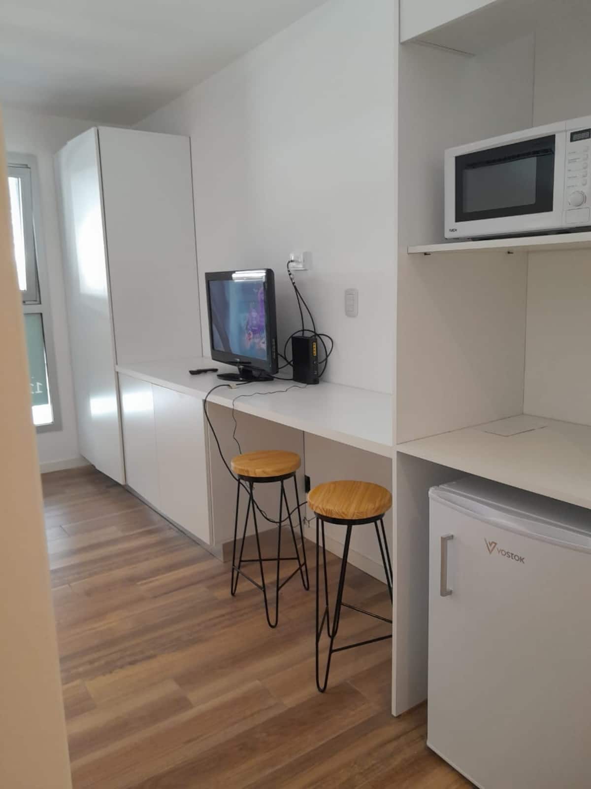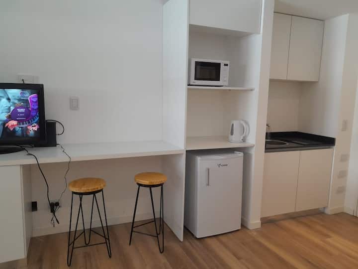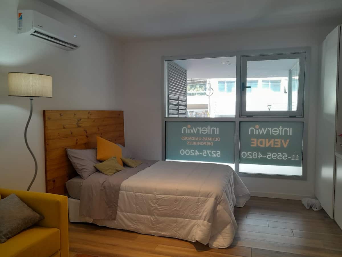 Departamento de 2 ambientes con 1 dormitorio en Palermo. Cuenta con ambiente con gran ventanal al frente, cocina integrada con muebles, anafe de 2 hornallas y cocina eléctrica. Baño con vanitory y ducha, pisos de porcelanato y luminarias completas; incluye Wi Fi y expensas incluidas. El check-in es de 15 a 17 h y el check-out de 9 a 11 h; fuera de ese horario se abona U$S15.