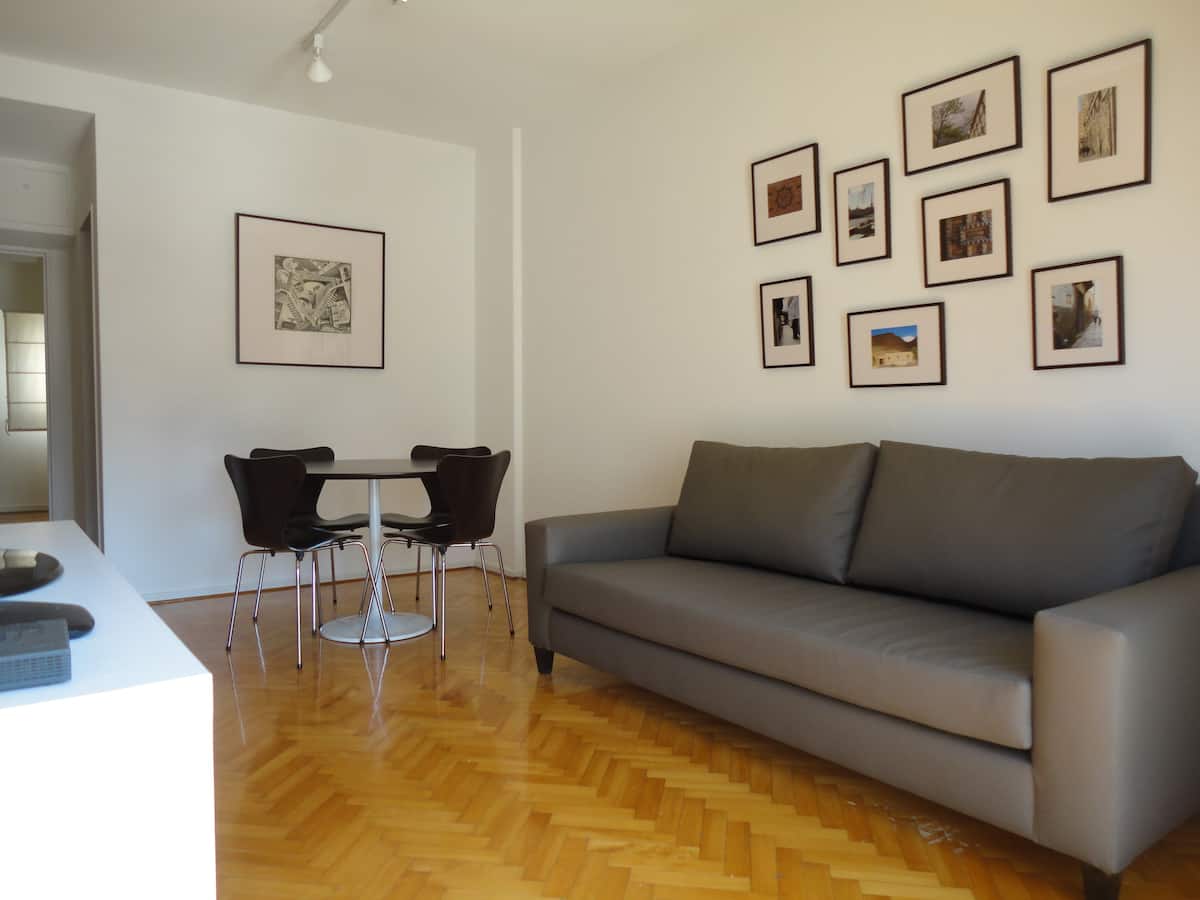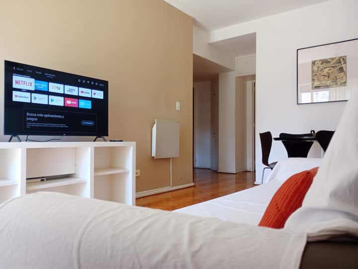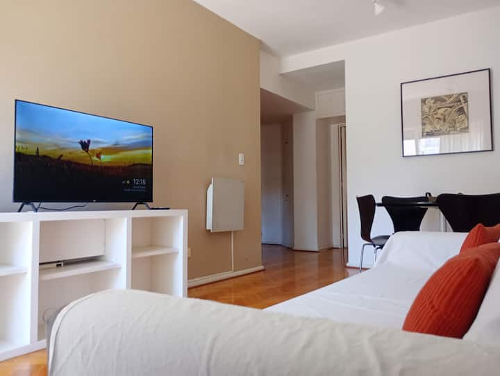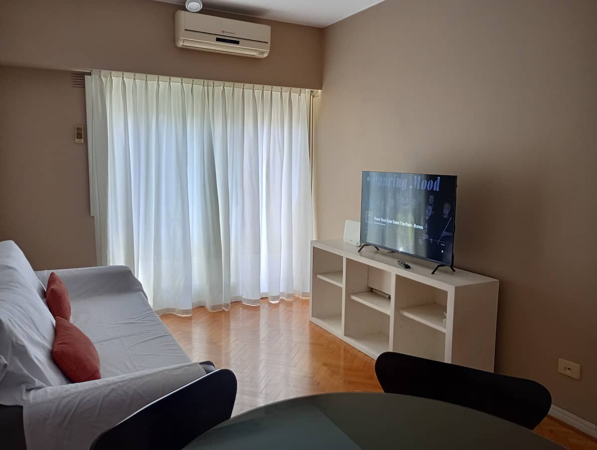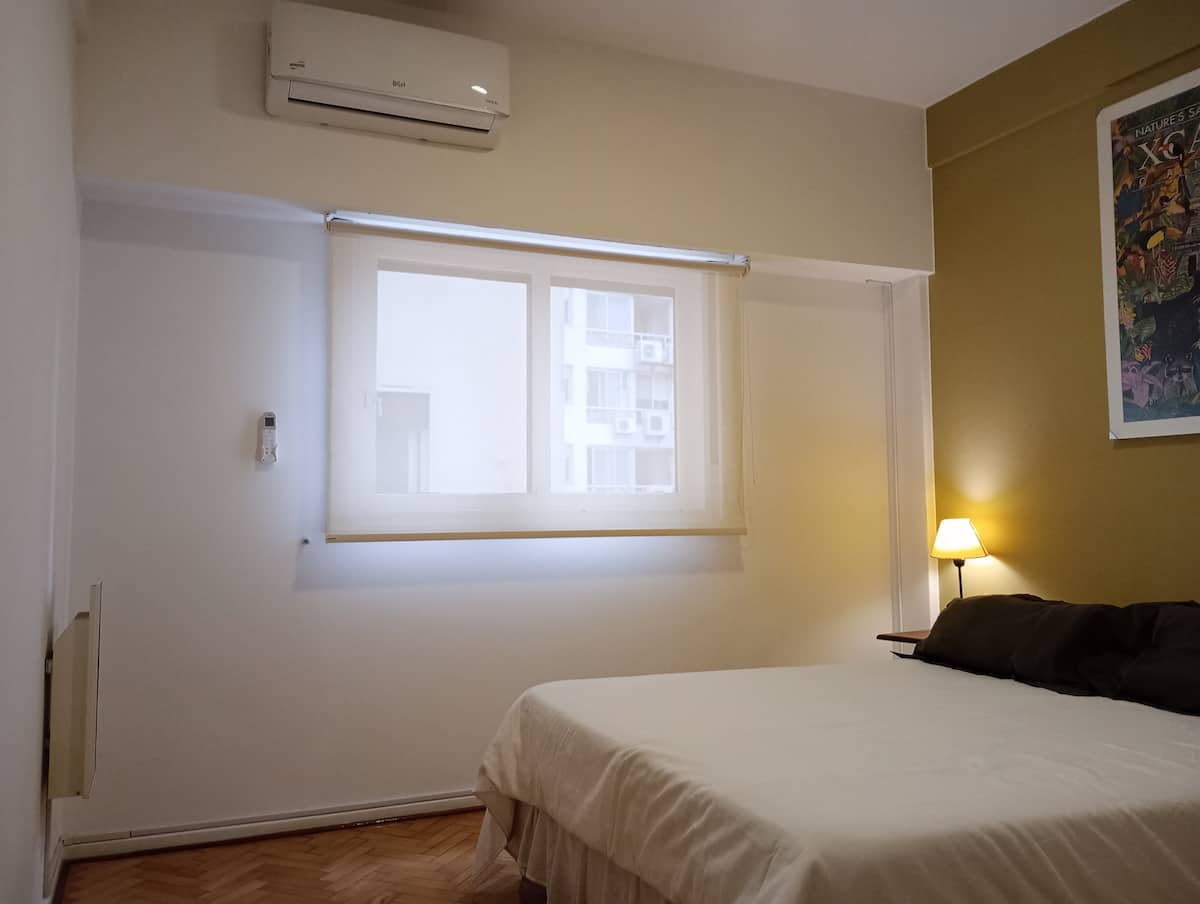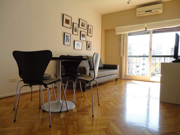 Departamento de 2 ambientes en Palermo. Cuenta con balcón y vista abierta. Incluye cocina, living-comedor y dormitorio, WiFi 300 Mb y TV por cable, además de lavarropas y aire acondicionado y calefacción en cada ambiente.